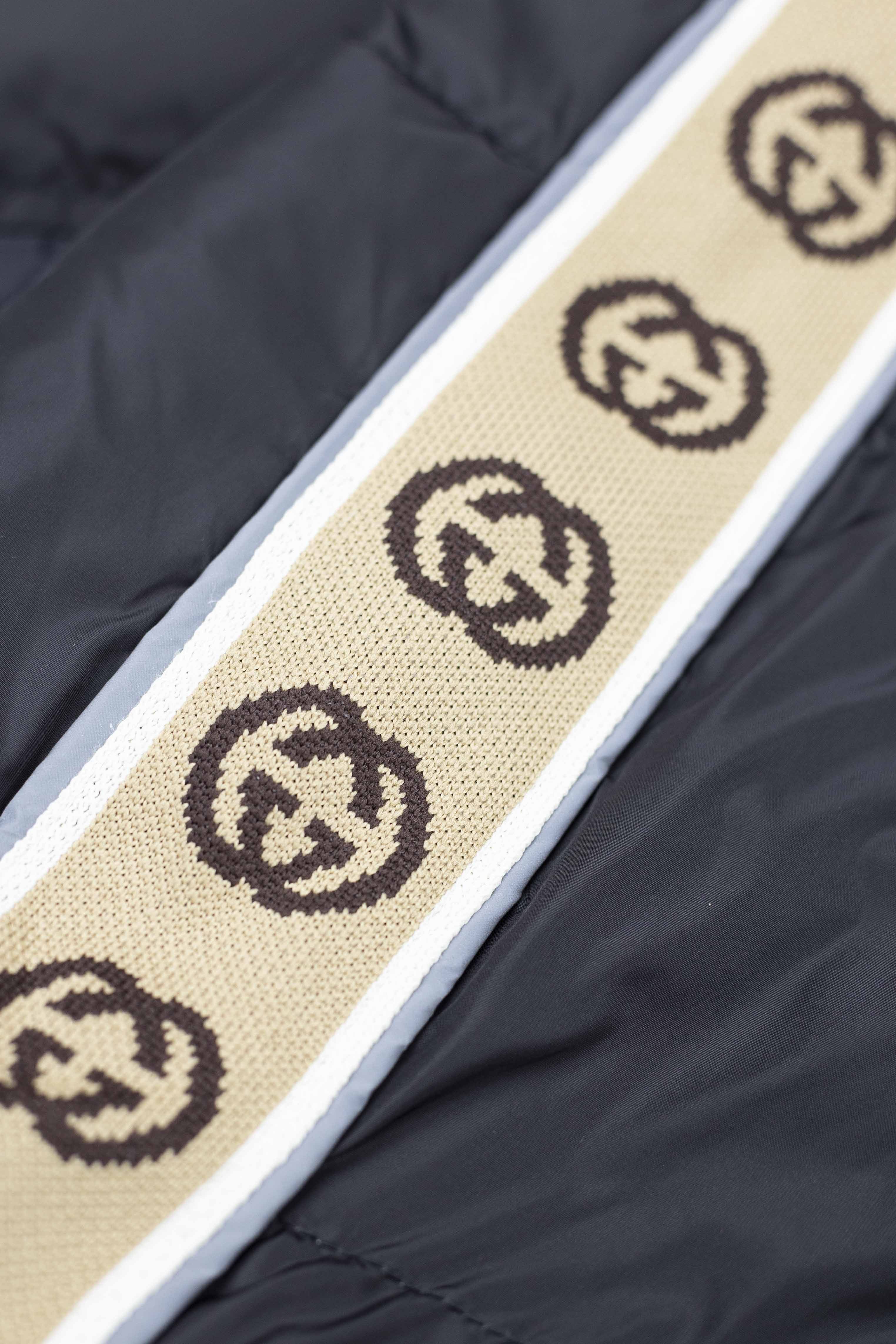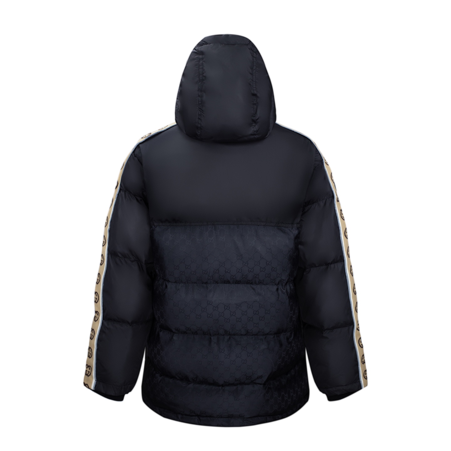 P385 款号:【Y105】 Gucci/古驰反光织带羽绒服 男女同款GG织带新元素暗双G 黑色立领羽绒大衣,采用尼龙塔夫绸绗缝设计,衣身缀有同色徽标。可拆卸式抽绳兜帽,正面隐藏式双向拉链,按扣前襟,腰部贴边袋。填充: 90%鹅绒,10% 羽毛 尺码:M L XL XXL 颜色:黑