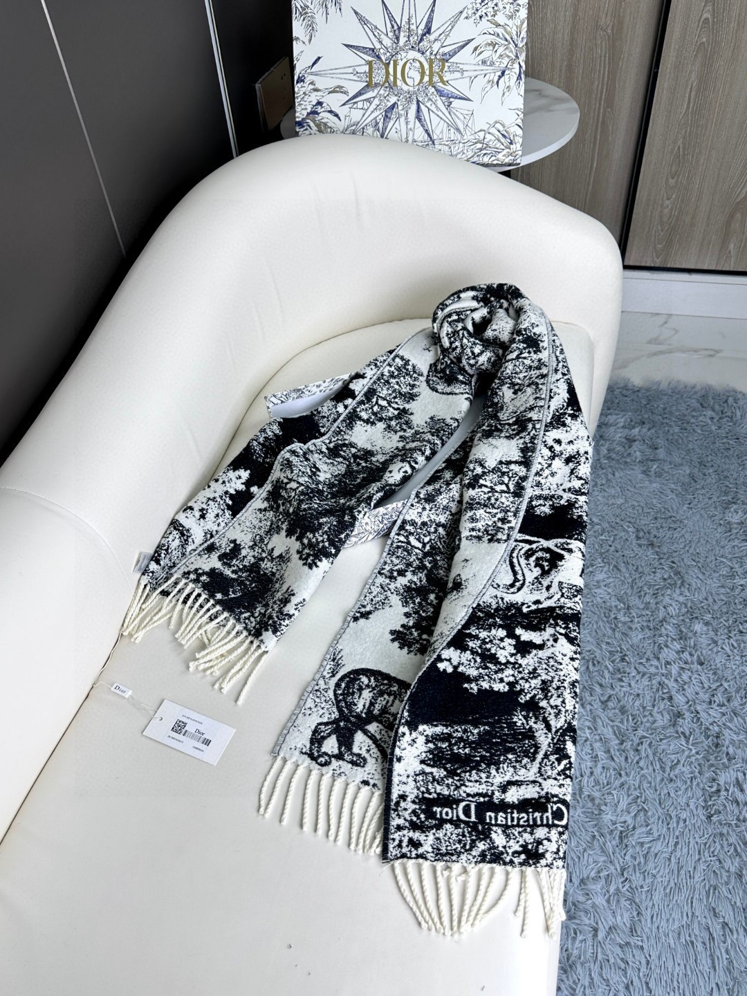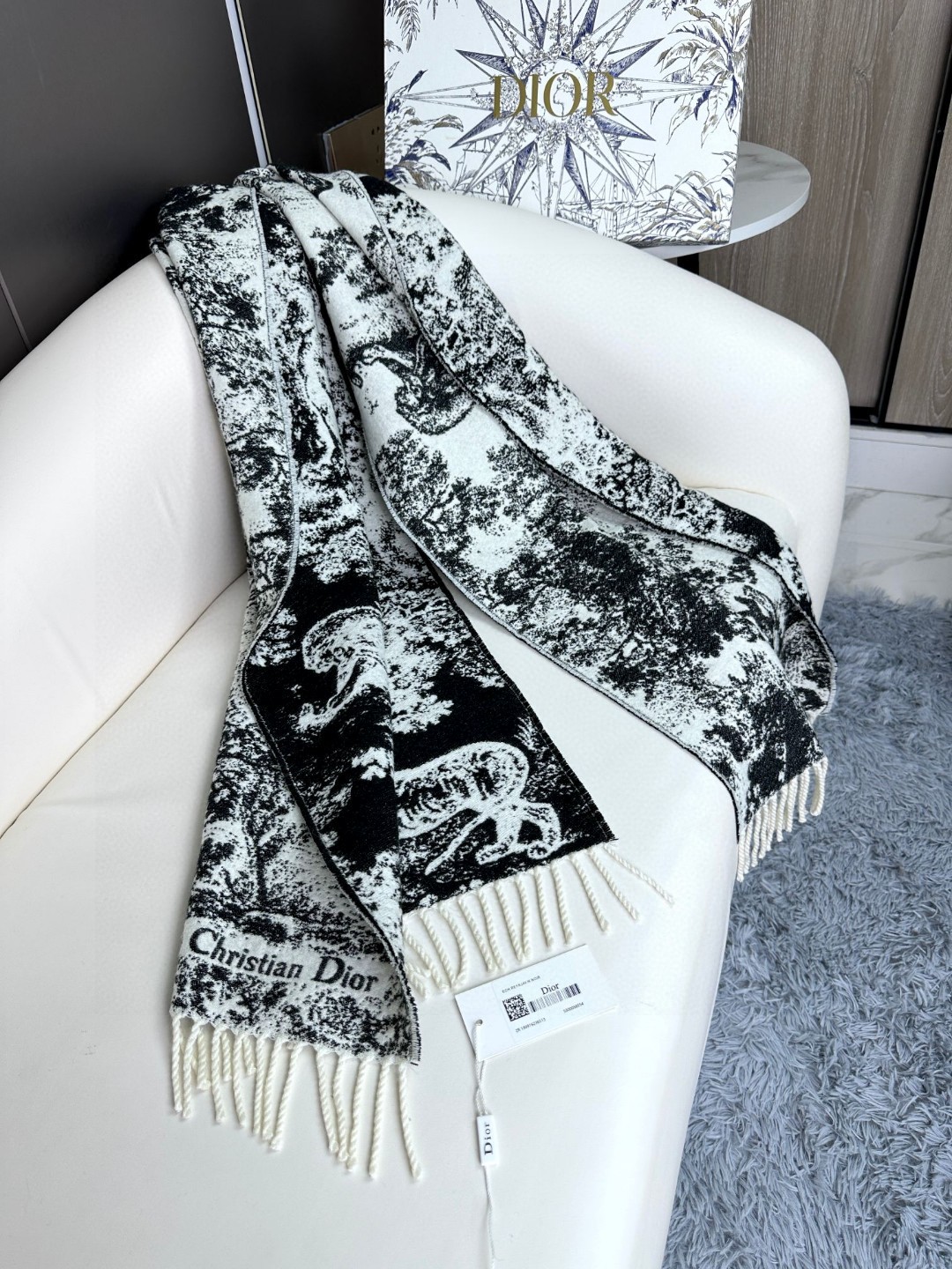 🉐️150 上新.2025年迪奥最新款到货! 这款Sauvage 茹伊印花围巾全新演绎 Dior 经典图案。采用山羊绒和羊毛混纺面料精心制作,饰以流苏饰边和 Christian Dior 标志。长款设计,可系在颈部或披在肩部。 海军蓝色 Sauvage 茹伊印花图案 Christian Dior 标志 流苏饰边 59% 山羊绒,41% 羊毛 意大利制造