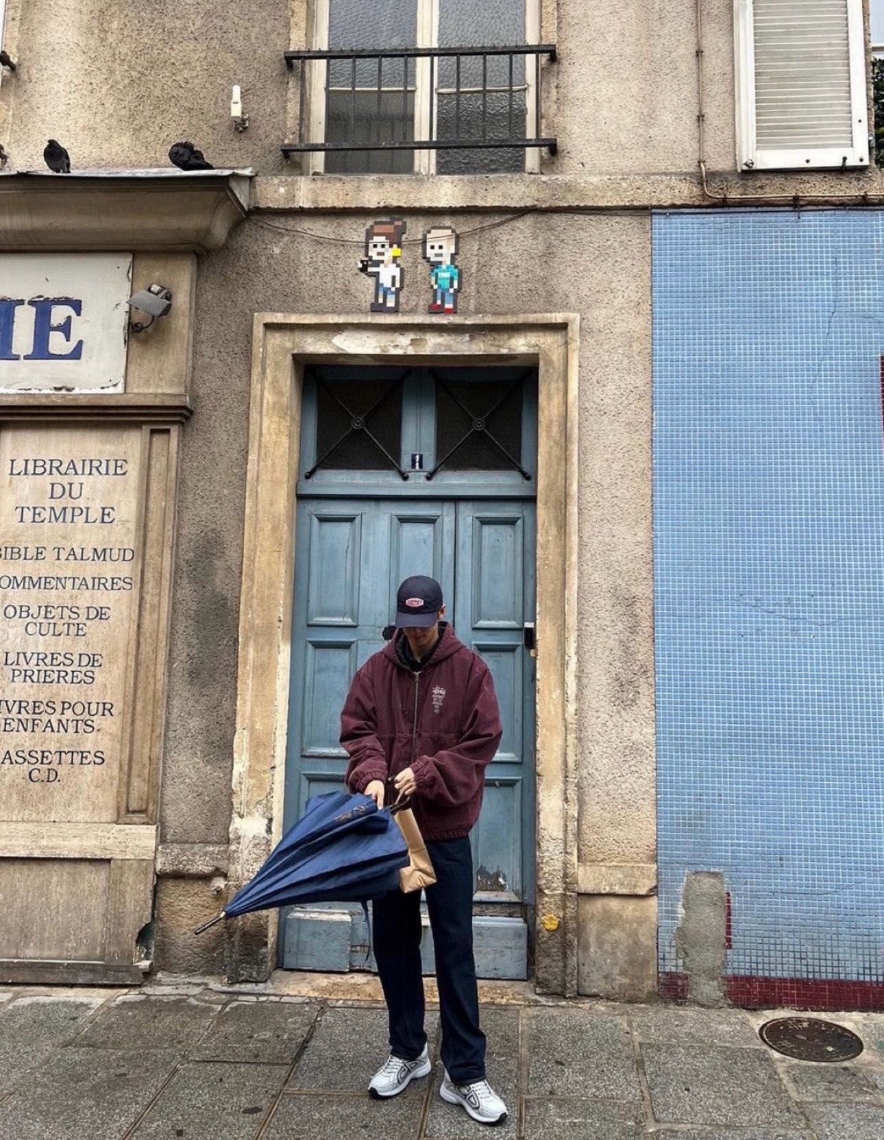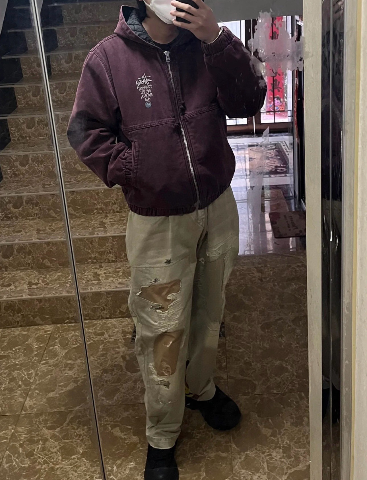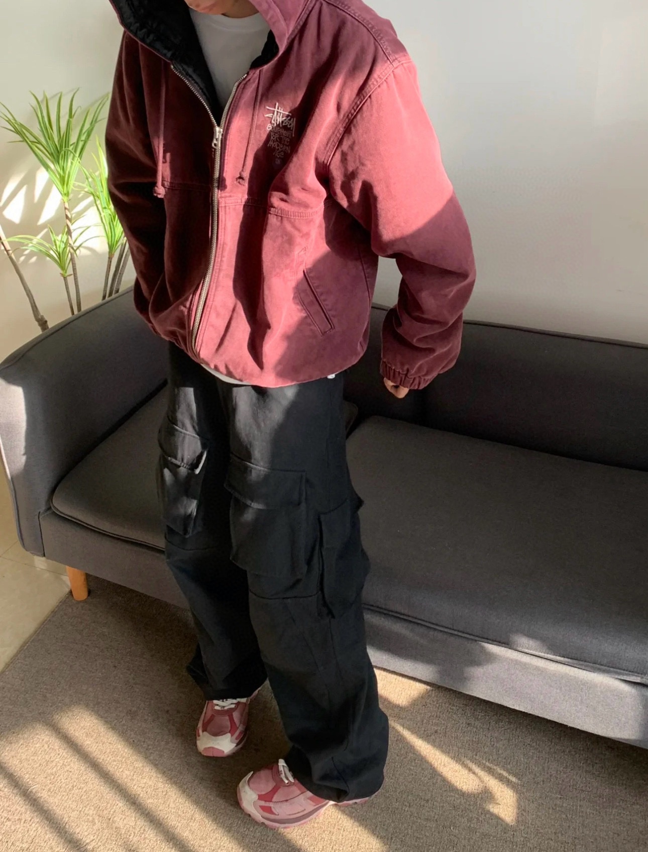 Stussy斯图西 水洗做旧字母刺绣黑8 连帽棉服外套 酒红上身效果#