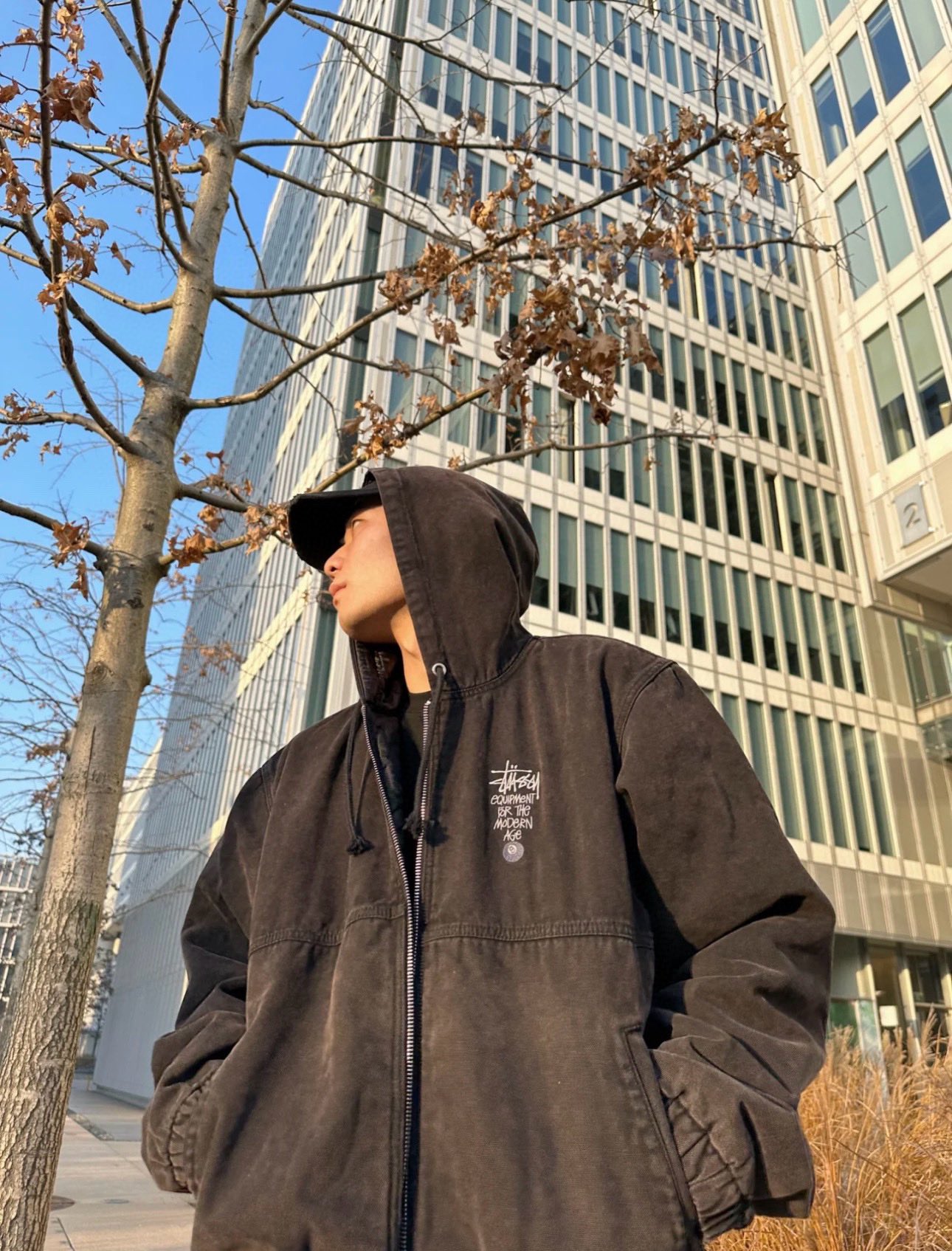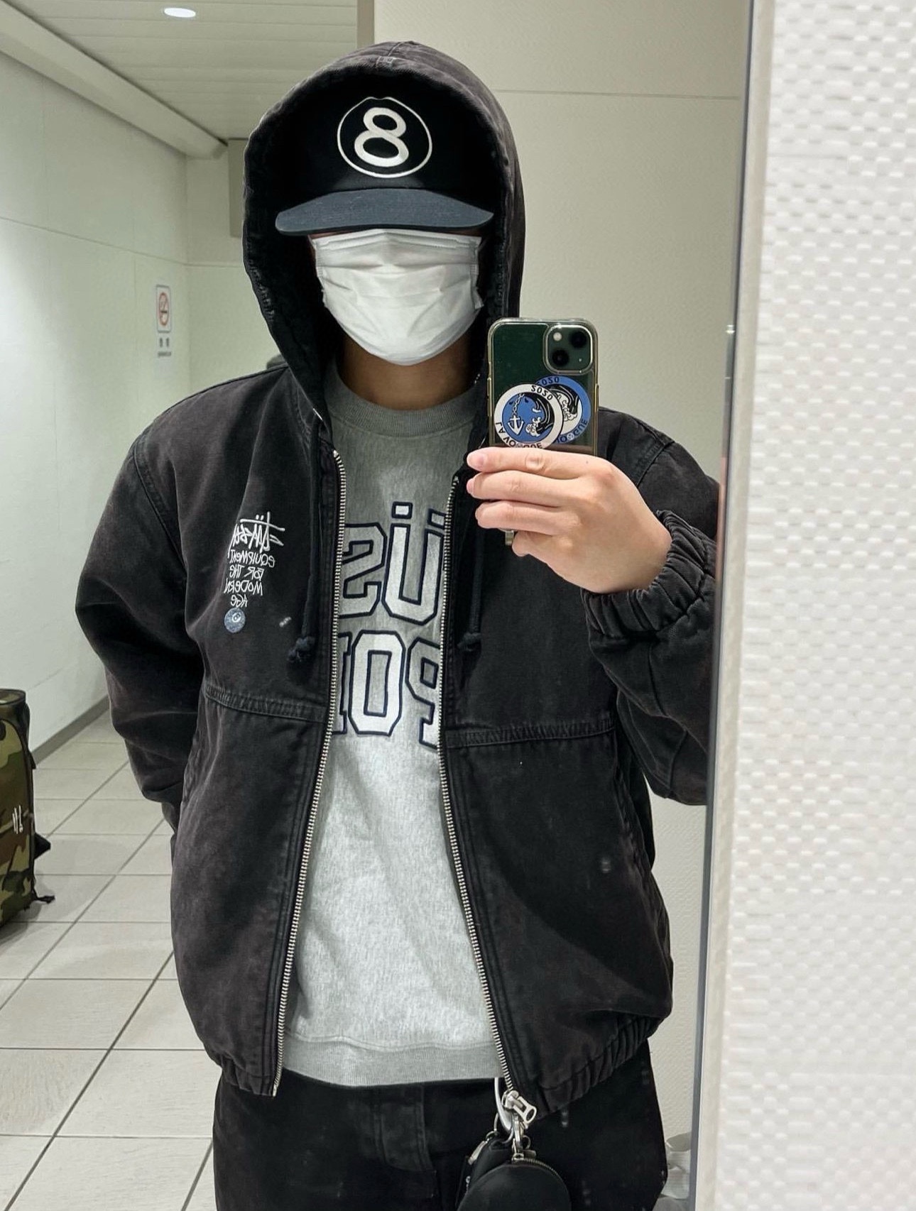 Stussy斯图西 水洗做旧字母刺绣黑8 连帽棉服外套 黑色上身效果#