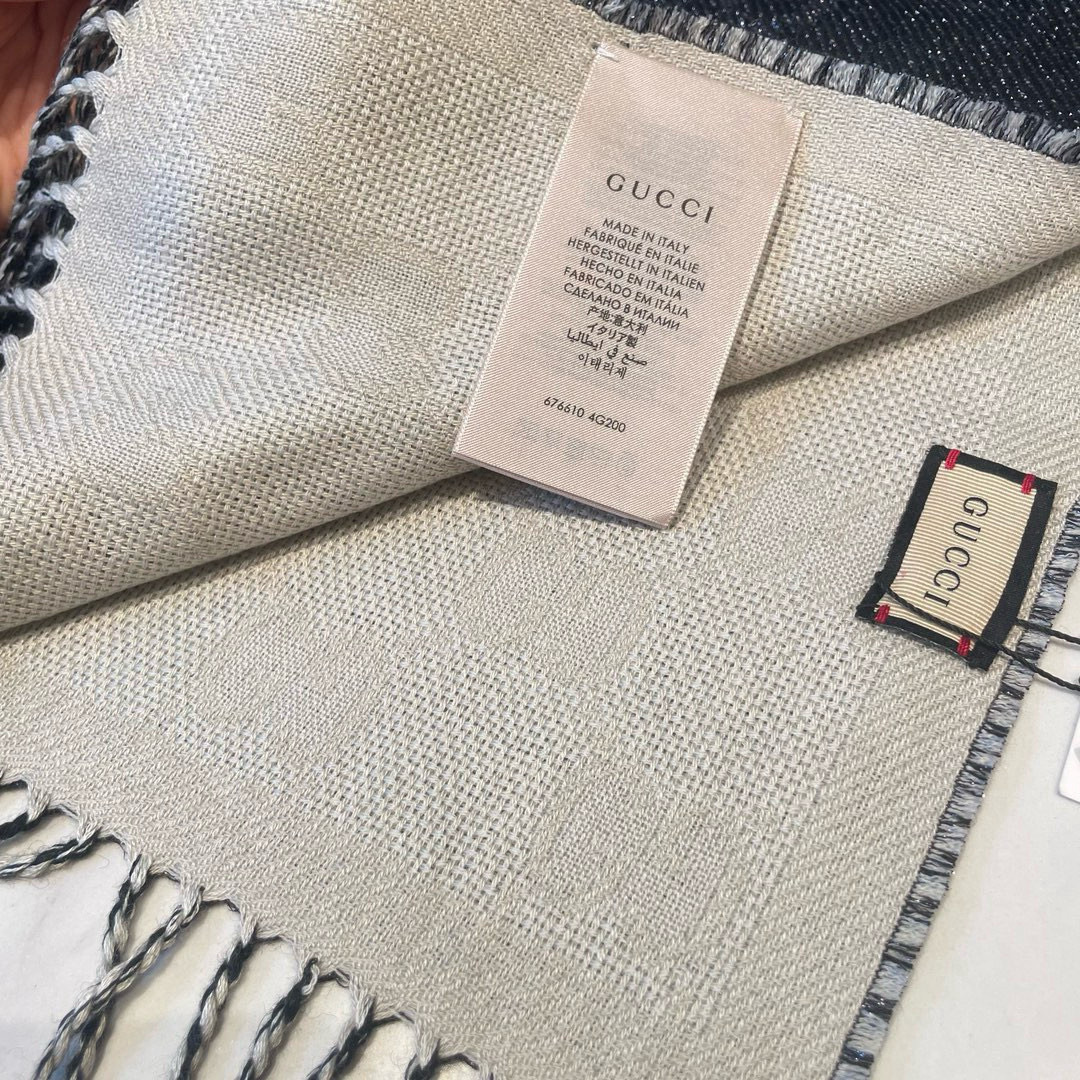 P140 🆕GG品牌标志性元素不断推出妙趣横生的设计,以现代手法令经典单品呈现出时光沉淀的优雅美感。别致的GG图案以提花细节的形式呈现在这款黑色和米色羊毛围巾上,饰以流苏滚边,尽显浪漫典雅气息。 黑色和米色GG羊毛提花 流苏滚边 34厘米(宽)x 194厘米(长) 主要织物: 86% 羊毛 11% 粘胶纤维 3% 金属镀膜纤维