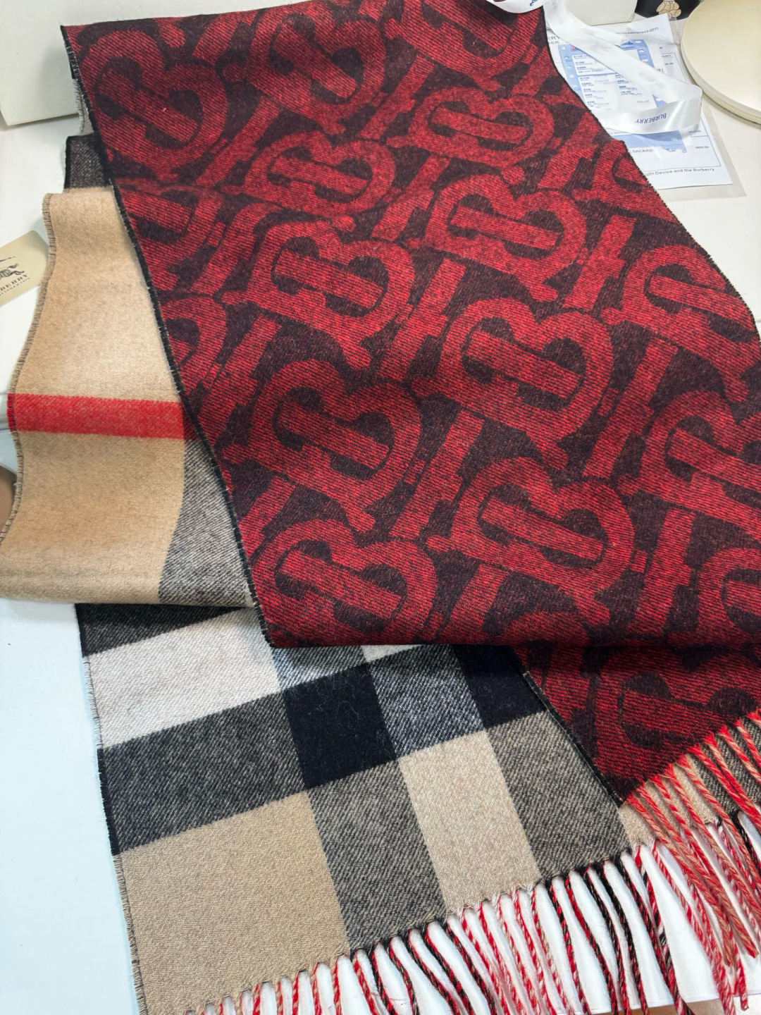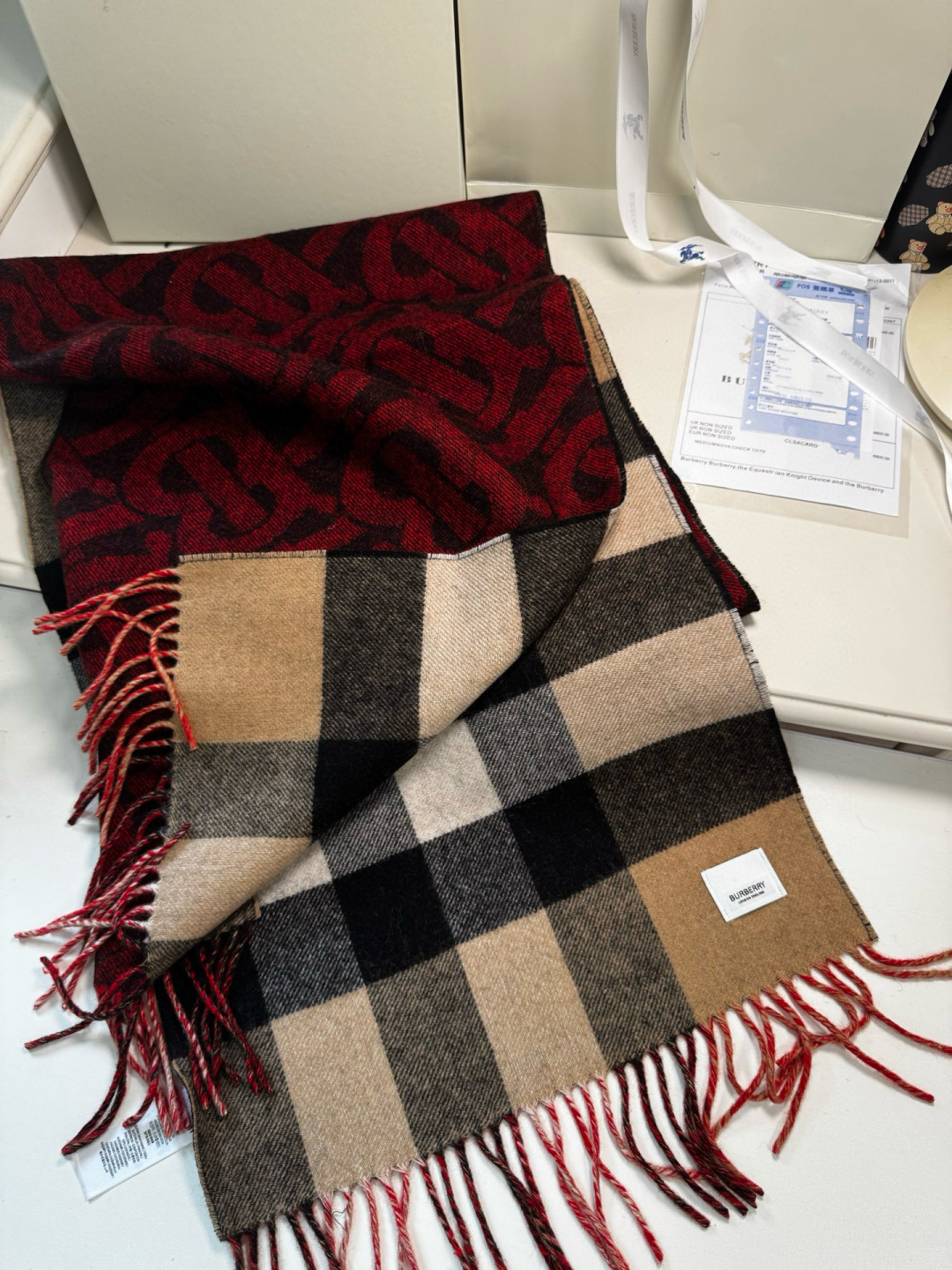 P160 🆕❗️高版合股纱 · 法国的外贸订单 ❗️Bur经典款TB典藏款系列❗️提花精纺羊绒围巾,产自苏格兰工坊,装饰格纹拼品牌专属标识图案。面料在苏格兰高地清泉水中浸泡涤荡,再采用起绒草拉绒工艺,悉心打造出柔软触感❗️ 200 x 36cm 100%羔绒 长方形 两端流苏装饰 专业干洗 苏格兰制