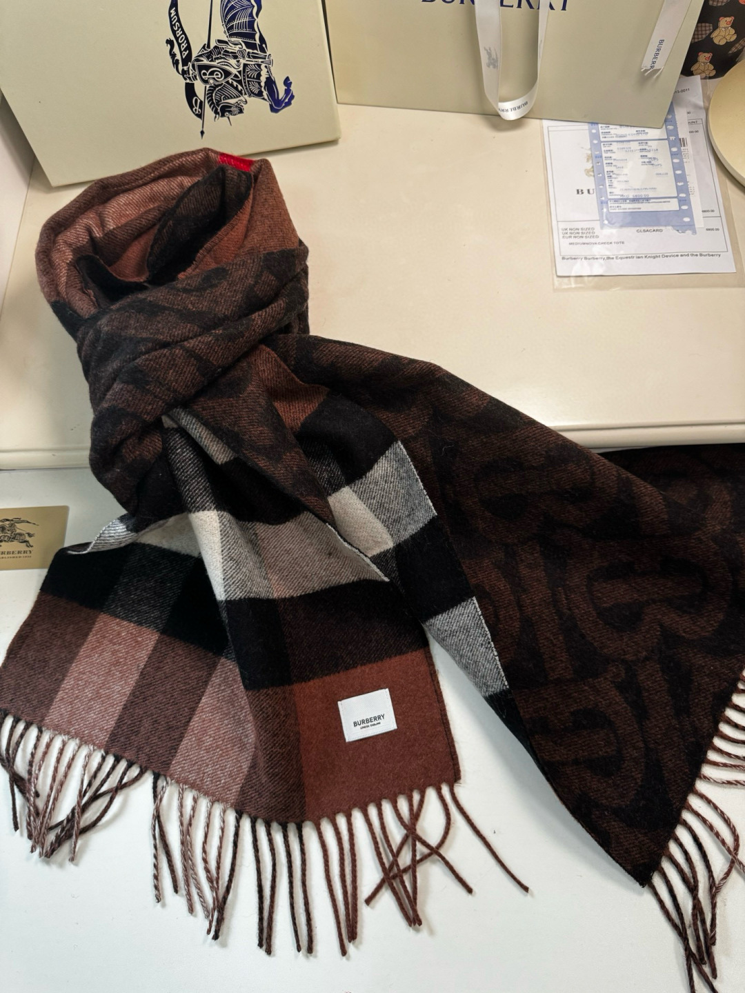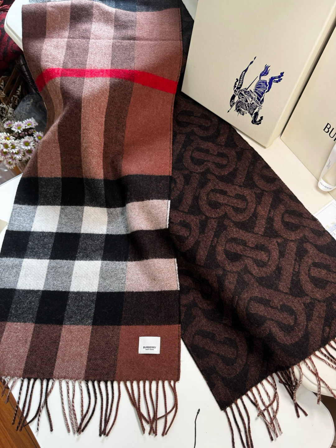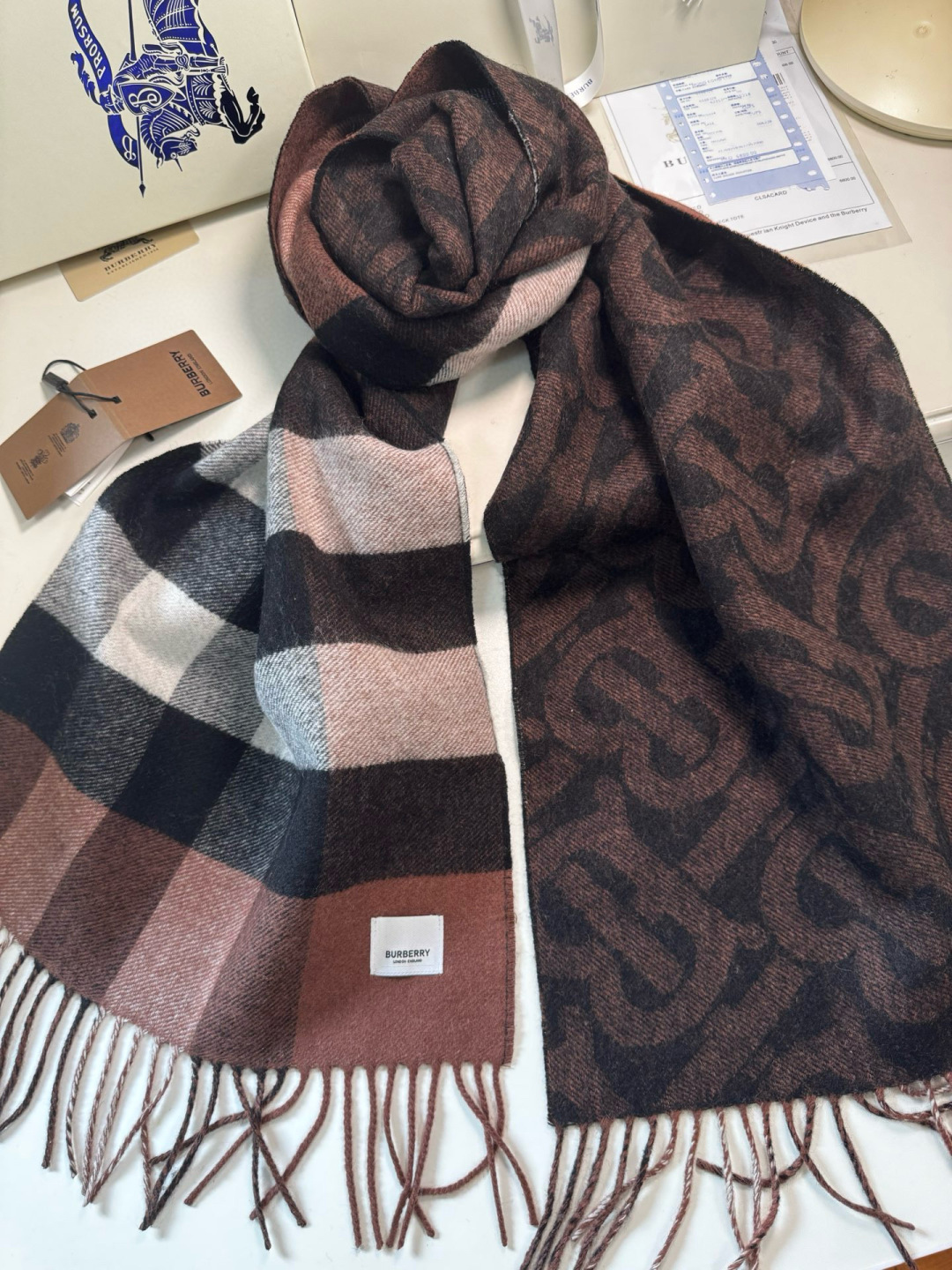 P160 🆕❗️高版合股纱 · 法国的外贸订单 ❗️Bur经典款TB典藏款系列❗️提花精纺羊绒围巾,产自苏格兰工坊,装饰格纹拼品牌专属标识图案。面料在苏格兰高地清泉水中浸泡涤荡,再采用起绒草拉绒工艺,悉心打造出柔软触感❗️ 200 x 36cm 100%羔绒 长方形 两端流苏装饰 专业干洗 苏格兰制