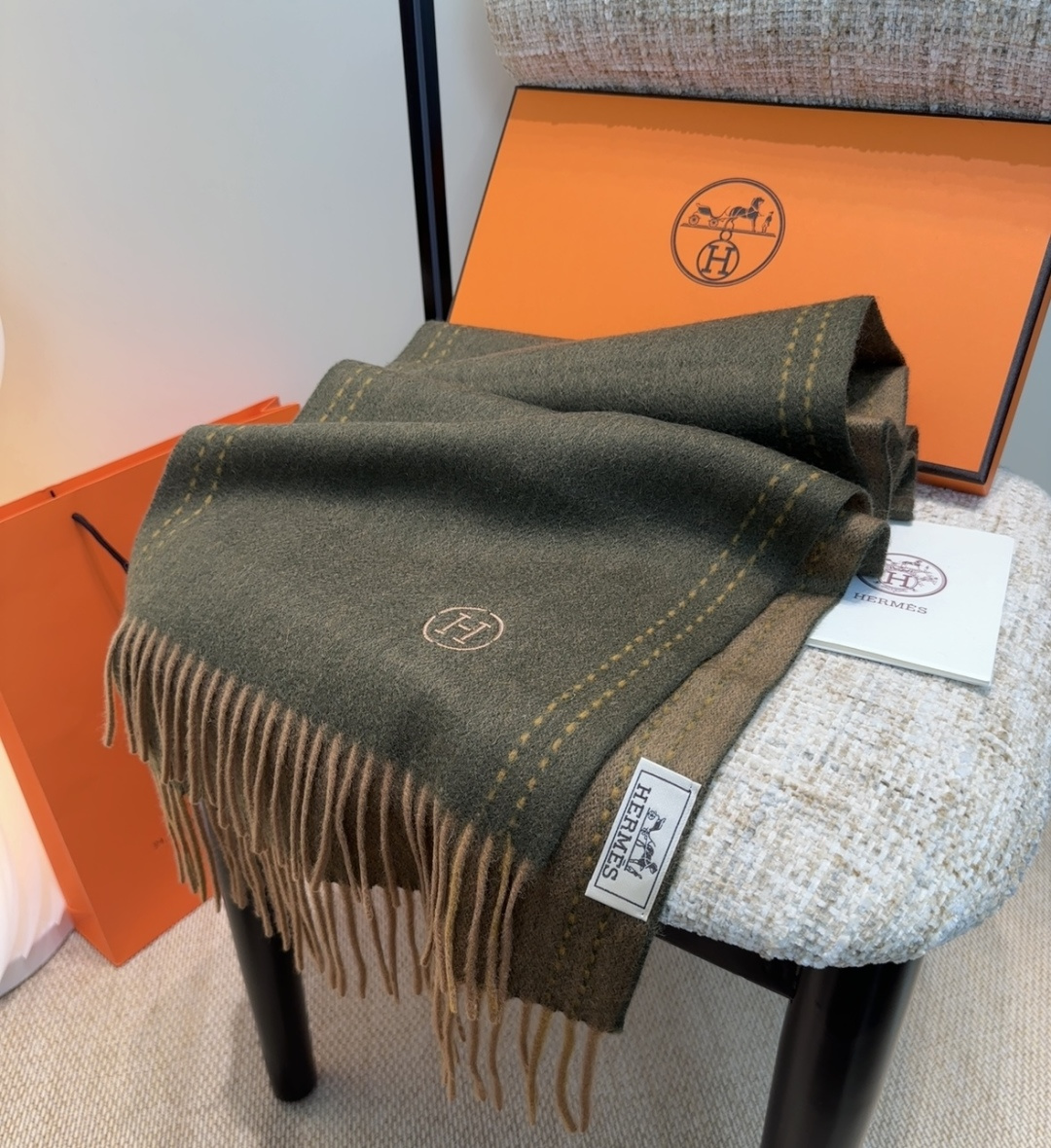 P130 2025年Hermes · 爱马仕,难得一见的温柔配色,低调又不失优雅❗️】重点推荐❗️双边配色,一条围巾两种风格搭配,高级舒适时髦气质,大牌范十足,超级安利❗️大H这款触动内心的柔美围巾,极其简单的颜色搭配低调的H刺绣logo,点睛之笔确又不失美感,成功人士的追求,色彩绝对💯,有点独有的仙气,绝对的情侣款不二之选,颜色淡雅,不妖娆❗️规格:35x 190cm❗️❗️