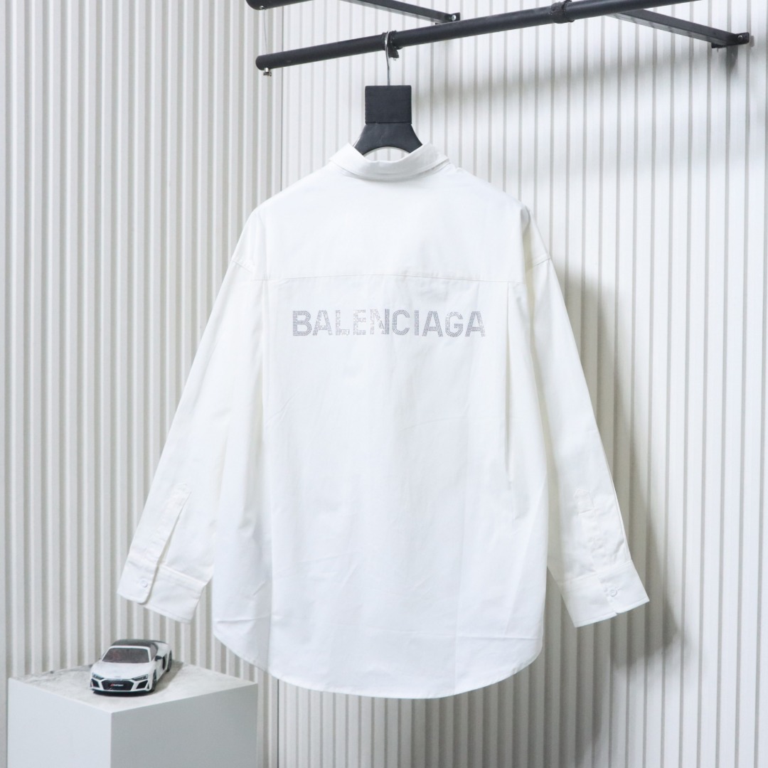 P260 Balenciaga/巴黎世家 经典后背烫钻字母logo长袖衬衫 定制抗皱棉平纹衬衫面料,高温气蹦机压烫,利用热能和压力对布料进行压烫处理,烫朴位均用高温过朴机对布料施加高温和压力,使布料表面平整挺括,面料都经过浇洗,定制闪钻进口珠 Size:XS-L