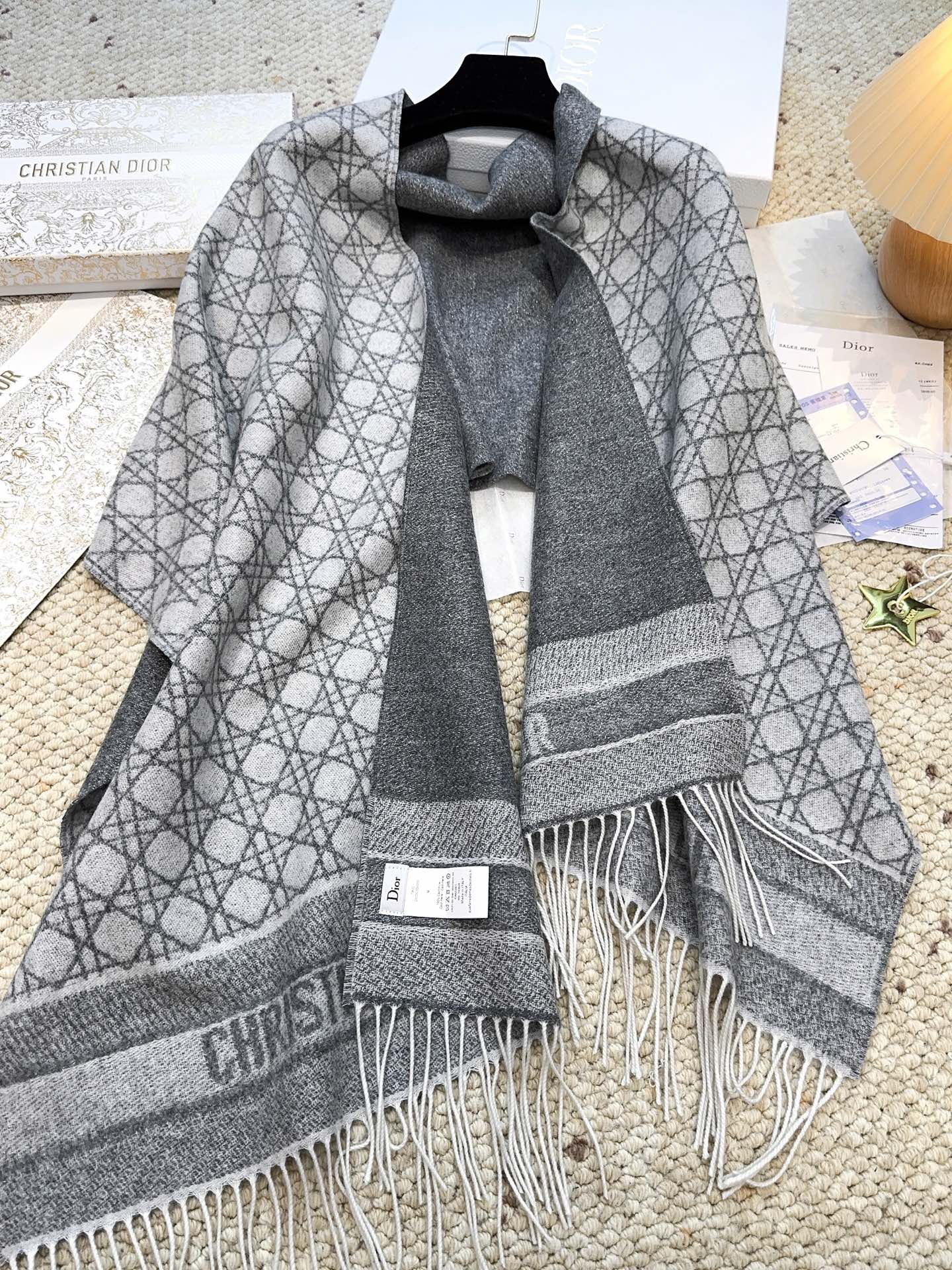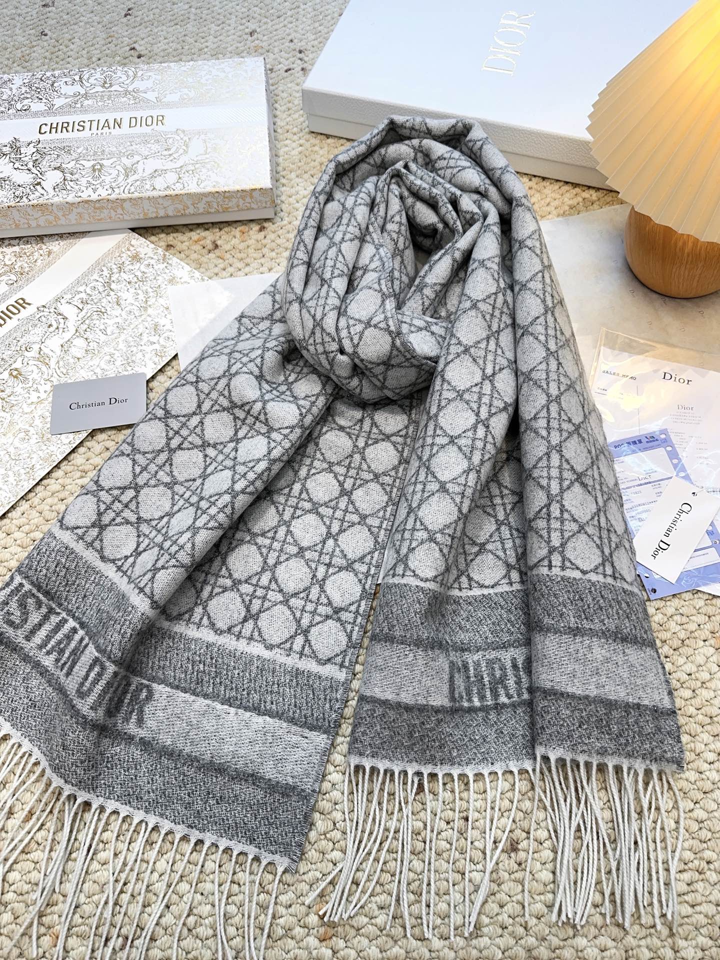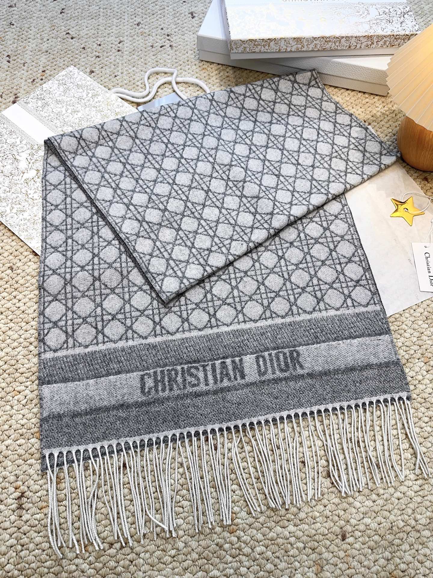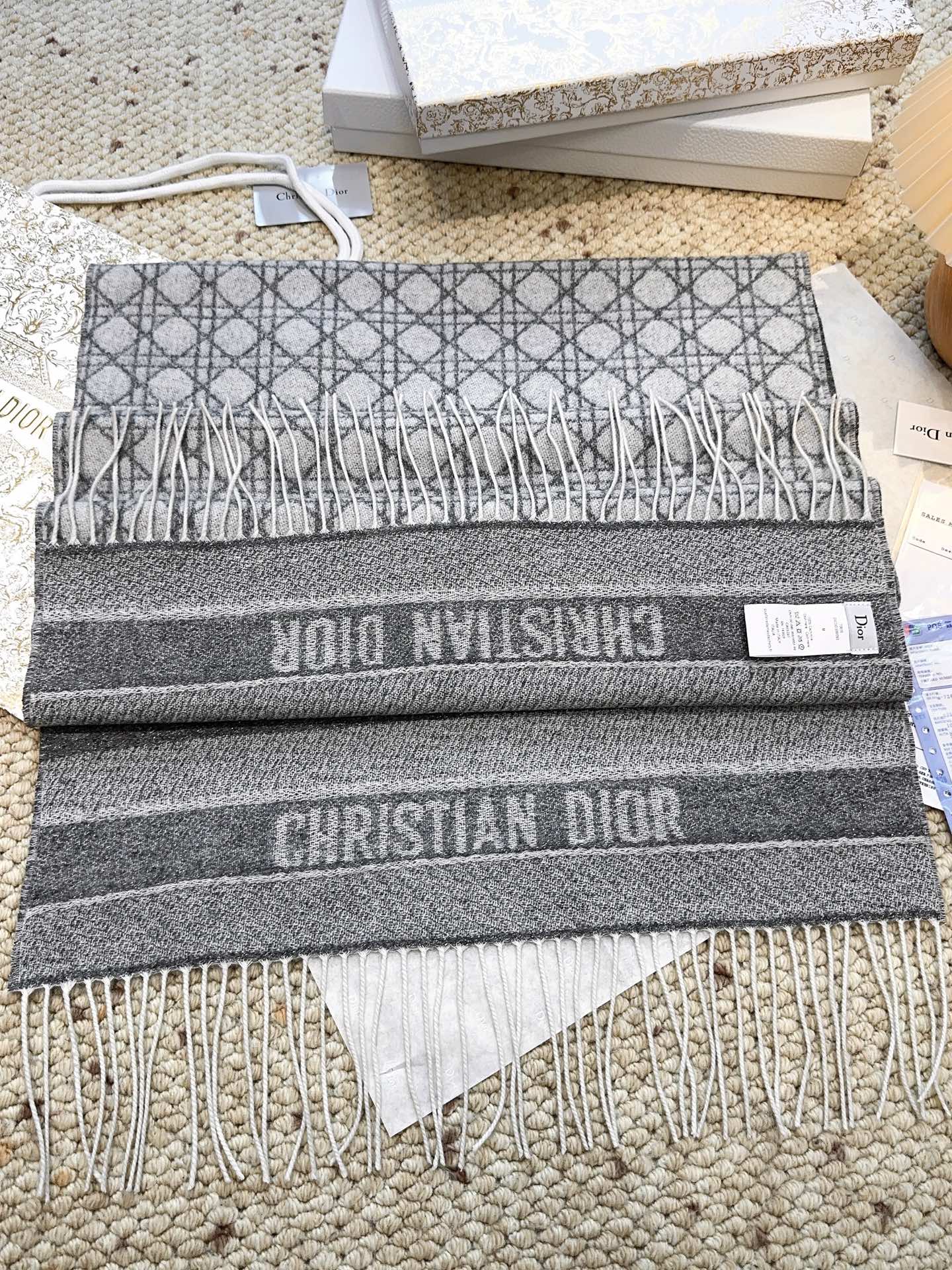 P185【DIOR 迪奥】 (银丝)今年又上新新款藤格纹100%山羊绒围巾啦 绝美配色 爆款专柜最新款式 羊绒 超百搭!超显气质!!大爱😘大爱😘😘 采用克什米尔进口羊绒这么大比重的羊绒真的超级少见!羊绒有世界公认的“软黄金”之称,手感柔软细腻这款围巾超级大,尺寸达到!整体是双面织造的 ,不管是拿来做围巾做披肩 都是不二的选择!