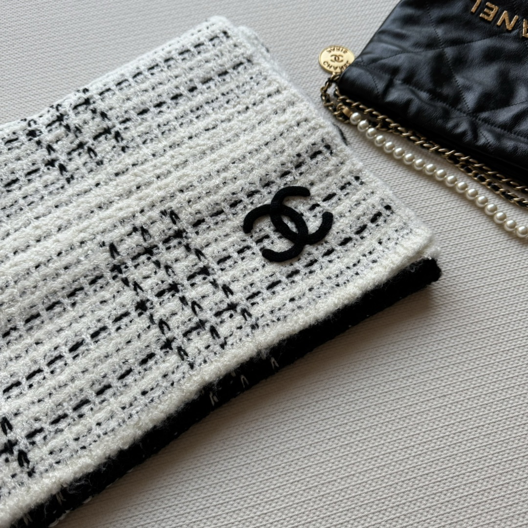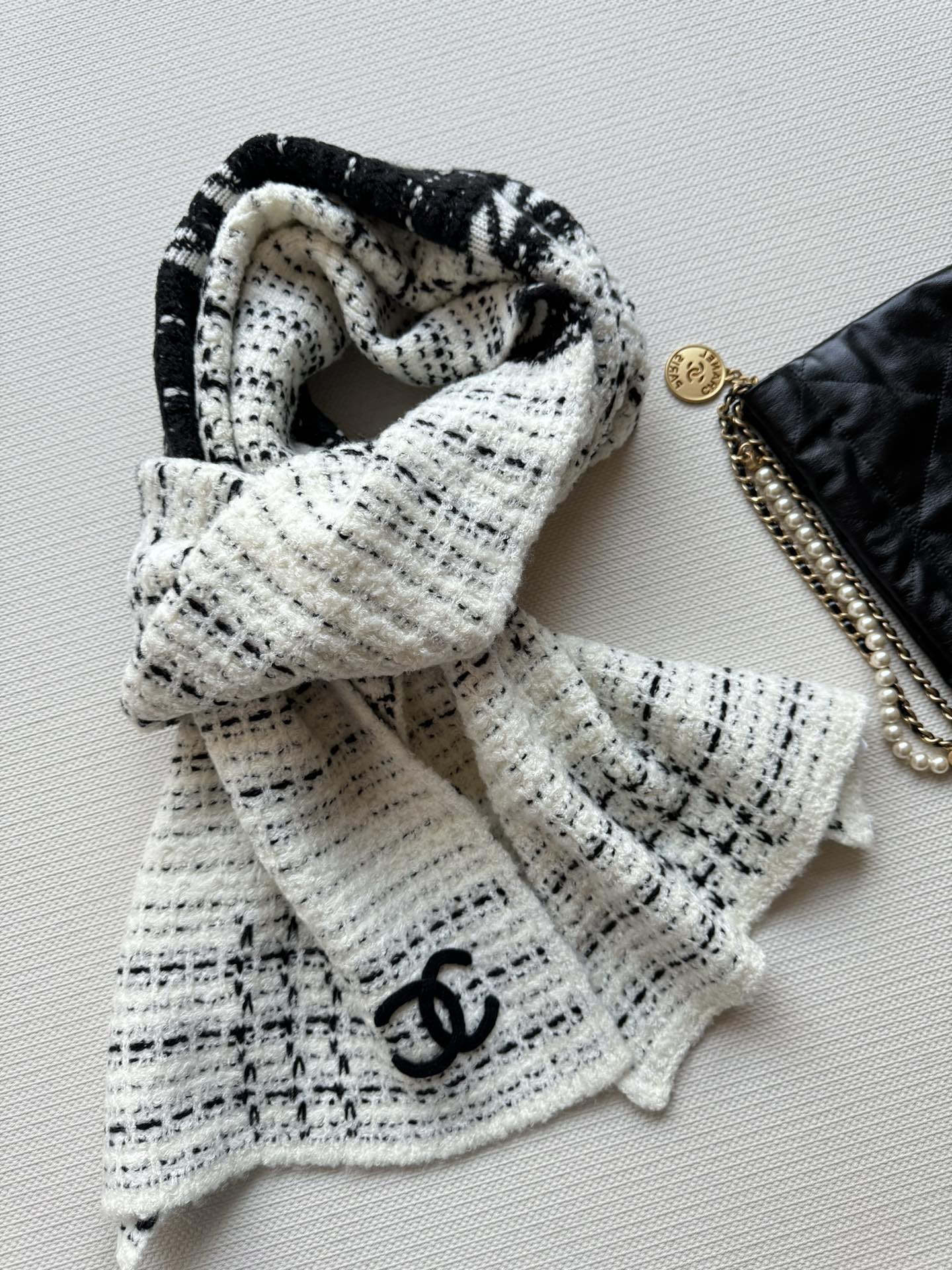 P350 上新!Chanel(香奈儿)拼色格纹围巾 选用羊毛混纺材质 7针拔花工艺,织物表面纹路立体,有层次感,呈凹凸格型纹理,完成织片后,再手工手挑logo 黑白经典配色围巾,尽显高雅气质,随意一围,营造简约时尚感,立刻提升整体造型。