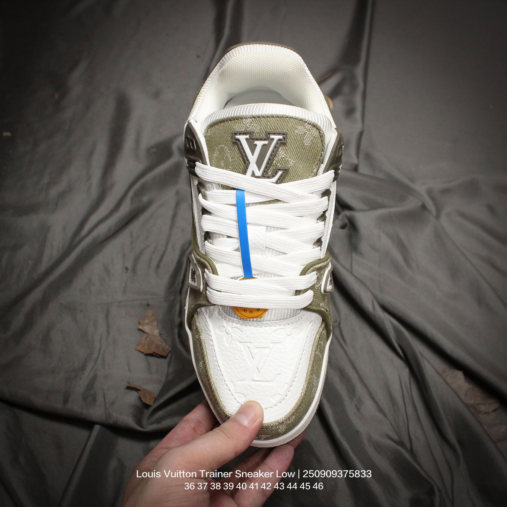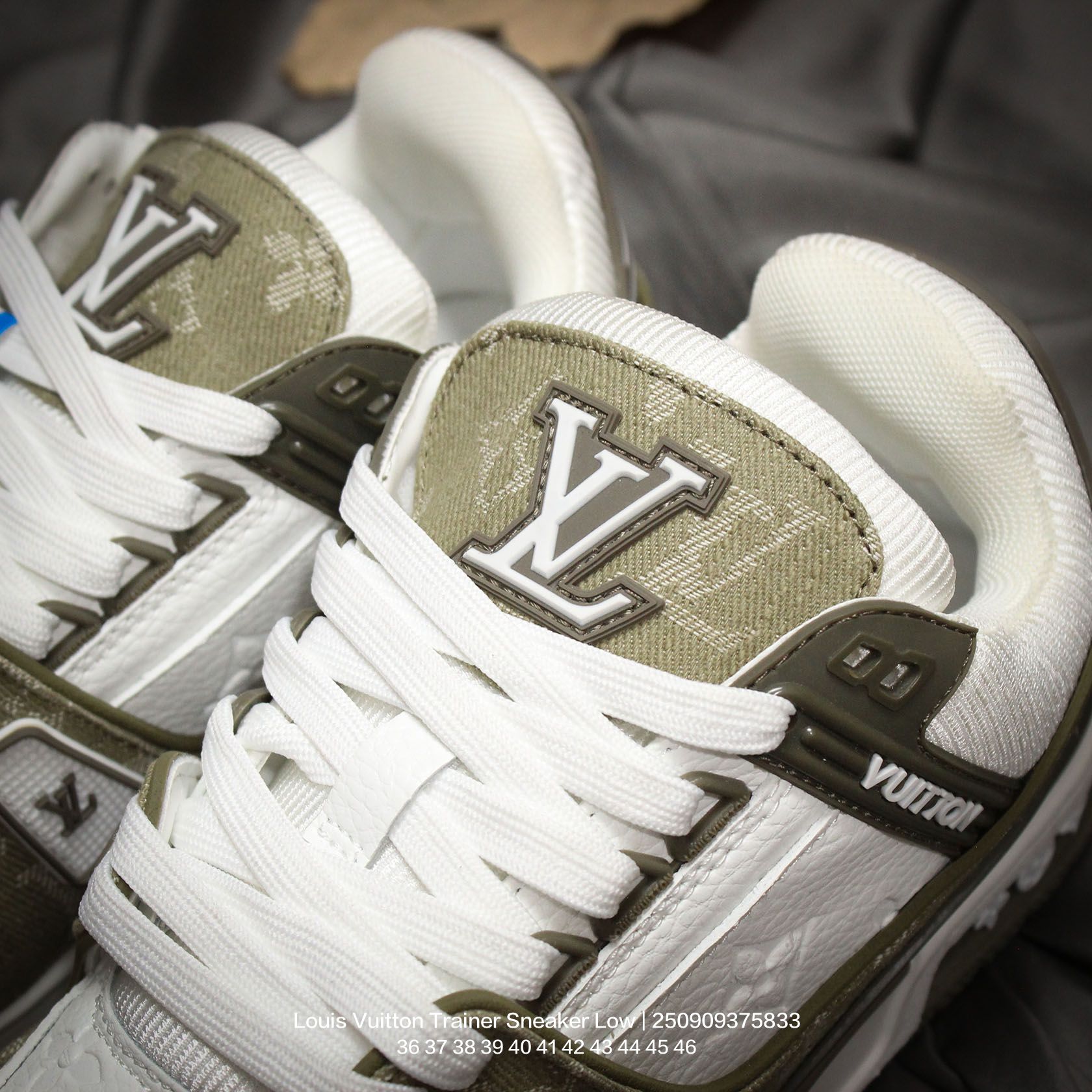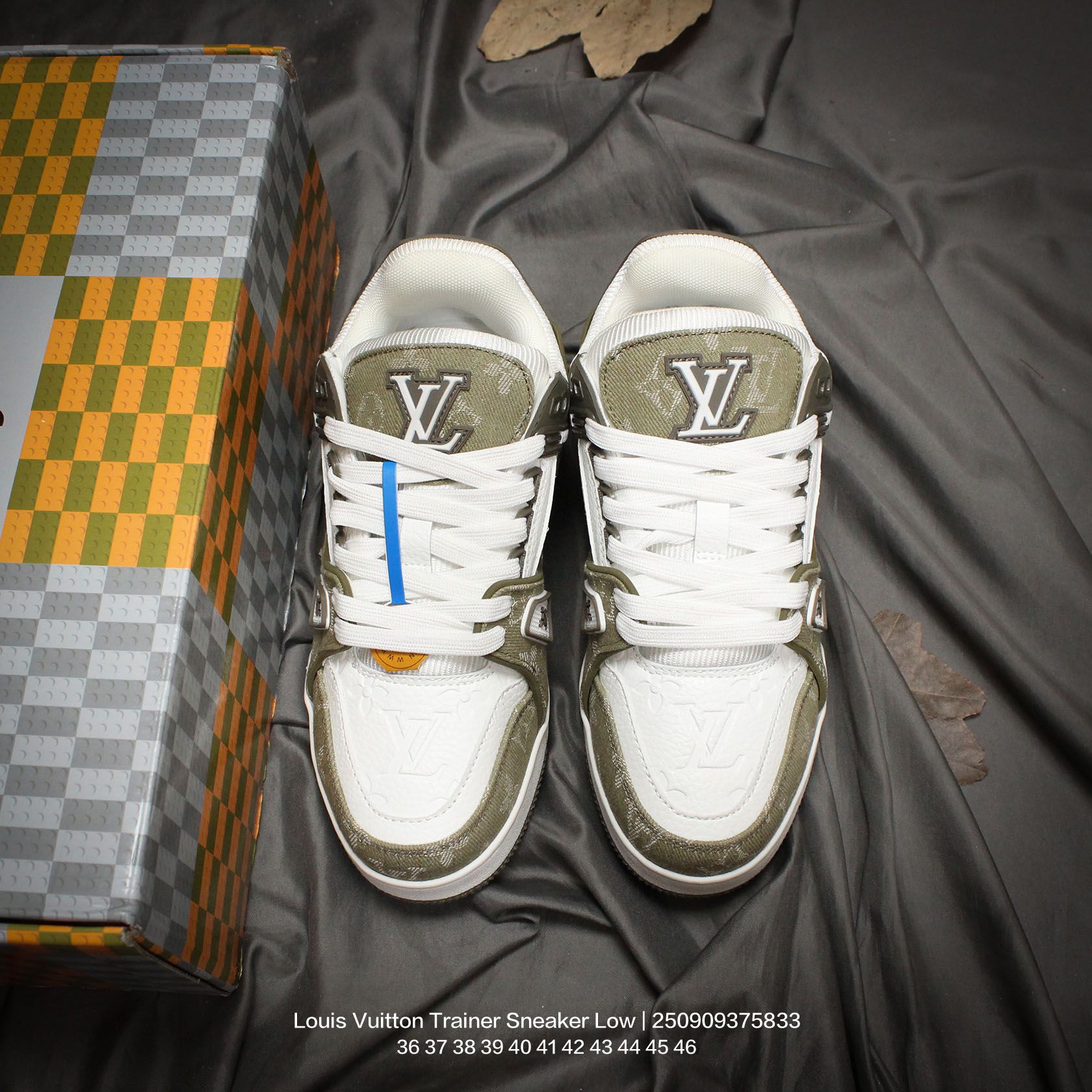 💰160 Louis Vuitton/路易威登 男女鞋配置厚实抽屉礼品鞋盒,采用荔枝纹纤维革组合粒面牛剖革鞋面材质,鞋垫嵌入软脚感EVA物料,外置TPR光泽隔色鞋底❗法国巴黎百年奢侈品牌LV路易威登Louis Vuitton Trainer Sneaker Low 运动系列低帮复古百搭休闲运动文化篮球板鞋“ 类型:男女鞋 码数:36 37 38 39 40 41 42 43 44 45 46 编码:250909375.833