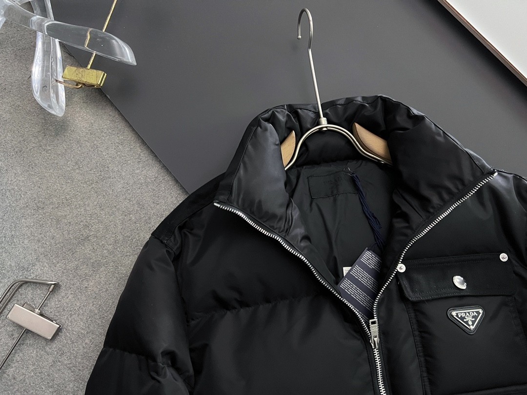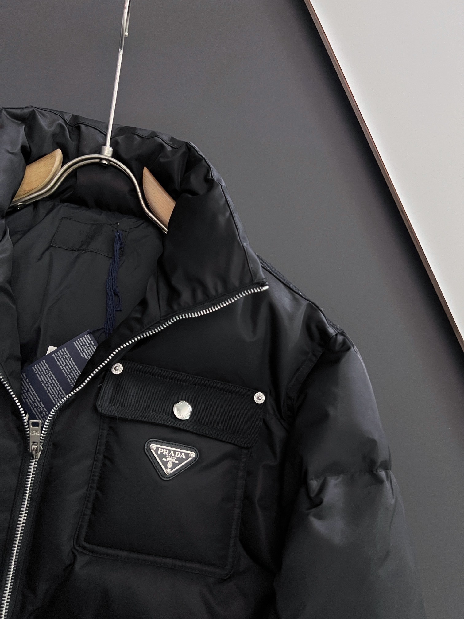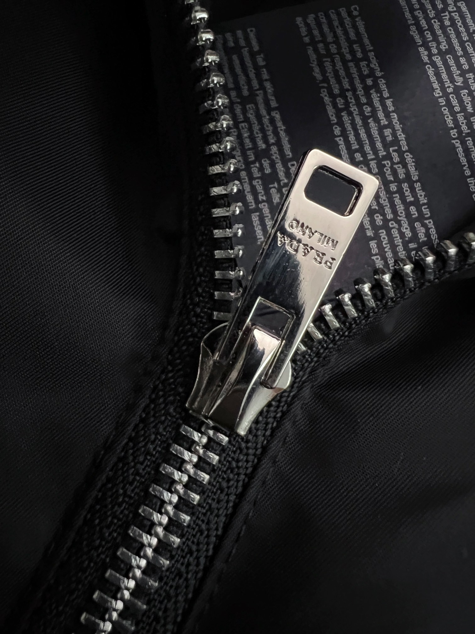P495 Prad*2025春冬新款are-Nylon短款立领棉服夹克,这款Re-Nylon棉服夹克采用宽大廓形和运动风功能性设计。创新再生尼龙面料强化了现代实用主义特性,搭配温暖的填充,饰以涂珐琅三角形金属徽标,直筒衣袖拉链开合,Oversize版型 ,上身效果非常帅气,强烈推荐! 码数:S M L XL