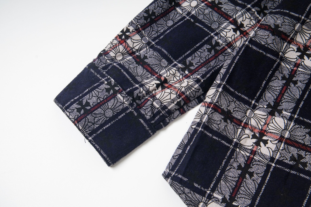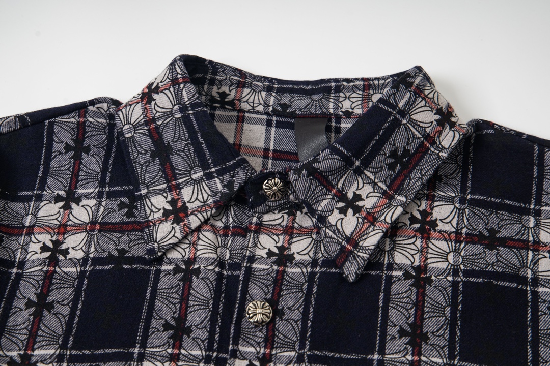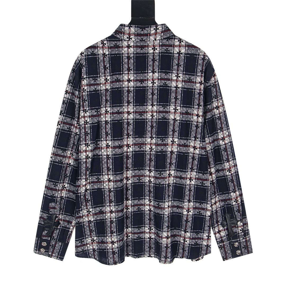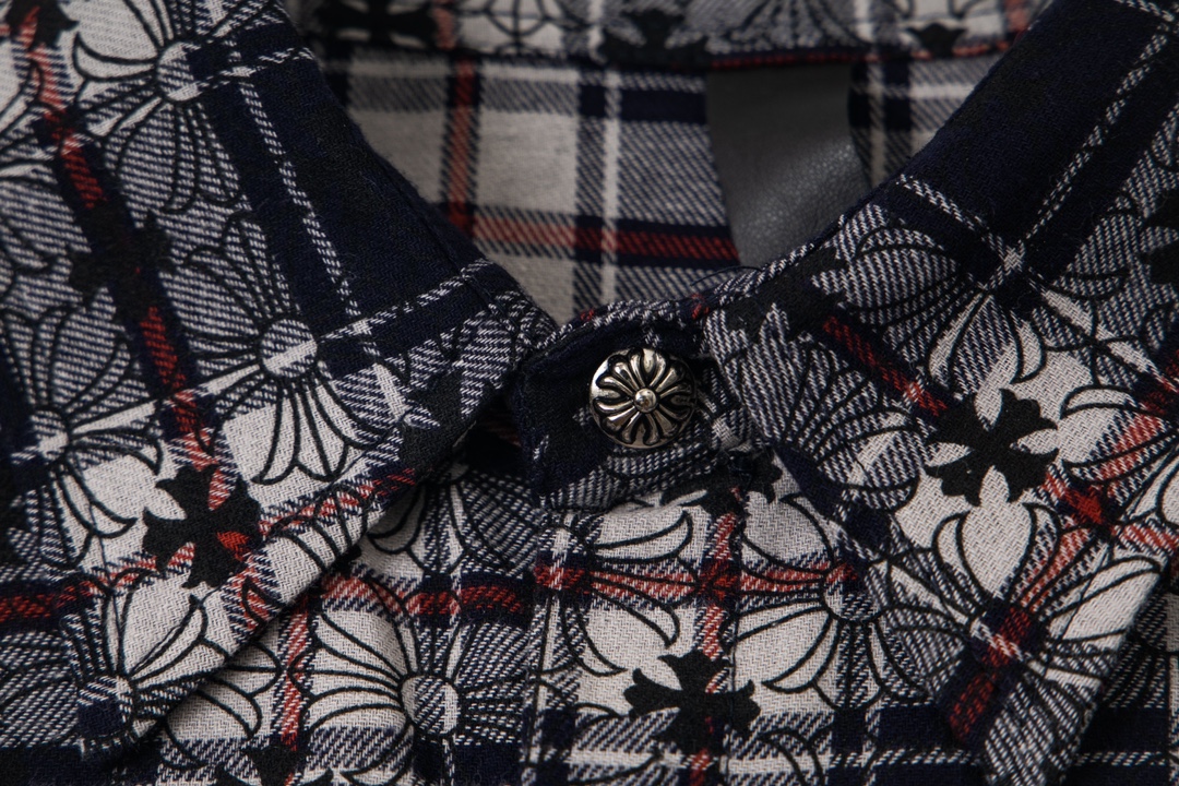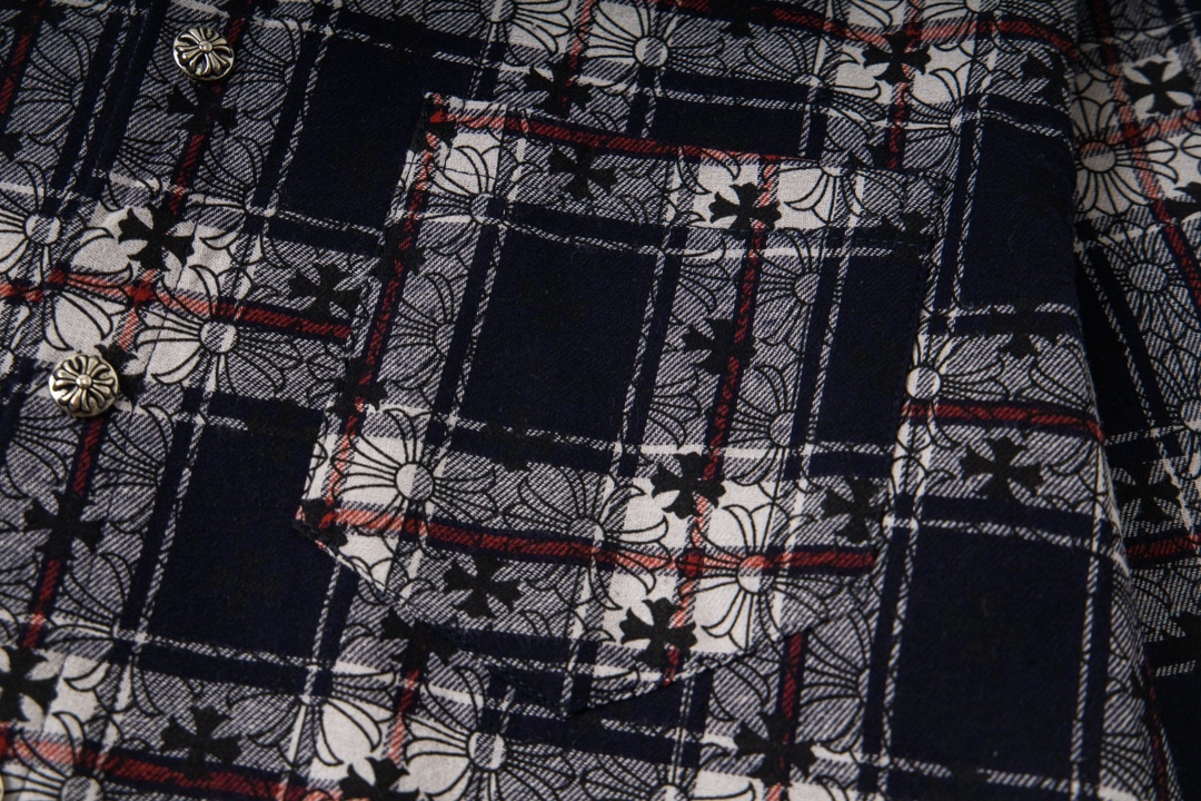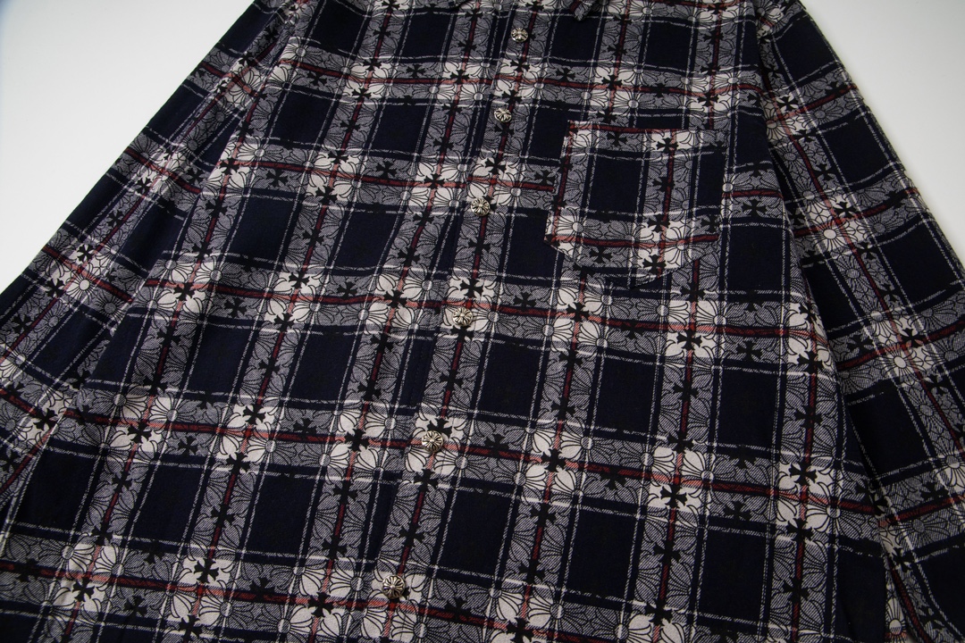 P205 款号Y650 CHROME HEARTS/克罗心CH 满印暗花长袖衬衫 定织定染纯棉芝麻底格子布,成布再匹印暗花,全衣对格手工裁,年底工费高,真皮手工绣袖,高品做旧童花四合扣,全网首批 颜色:黑色 红色 size: S-XL