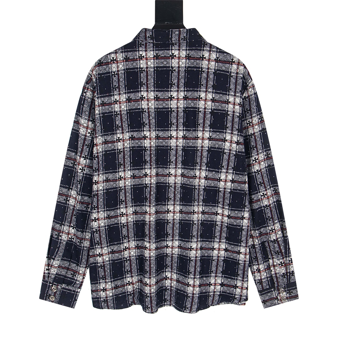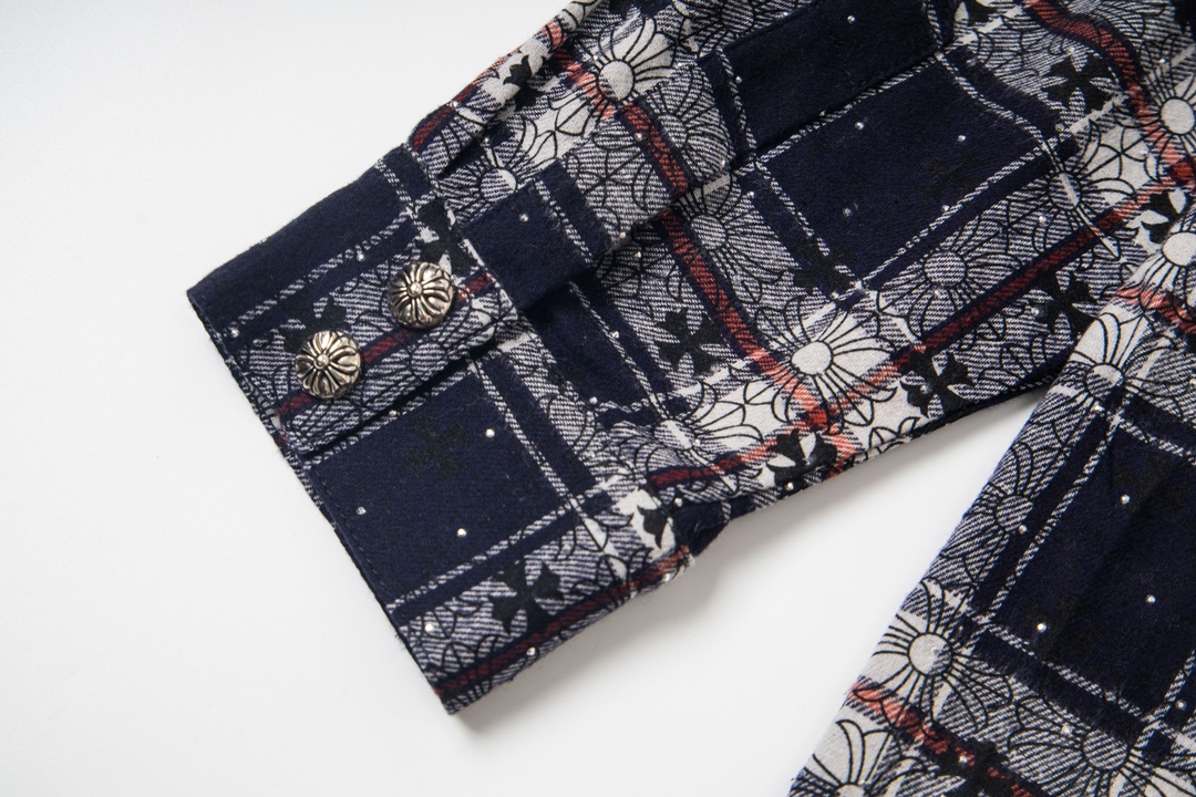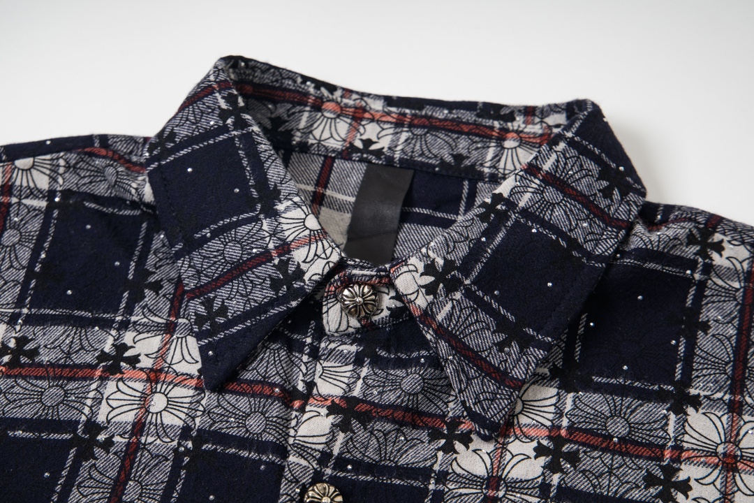顶级版本!克罗心格纹十字架贴皮满钻长袖衬衫