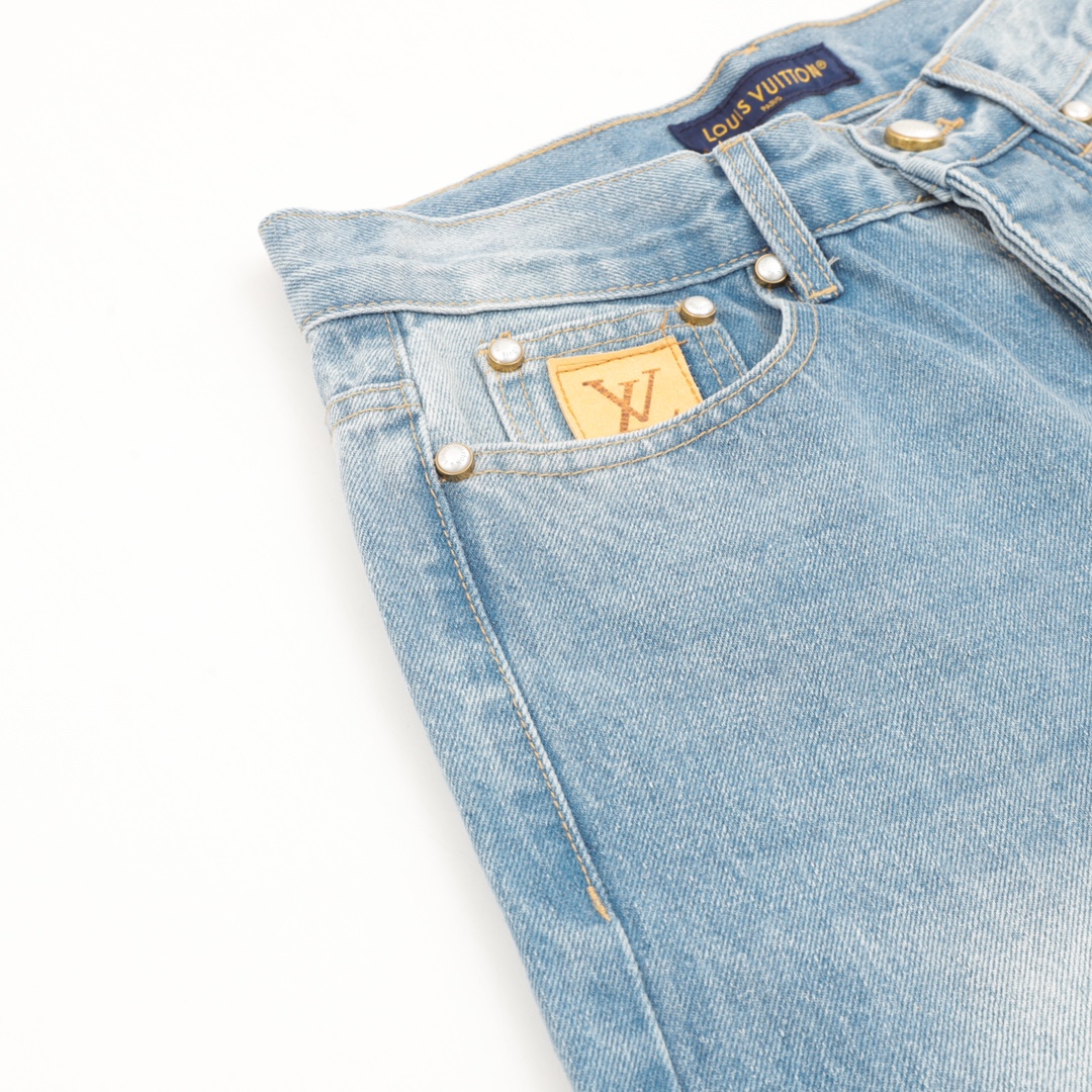 P225 款号Y643 LOUIS VUITTON路易威登LV 刺绣口袋牛仔蓝牛仔长裤 原版购入,原版采用480g牛仔布料,洗水后版型透气舒适,搭配棋盘五金原版开模纽扣,版型立挺,有型。洗水色泽媲美YB效果,定制珍珠材质纽扣。使用进口特种机器开模五金,刺绣LOGO皮牌各细节效果立体且还原度极好,手感厚实且精致,整体洗水后光泽度好,手感柔软厚实细腻,代购级别,版型简单百搭,男女同款牛仔裤! Size:S-XL
