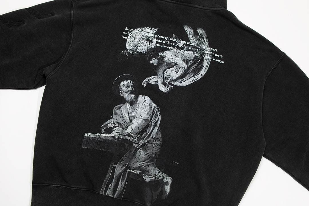 💰270 高版本OFF-WHITE 圣马修与天使印花水洗卫衣,男女同款,官网在售款。采用420g高克重纯棉毛圈面料,成衣水洗做旧,德国进口机器高清数码印花,环保级材料,色彩纯正,图䅁清晰,高温烫印加固印花,永不退色永不开裂!定制金属抽绳,洗水吊牌等辅料标配,细节到位。os版型上身毫无压力 尺码:S-XL