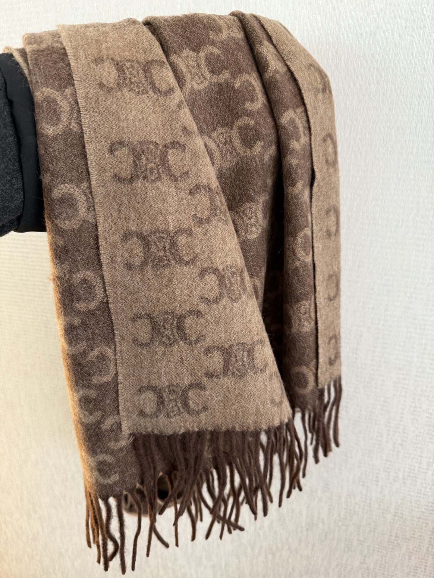 P130 P2040年CELINE凯旋门散林老花羊绒围巾终于出货了……很多宝宝要的上身图来啦!羊绒的质地戴起来软乎乎超舒服!双面明暗对比色,围起来不会那么单调.冬秋季必入款材料超级亲肤柔软,超级无敌百搭又显白,风衣大衣羽绒服的绝配仙女们🉑️冲!!浅栗色和巧克力二色可选;尺寸36x190