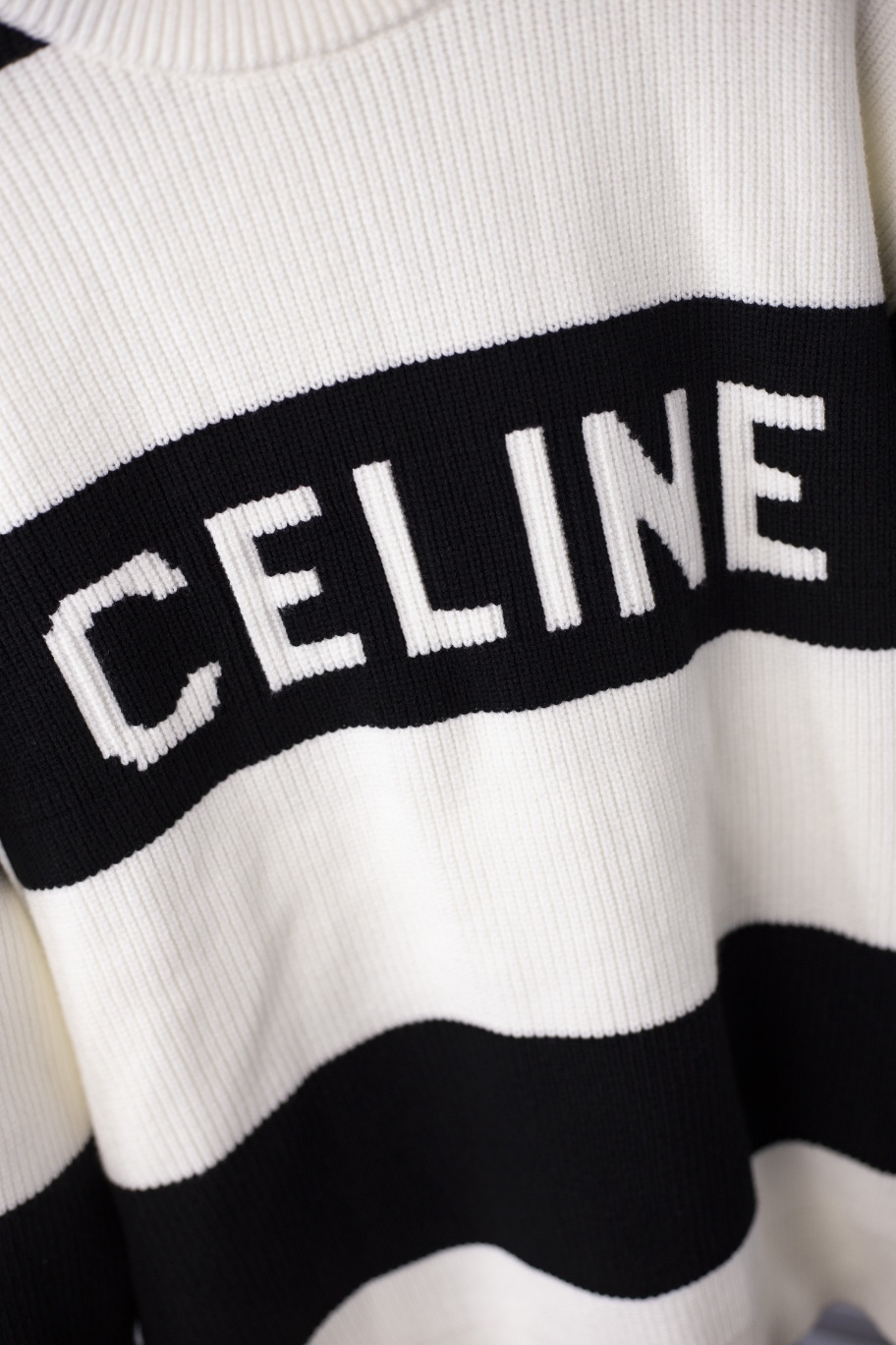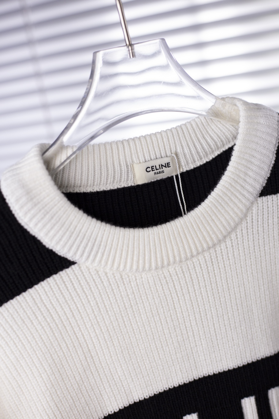P220 T101#CELINE黑白条针织毛衣。采用了黑白条纹撞色设计,视觉冲击力强,前面做字母提花。面料质感柔软。上身非常舒适,男女同款。 颜色:图片色 码数:XS.S.M.L