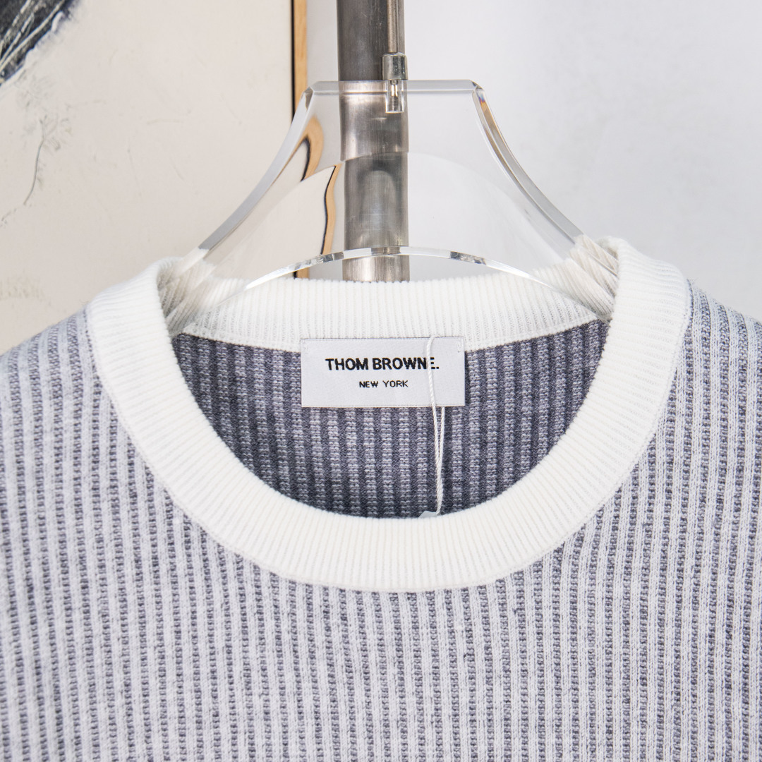 P235 zp版本[独家供应] Thom Browne ➡️汤姆布朗 拼色 四杠针织圆领套头长袖针织毛衣羊毛衫 升级,灵感源自八十年代复古 原版面料 官方同款 圆领 长袖 套装 定制 网纱毛衣针织面料 手感非常舒服 春夏最新砖柜同步 时尚又个性 超级百搭好看款 男女都非常合适 人手必备款 吊牌 领标 水洗麦 三标齐全 颜色: 浅灰色 深灰色 尺码:M L XL 2XL 编号:YK10558