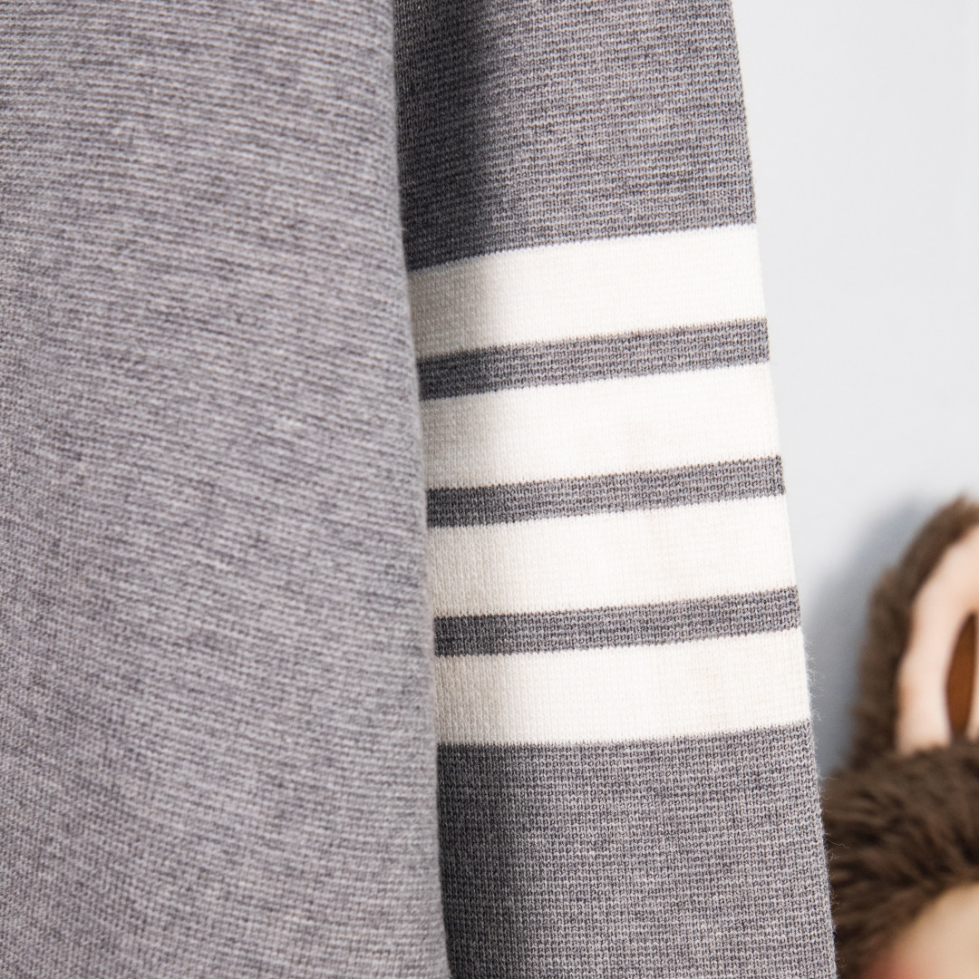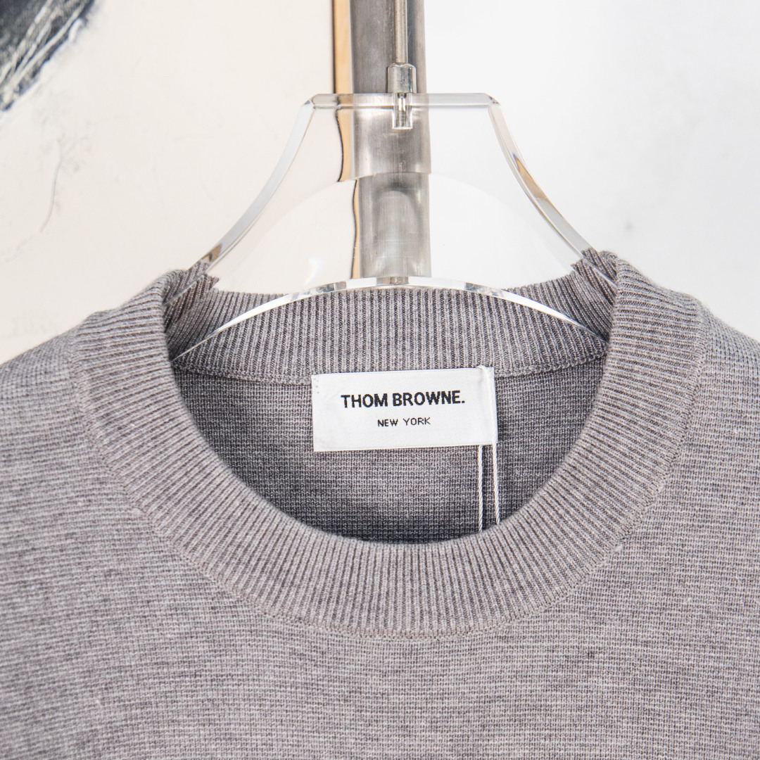 P235 zp版本[独家供应] Thom Browne ➡️汤姆布朗 华夫格圆领毛衣 TB经典四条杠基础风格 年年都穿的经典款必须选择品质⚠️全部对色定染含羊毛的棉纱线,柔软亲肤,双层针织很厚实,手感无敌好,拿到手里就能感受出它的质感❗️❗️随便一套就能出门很万能,盛装出席搭大衣穿着它上班也无违和感!下面搭配牛仔裤或TB系列百褶裙,高级感拿捏,减龄学院风! 颜色:黑 白 灰 淡蓝 尺码:M L XL XXL 编号:YK10555