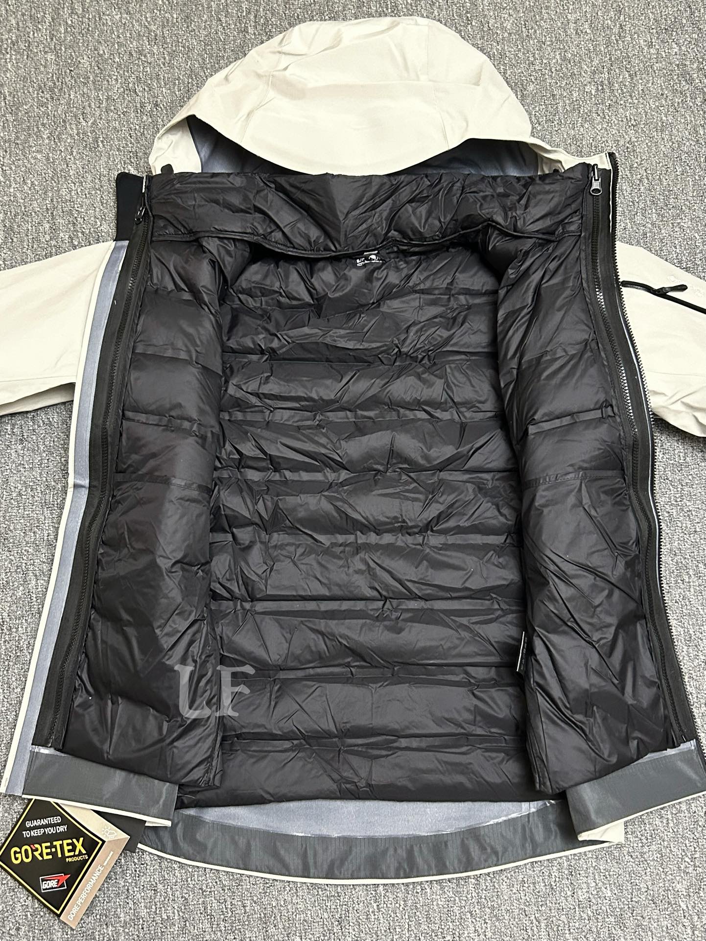💰490 SV 六代三合一象牙白(羽绒内胆) Arcteryx始祖鸟Alpha SV 六代户外三合一冲锋衣 羽绒内胆 双拉链 鸟家王炸款三合一冲锋衣羽绒服了来了 一衣三穿! 内胆带logo轻薄户外级羽绒服!外层是ARC‘TERYX SV 6代硬壳冲锋衣 GORE-TEX Jacket-Men's始祖鸟户外防水硬壳冲锋衣机能风拉链夹克 (Yb四次压胶工艺 整衣3D立体仿生学设计衣长臂弯, Tri-Durance防水防雨面料 ,自行区别市面先行版本 强力操作推荐入手) 📃 原档案原数据开发版型 # -原包装原标 全套辅料定制,整衣 腋下双向拉链,五金全部开模定制,吊牌书说明解析 ,多联水洗。 -这款设计简洁而通用,可提供高山环境所需的性能。采用bluesign@认证的采用带经编背衬N40P 103LGORE-TEX面料,轻薄而耐磨,防风、防水且透气,适合多种活动穿着。 -头盔兼容StormHood兜帽防护良好且不影响视线,插手口袋设有WaterTight拉链,便于取放物品,腋下拉链便于快速通风,拼接设计使活动自如。 -传统风琴交叉反向进入高山口袋设置在高位,VISLON中央正面拉链,可调节Velcro袖口魔术贴标签,兼容Zip-in,在胸前采用百灵达机器绣上了ARC TERYX徽标 SV:多用途服装适用于多种活动和环境。 SV : 高性能的简约设计,轻量而耐磨。 GORE-TEX:防水、防风、透气面料可提供多面防护。 -SV夹克同是Arc’teryx的明星产品,一直在高山恶劣环境中表现突出,现在功能更强大,重量更轻。 -颜色:黑金色 象牙白 黑银色 虎鲸色 荧光绿 幽雾绿 尺码:S-XXL