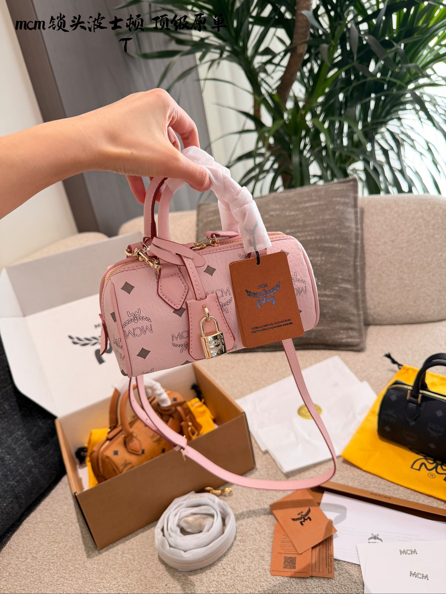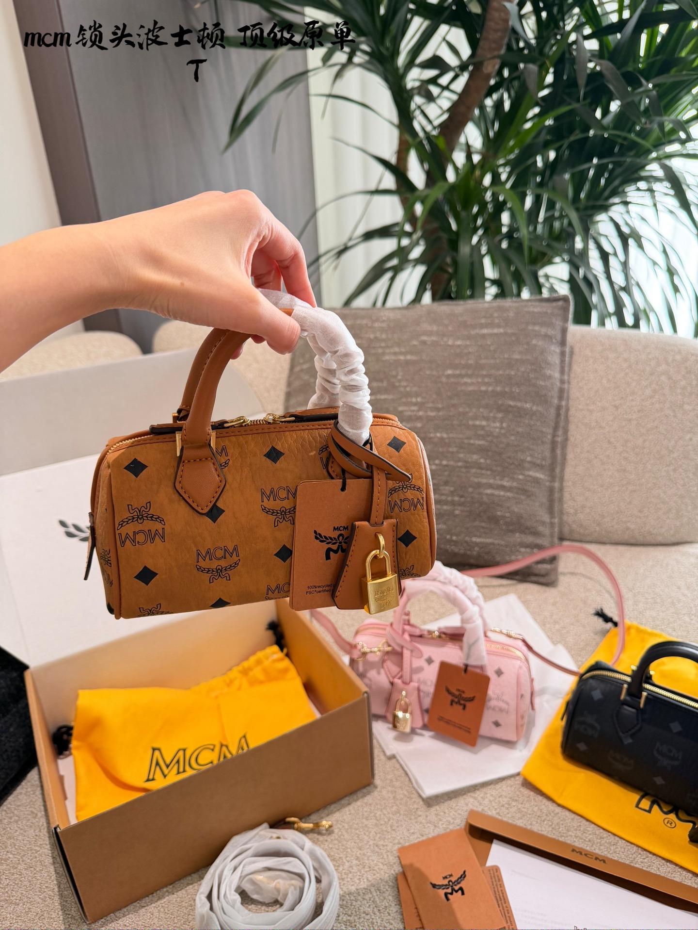 💰240 MCM迷你波士顿包 MCM迷你波士顿包,Visetos老花涂 层帆布+干邑皮革饰边,金色锁扣超有辨识度+。尺寸19x11x8cm,小巧轻便,通勤出行都很适合。肩带可调节,手提斜挎随.心切换,内部空间虽小但布局合理,手机钱包都能装下圃。干邑色百搭耐脏,秋冬季节超受欢迎心。
