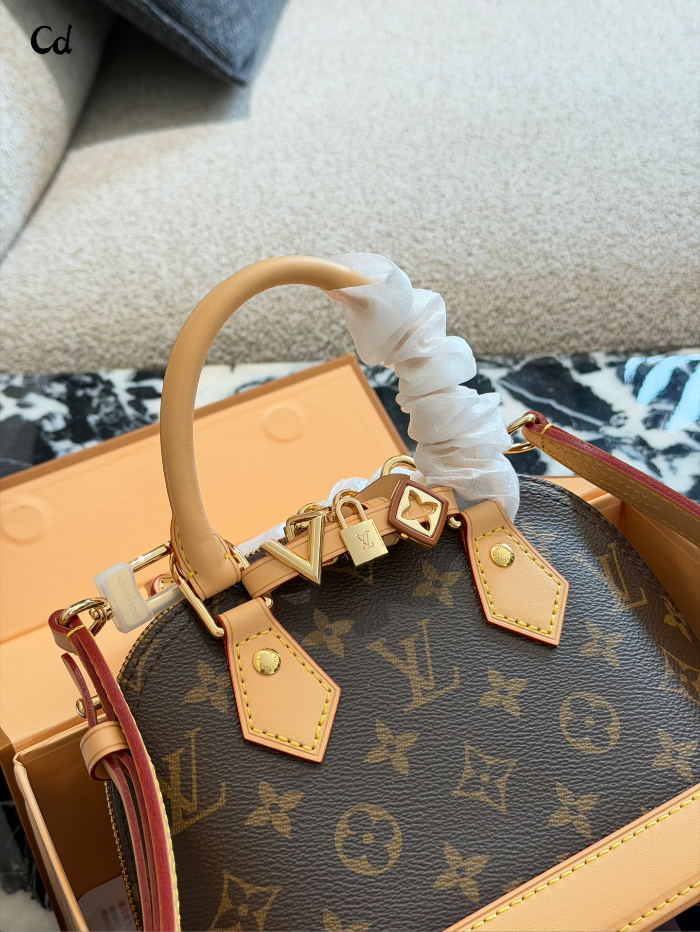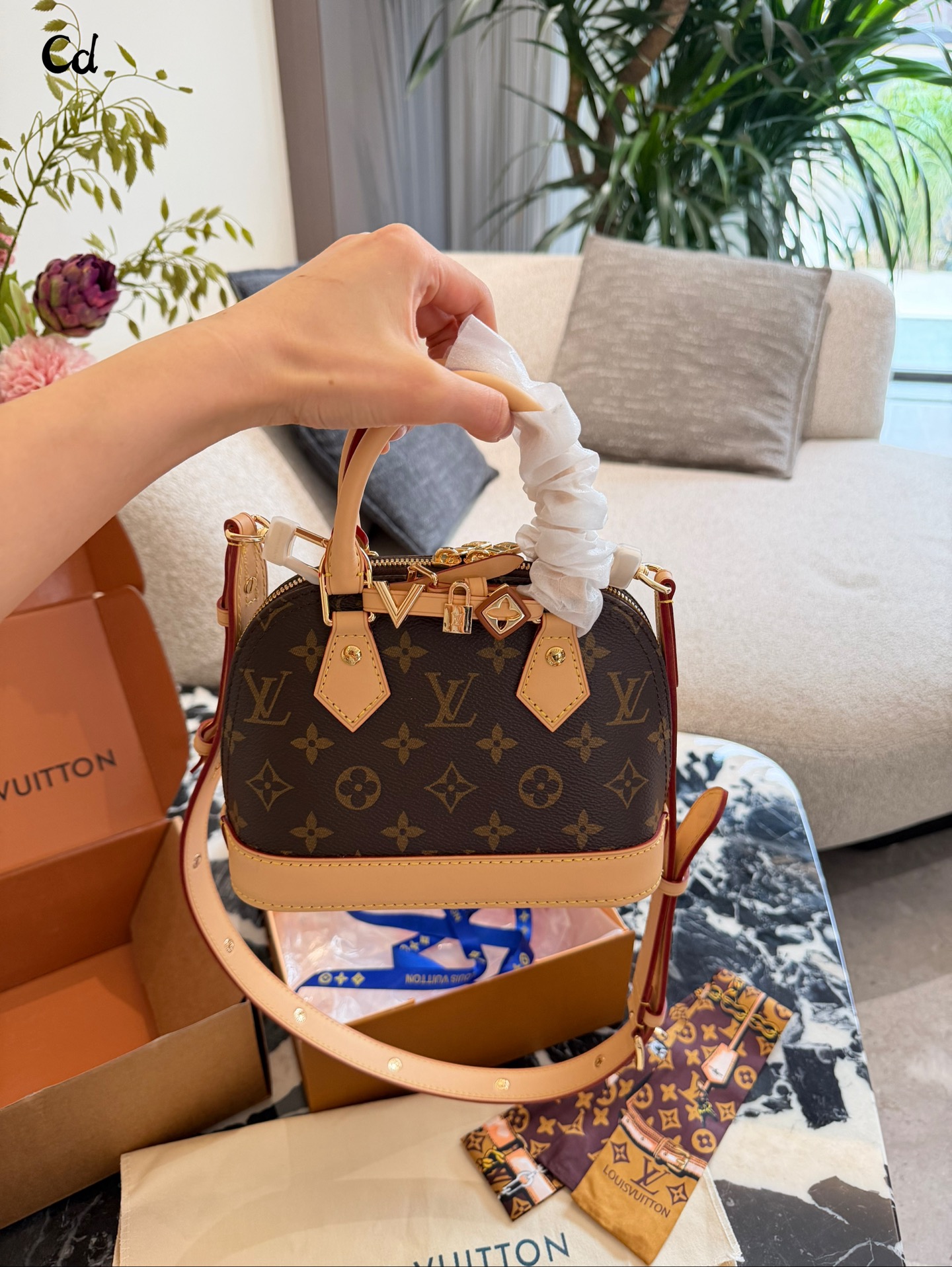 💰260 LV Alma BB老花贝壳 LV Alma BB贝壳包,经典Monogram老花帆布+牛皮饰边,金色五金超精致十。20x18x11cm小巧精致,拉链开合更安全,肩带可调节,手提斜挎都OK!内部超细纤维内衬,日常通勤、休闲都能装下随身物品。自1934年推出,优雅实用,收藏价值满分。
