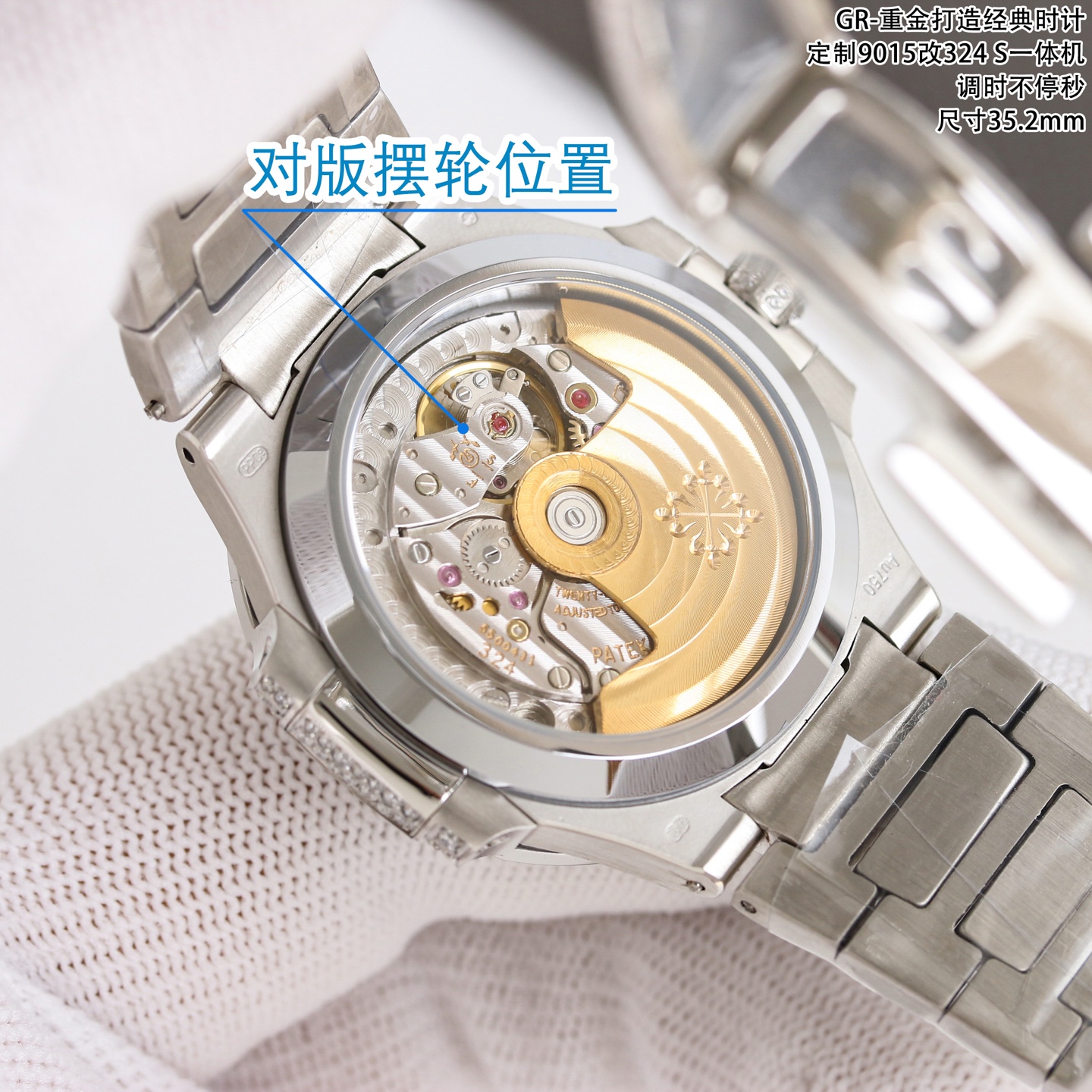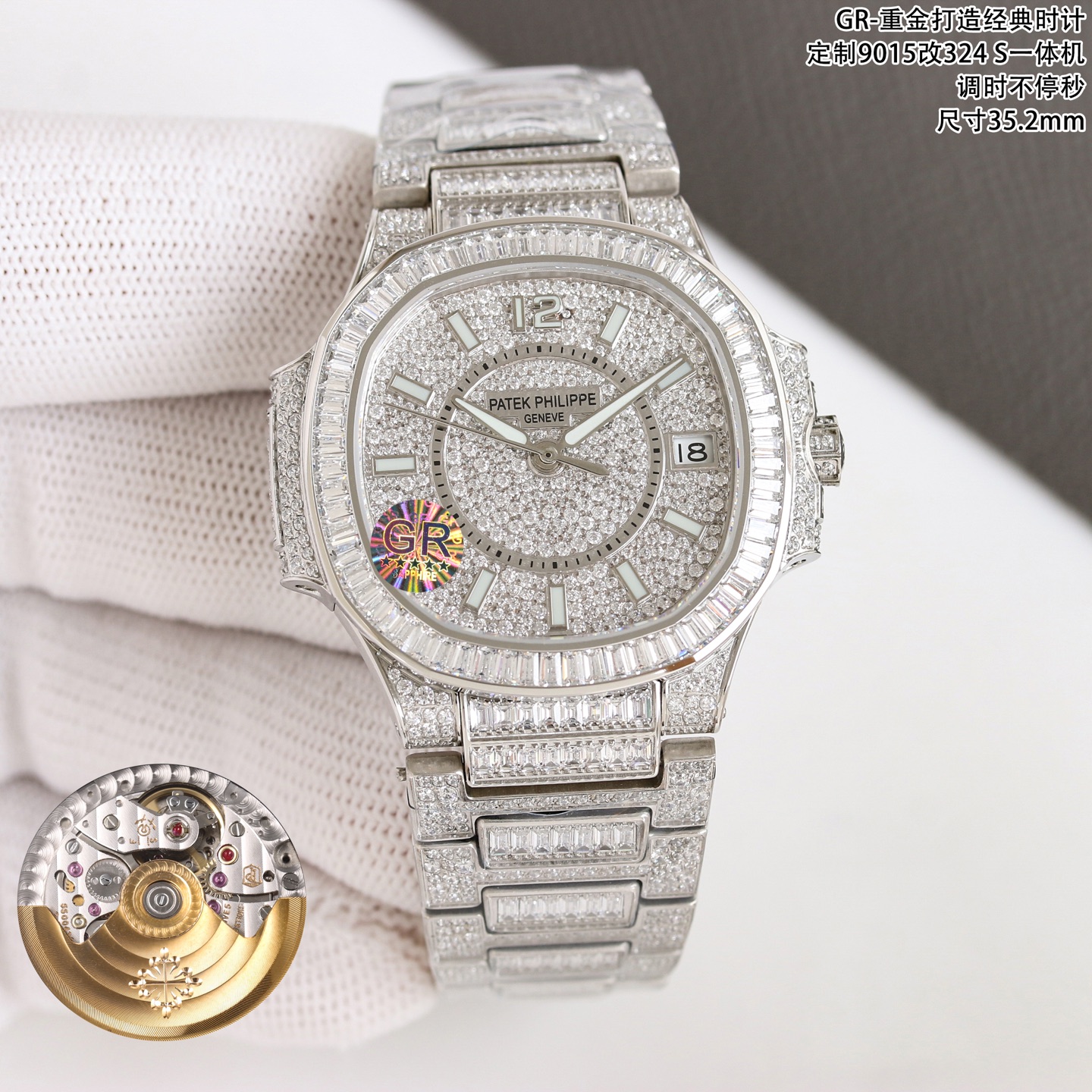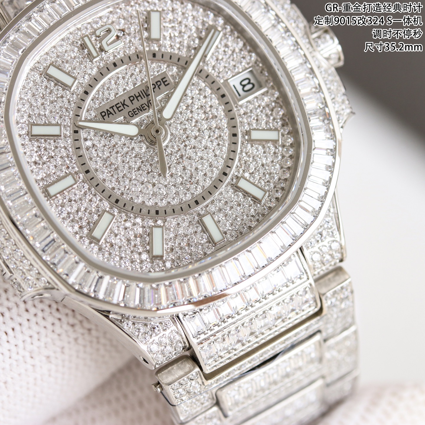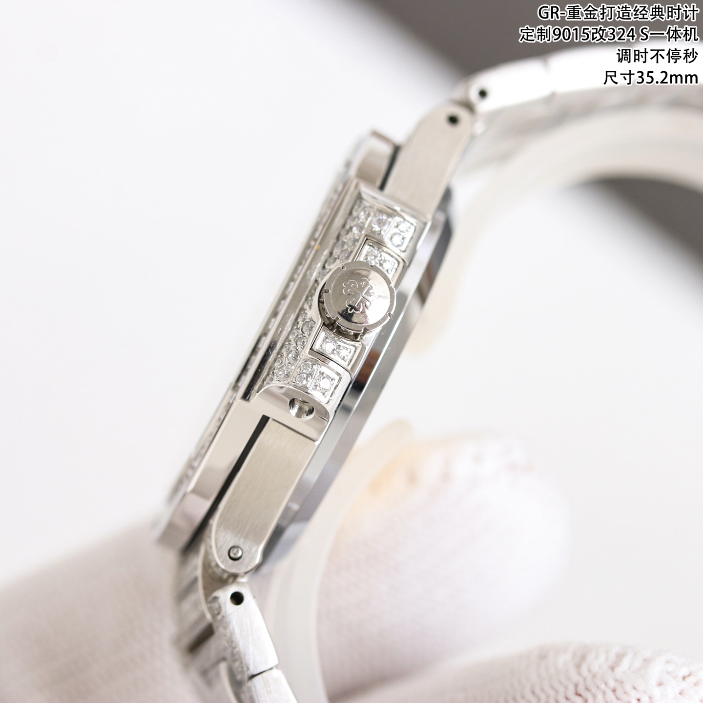 统一价:3700 新款首推 GR重金打造经典时计——百达翡丽7021女士鹦鹉螺 满钻T砖双拼限量款 少量到货,限量供应(全身采用八心八箭天然奥宝水钻) 🉐️赠送价值💰488旅行便捷定制手表表盒 腕表:定制9015改324 S自动一体上链机械机芯,及调时不停秒,中心大秒针 表盘:镶嵌286颗不规则钻 表壳:PVD白金及62颗长形T钻 防水系数30米。直径35.2mm 表链:PVD白金镶嵌895颗不规则钻及212颗长形T钻,采用罕见的“不规则雪花镶钻➕全身T砖”工艺,令腕表更添耀眼光彩,这项工艺需要将大小各异的钻镶嵌并固定到位,尽可能隐匿每颗钻之前的贵金属痕迹。 顶配鹦鹉螺7021满天星 目前算是最奢华的女款鹦鹉螺 应该没有人能拒绝了它了吧 雪花T砖双拼❄️镶钻全身 不仅是表盘,表带都是雪花T砖双拼镶钻总之一个字“闪”(白色为真空炉内白金,玫色为真空炉内纳米玫瑰金) GR精品,欢迎表友品鉴!