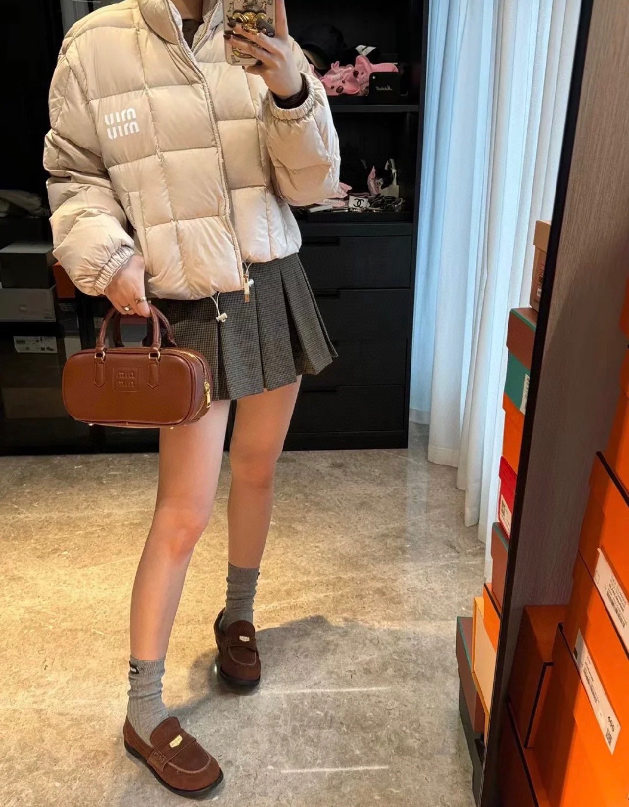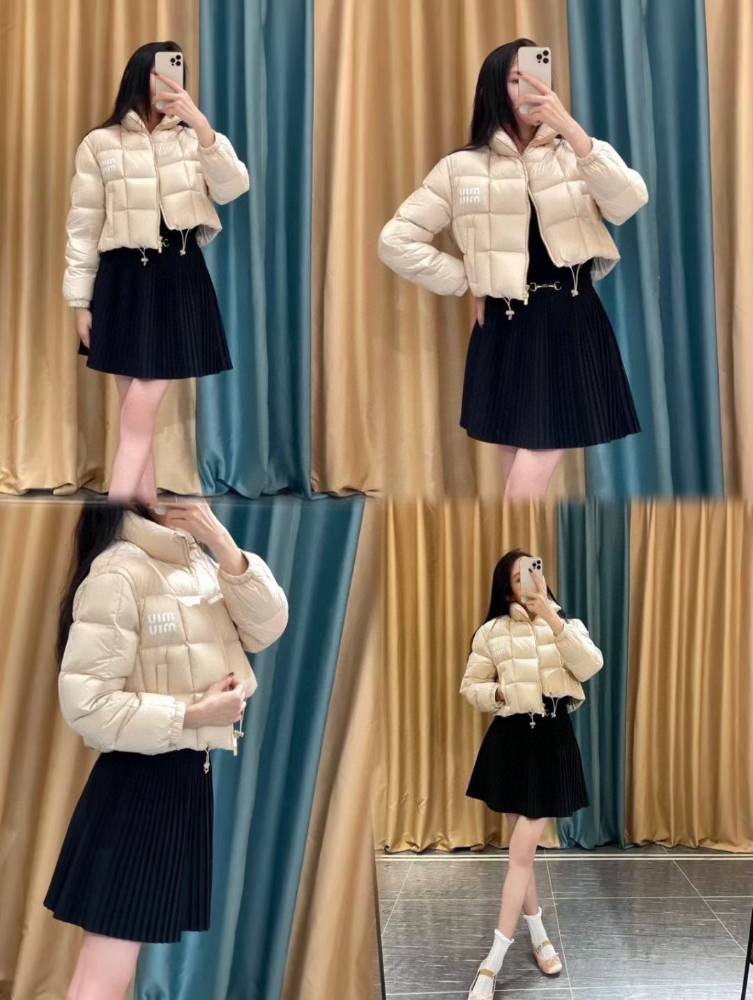 #Miu Miu/缪缪 格子面包短款羽绒服上身效果