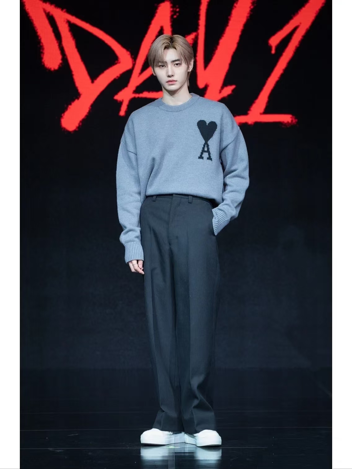 模特上身效果 AMI/艾米 马卡龙色系爱心提花针织圆领长袖毛衣
