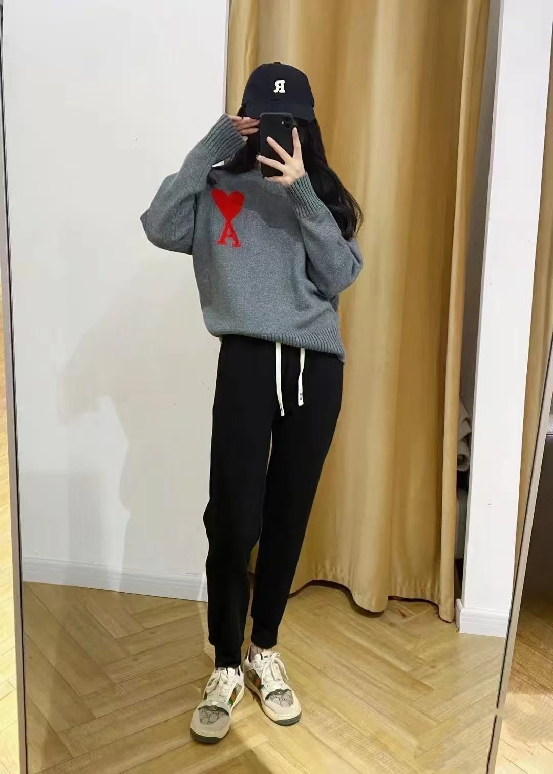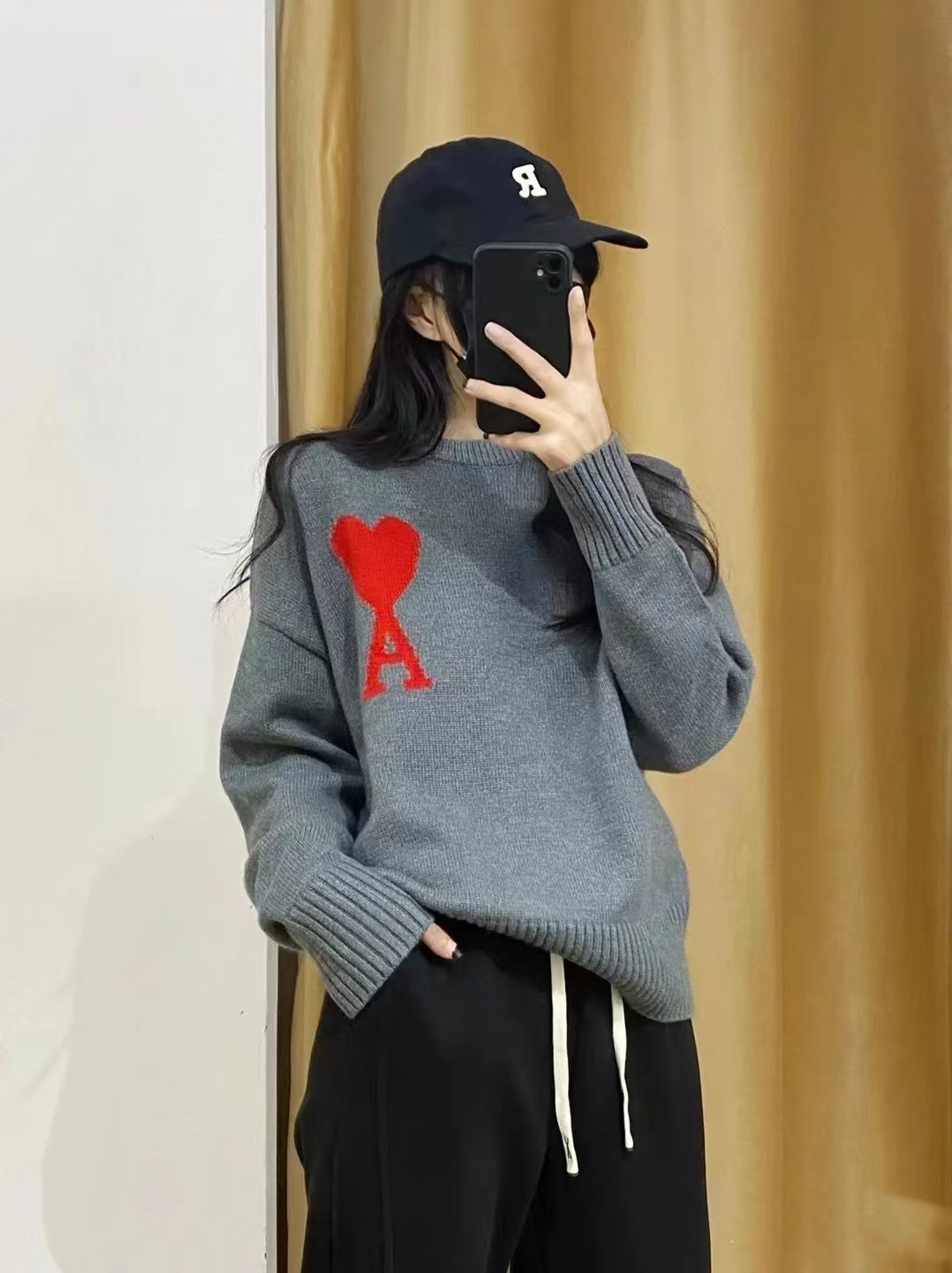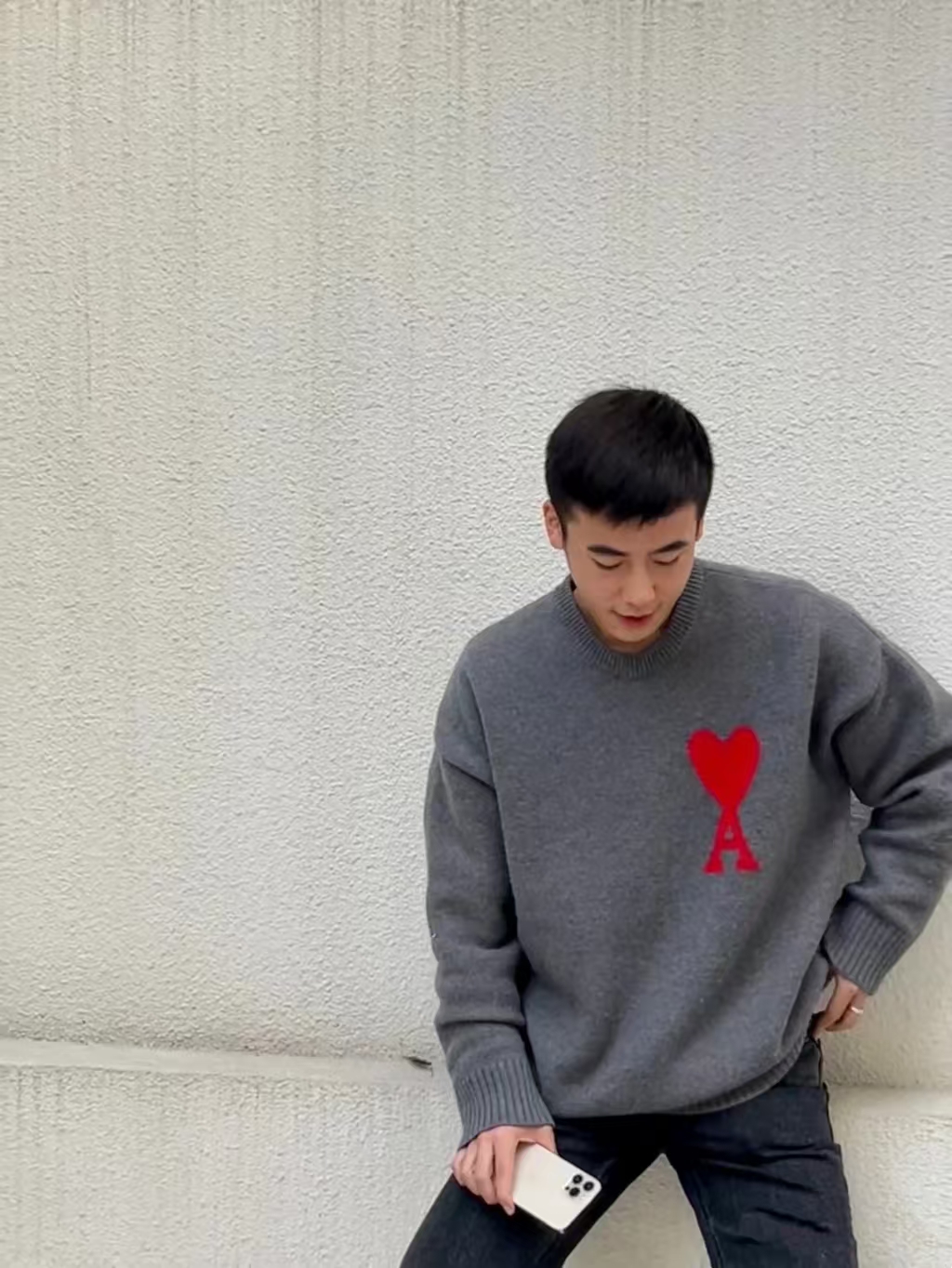 模特上身效果 AMI/艾米 马卡龙色系爱心提花针织圆领长袖毛衣