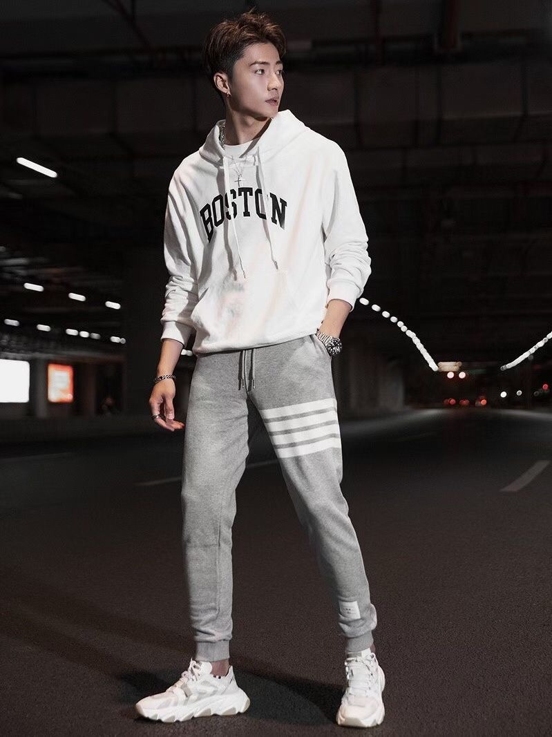 模特上身效果 THOM BROWNE 汤姆布朗. TB经典色织毛圈长卫裤