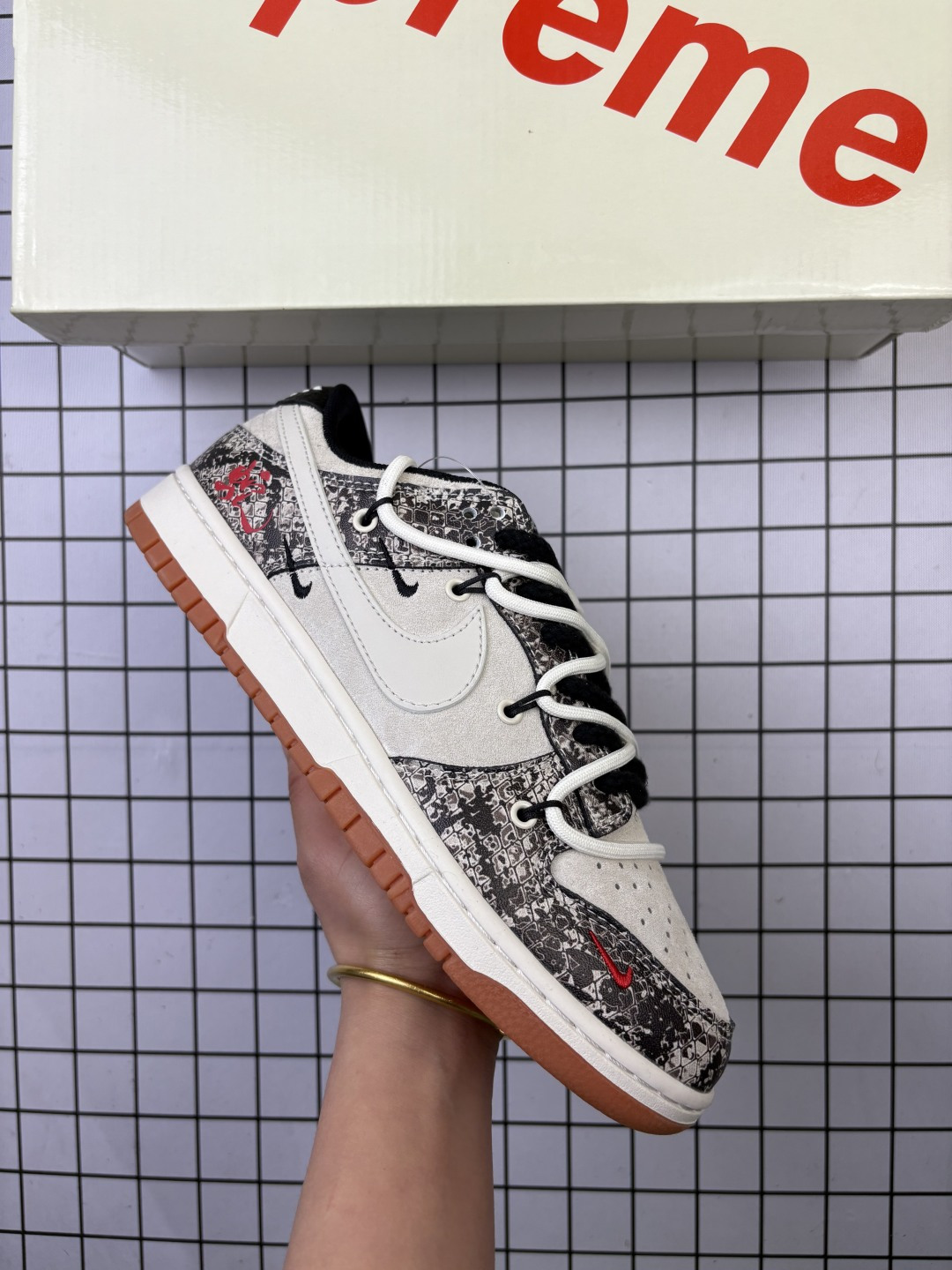 🈴💰170 Nike/耐克 男女鞋真标半码制,全新更新数据窄楦翘头版型,采用固色猪巴革组合蟒蛇纹牛剖革鞋面材质,大厂水平严控清洁度,缜密拉帮中底布,鞋垫嵌EVA缓震物料及背胶,全新窄版翘头耐磨橡胶大底❗️2025蛇年创意定制配色,耐克Nike SB Dunk Low Lot"Year of the Snake"扣篮系列低帮休闲运动滑板板鞋“联名蟒蛇纹黑灰米白蛇年绑绳 YX5066-273 类型:男女鞋 码数:36 36.5 37.5 38 38.5 39 40 40.5 41 42 42.5 43 44 45 编码:577