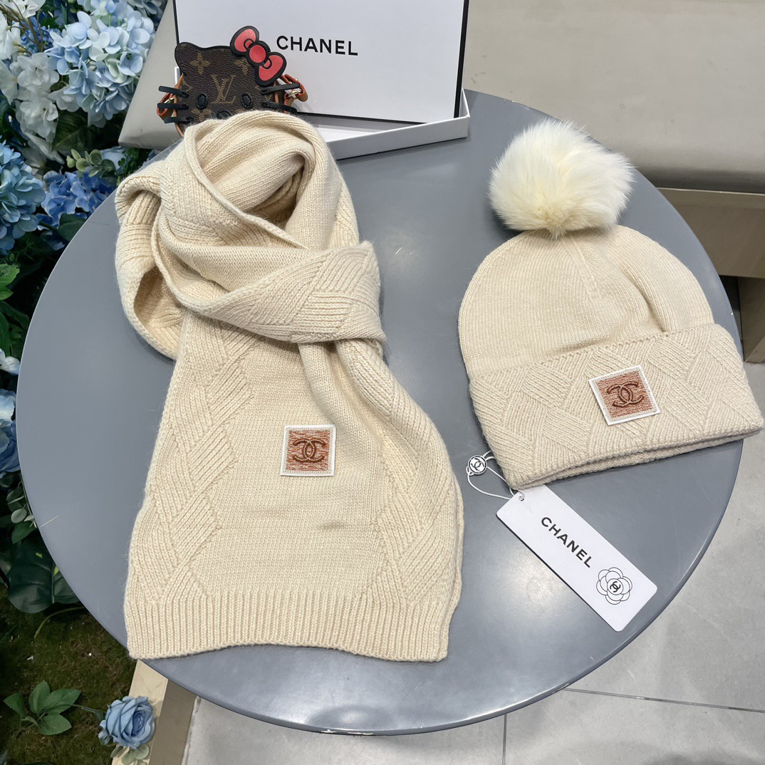 P195Chanel香奈儿经典羊毛套装🌟帽子+围巾配狐狸毛球暖暖哒超级舒服~冬日小姐姐减龄神器哦~这个冬天你就差这么一套套装帽子啦~又保暖又时尚!防伪标签吊卡齐全!