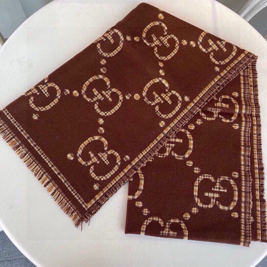 P140 🆕品名:Gucci · 风格字母 面料:羊毛 尺寸:47*180 羊毛真丝围巾,装饰超大造型设计GG图案。于1970年代首次使用的GG标识,由始于1930年代的早期Gucci菱形设计演化而来,其后便成为Gucci传承的标志。在2018早春系列中,GG图案以全新方式重返时尚前沿搭配起重返潮流的格纹风格❗️