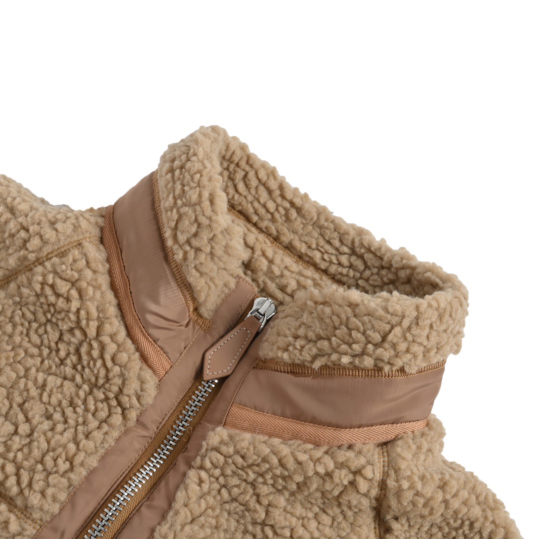 色织羊羔绒,定制辅料,面料起订量1000米起,颗粒绒羊羔先经染色,再经拉毛、梳毛、剪毛、摇粒等多种复杂工艺处理,毛面呈天然不规则颗粒状,蓬松密集而又不易掉毛、起球,厚实饱满,保暖度不亚于羽绒服,胸口重叠B字母采用毛巾布面料,上身效果绝绝子