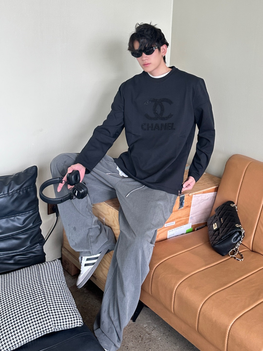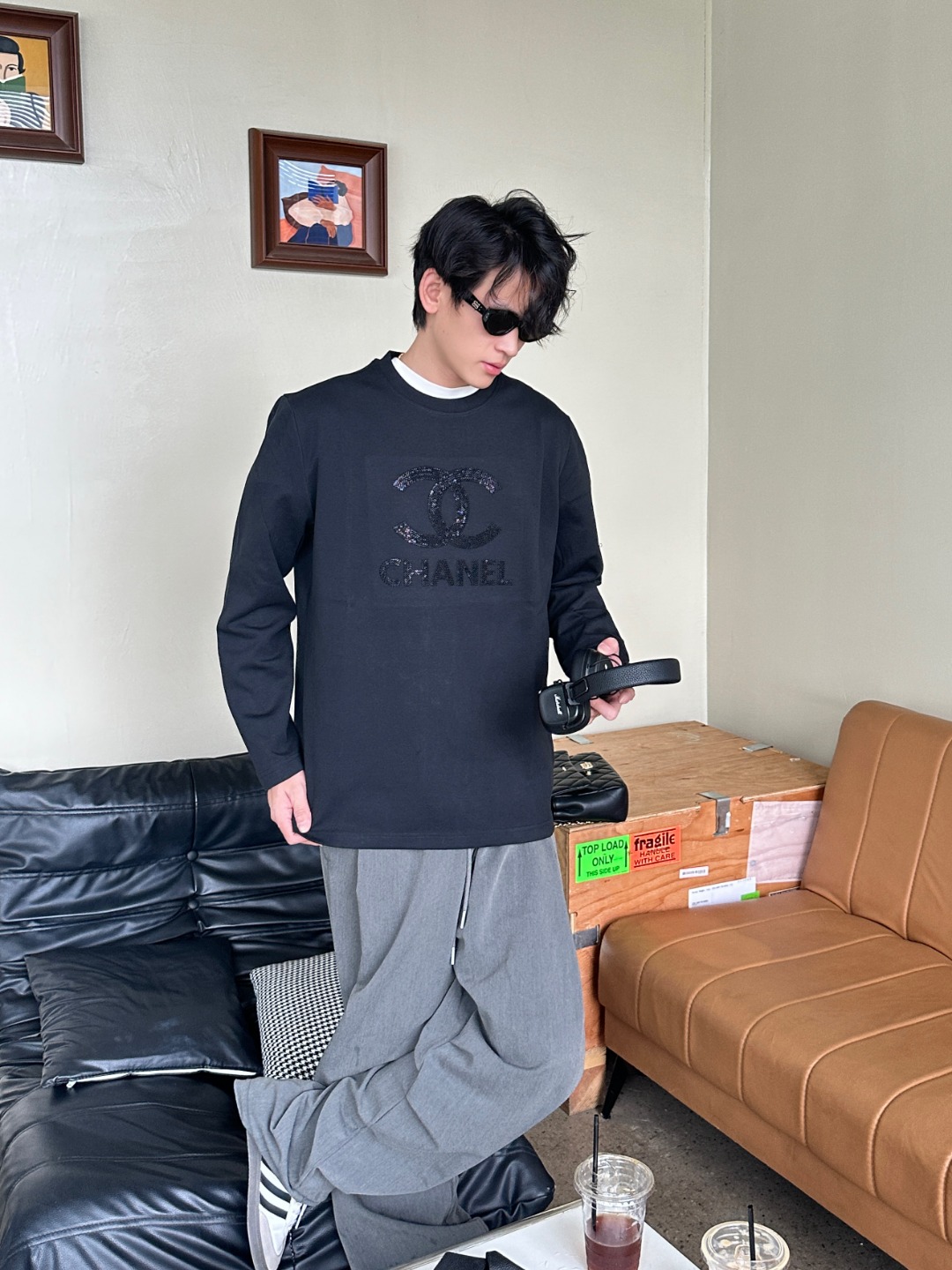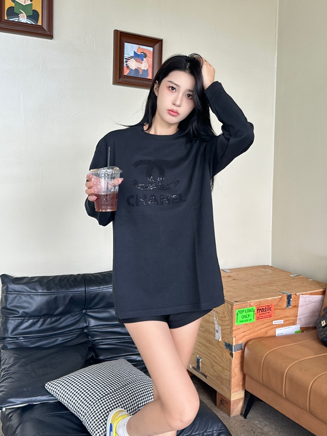 CHANEL/香奈儿 25Fw 暗纹双C大logo字母立体刺绣长袖T恤 上身效果#