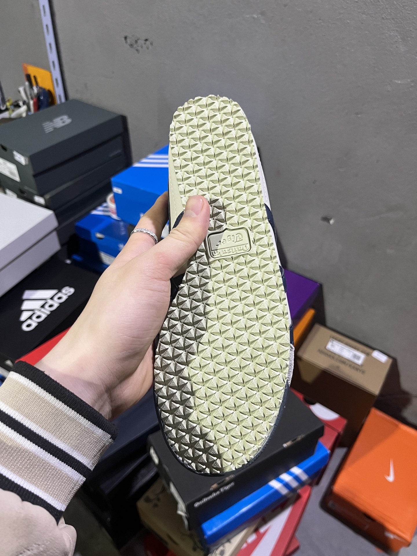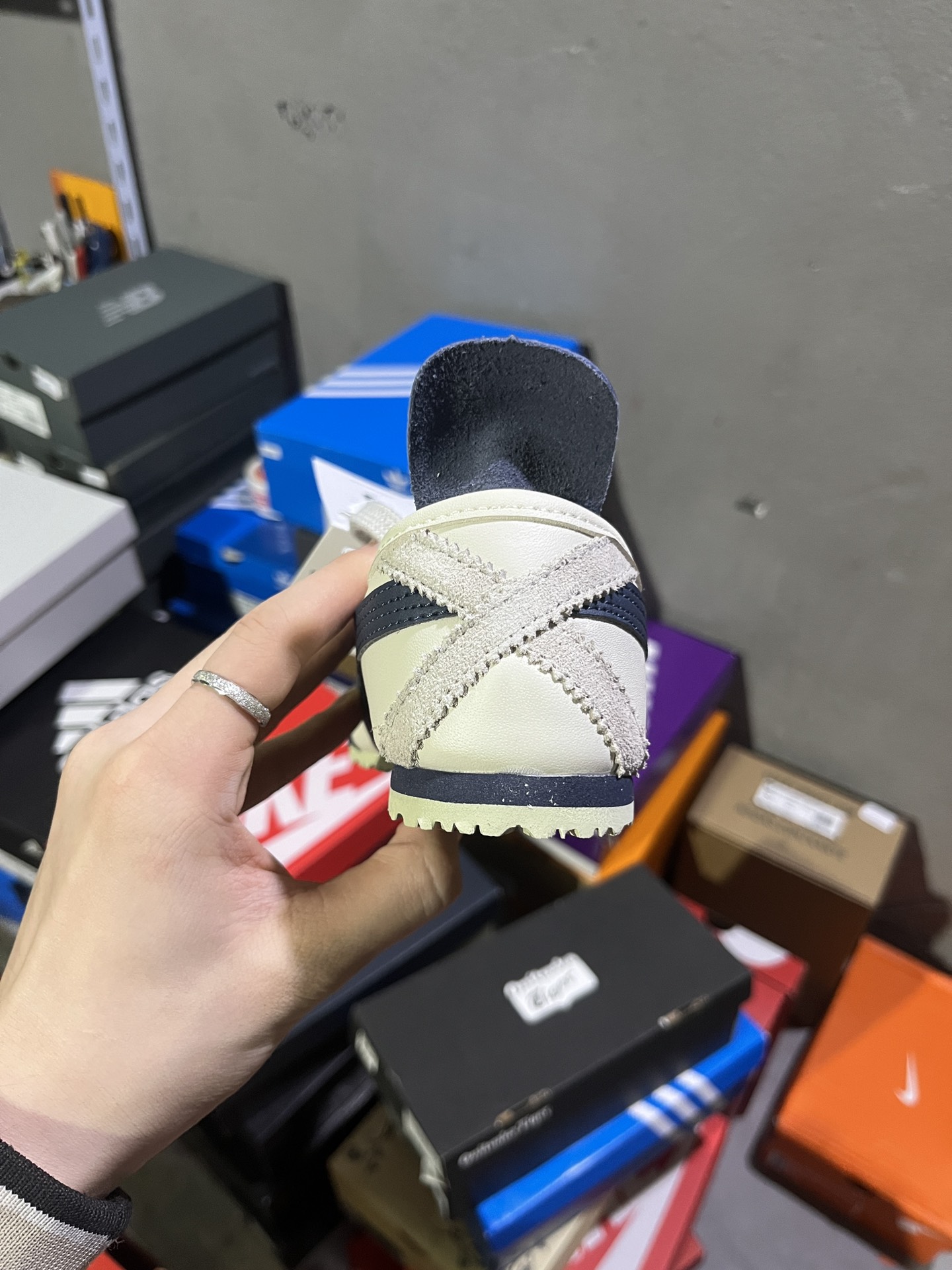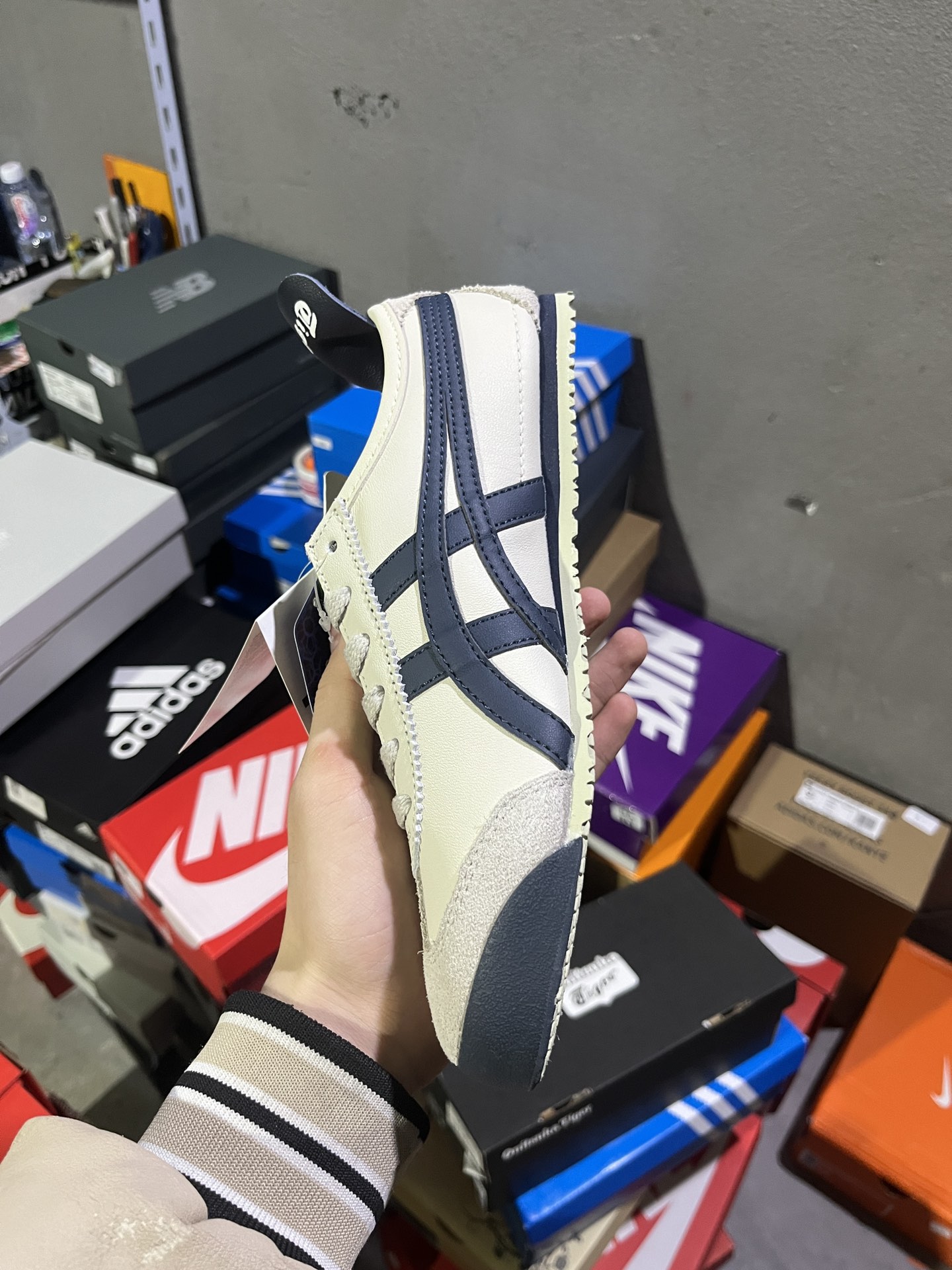 #实拍鉴赏 #仓库随手拍上新 #平台版头层 💰130 Onitsuka Tiger鬼塚虎 MEXICO 66 牛皮皮革 户外 防滑 低帮 生活休闲鞋 男女同款 米藏青 货号:DL408-1659 辅助货号:1183C102-200 尺码:36-45