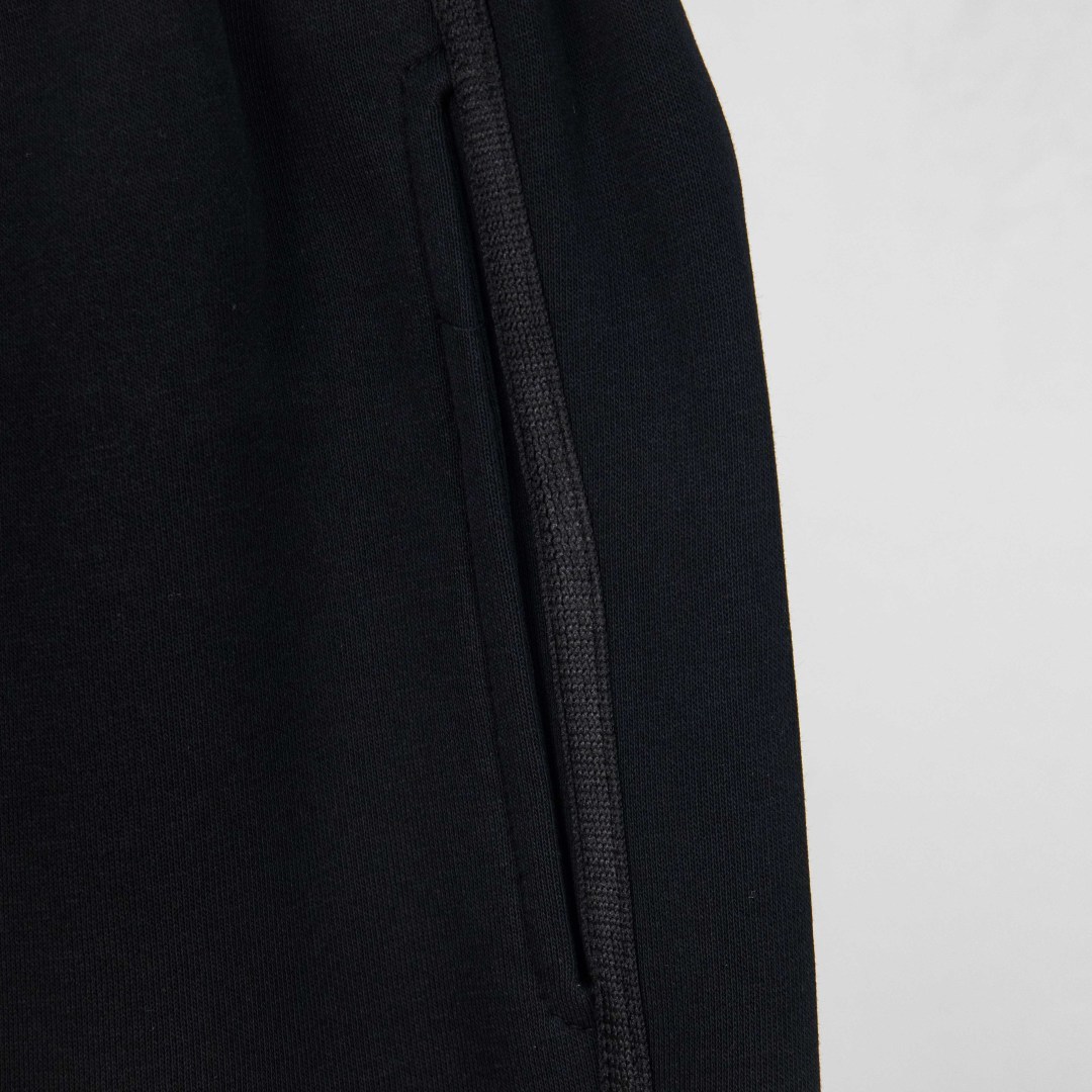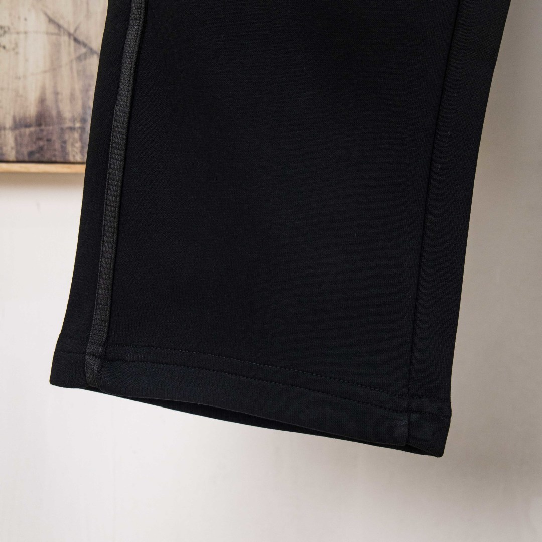 定织400可复合纱线,坯布水洗手感、布面、垂感达380g,同缸染色面料定色定染,印花无毛边 还原一致拉腰线,国内双针机器改装珩线!看似简单的款式,小细节特多!脚口22螺纹专业