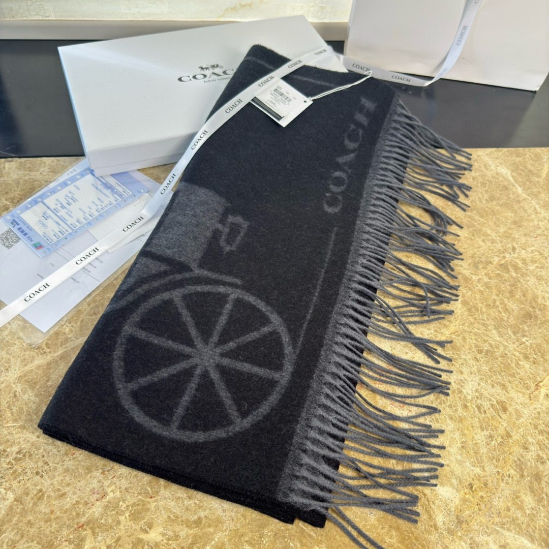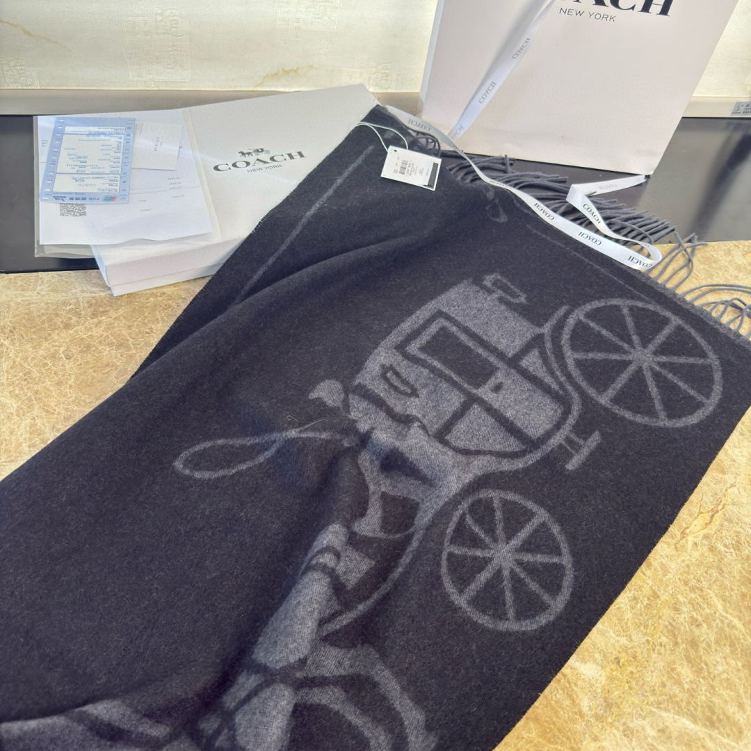 P170🆕COCAH新品马车图案印花大尺寸围巾❗️原版全套辅料,这款马车图案印花大尺寸围巾采用绵羊毛和山羊绒的奢华混纺构成,饰有标志性Coach元素。该羊毛围巾既可佩戴于脖子上来保持身体温暖,也可披在肩上呈现休闲风采。