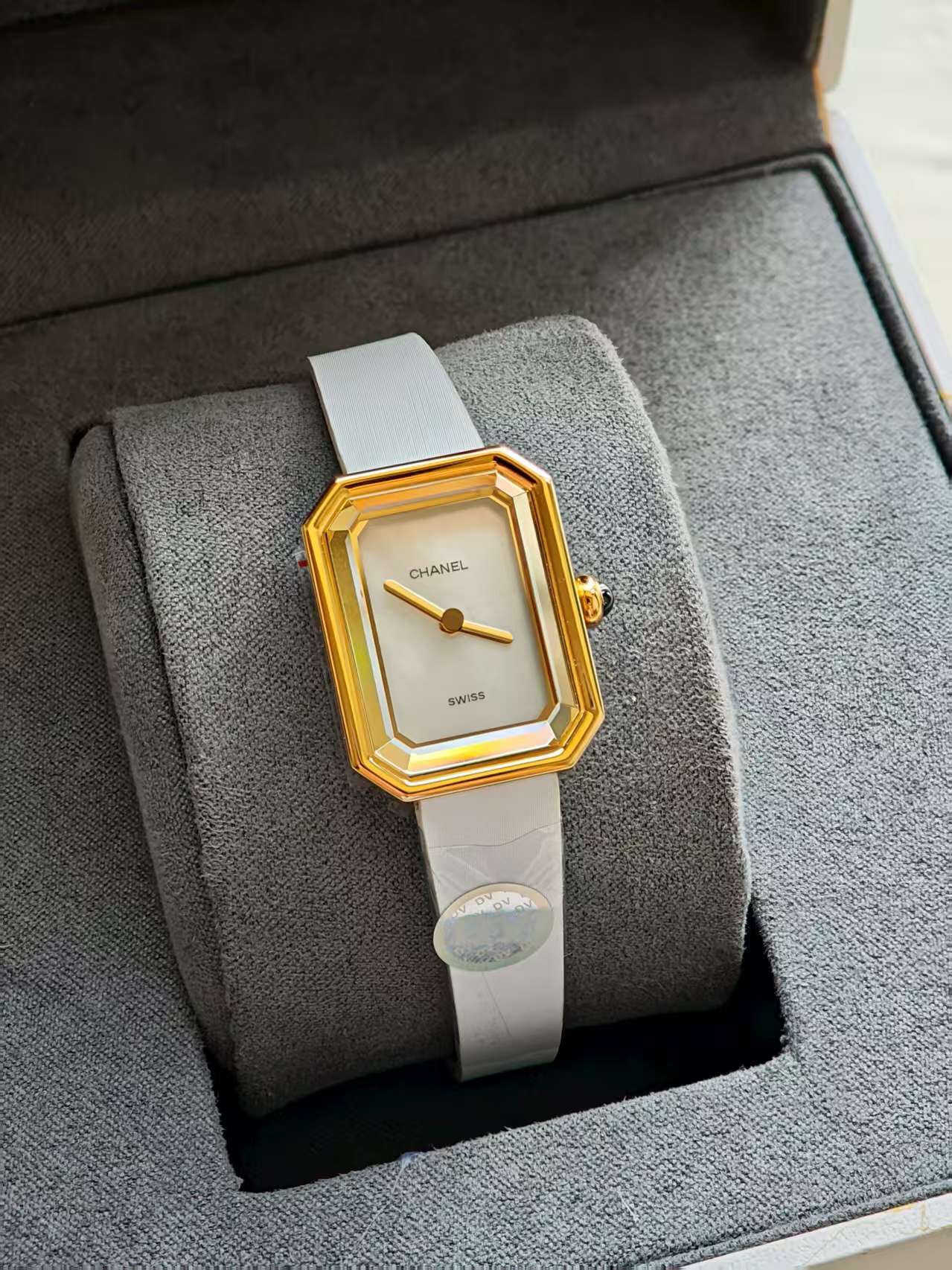 DV厂最新最高版本,壳打印记,最新版本是白色底盖,一表一码! 娟诗皮,3D立体八边蓝宝石玻璃.瑞士机芯!闪亮登场香奈儿 最新款 小号 PREMIÈRE 腕表的八角形轮廓与巴黎芳登广场的形状如出一辙。这一隽永恒久、堪称完美设计典范的建筑与腕表柔美妩媚的特质相互呼应名称 PREMIÈRE VELOURS腕表 编号H6125系列 Première材质 白金黄金钛金表壳 黄金表壳表盘 黑色漆面表盘表冠 表冠镶嵌凸圆形缟玛瑙底盖 钛金属表底盖表带 黑色牛皮质感表带 扣针式表扣 高精确度石英机芯 防水深度:30米