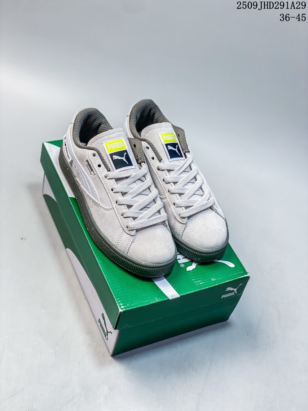 🈴️💰130 PUMA彪马 puma white rice-dark grey新款男女同款复古休闲板鞋面包鞋 鞋面采用优质麂皮材质,鞋带加宽加厚设计,鞋舌有PUMA标志和跃动飞豹图案,鞋底采用白色橡胶材质,底部有几何纹理图案设计,整体造型圆润饱满,蓝色鞋身展现活力与运动感,白色点缀增添简洁千净的视觉效果,是一款时尚潮流的休闲运动鞋。 货号:396057-01 尺码:36~45 编码:09JGD291A29