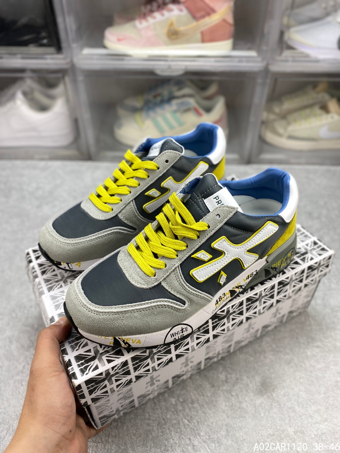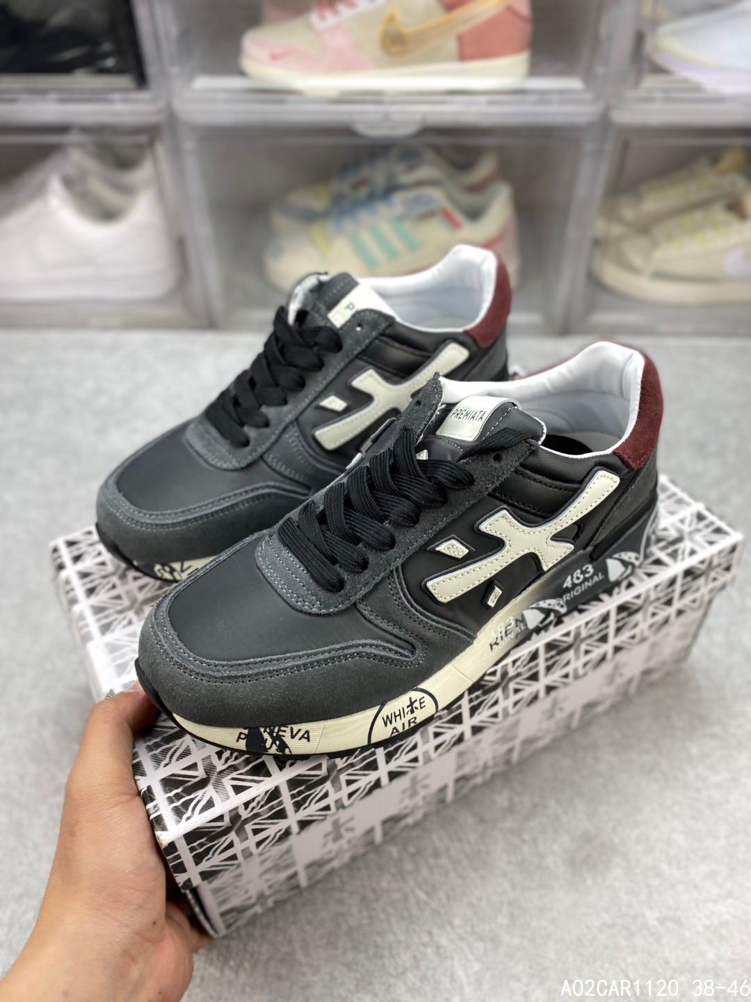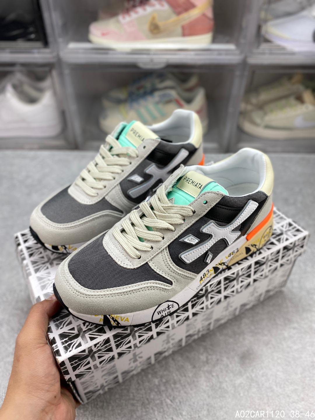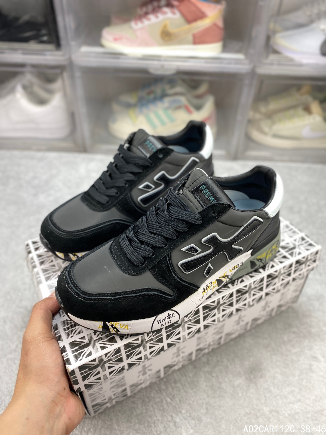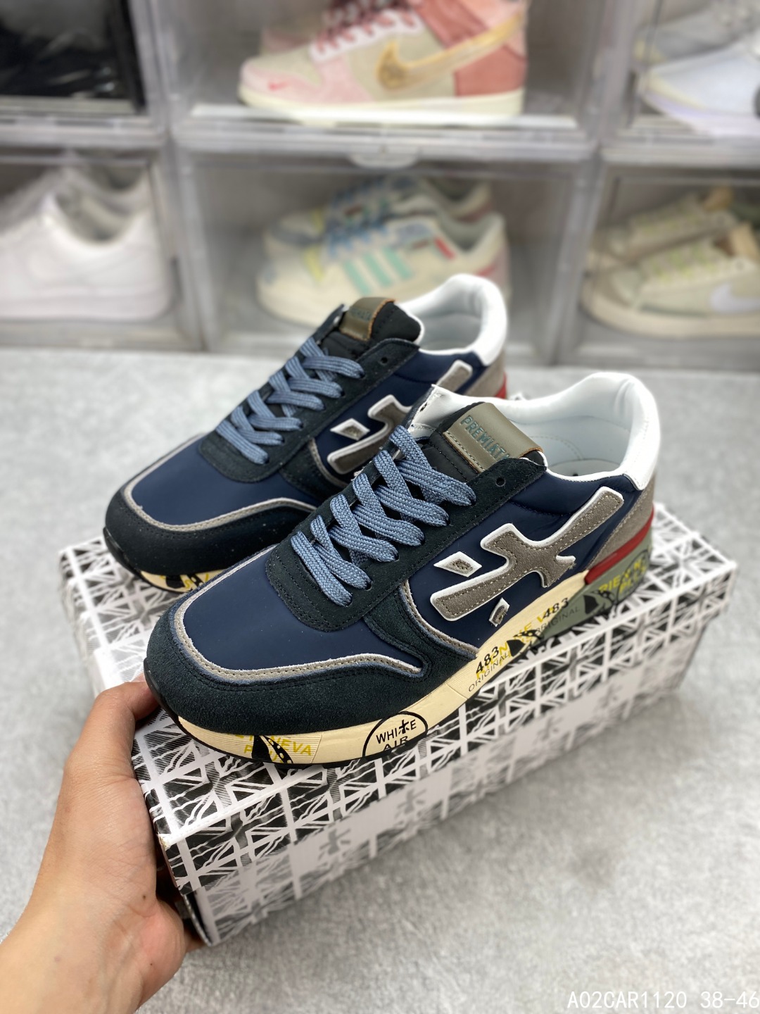 🈴️二 💰150 意大利鞋履品牌·普瑞米亚达 Premiata 低帮百搭休闲鞋 依据国际高标准制造 原单小白鞋 木字男鞋潮复古反绒皮运动休闲鞋木字鞋 鞋子简单大方 手感出众 舒适好穿又百搭 鞋子整体的外观颜值高 鞋面采用的是两种不同的材质面料拼接 鞋底侧边印了很多复古潮流印刷 是比较有个性特色的一款 鞋面材质是采用的牛反绒+牛津布+头层牛皮制作而成 鞋底材质是天然橡胶 大花纹设计防滑减震又耐磨 它的鞋垫都是头层猪皮 普瑞米亚达复古运动鞋真的又好看又好穿 很好搭配衣服 #A02CAR1120 38-46