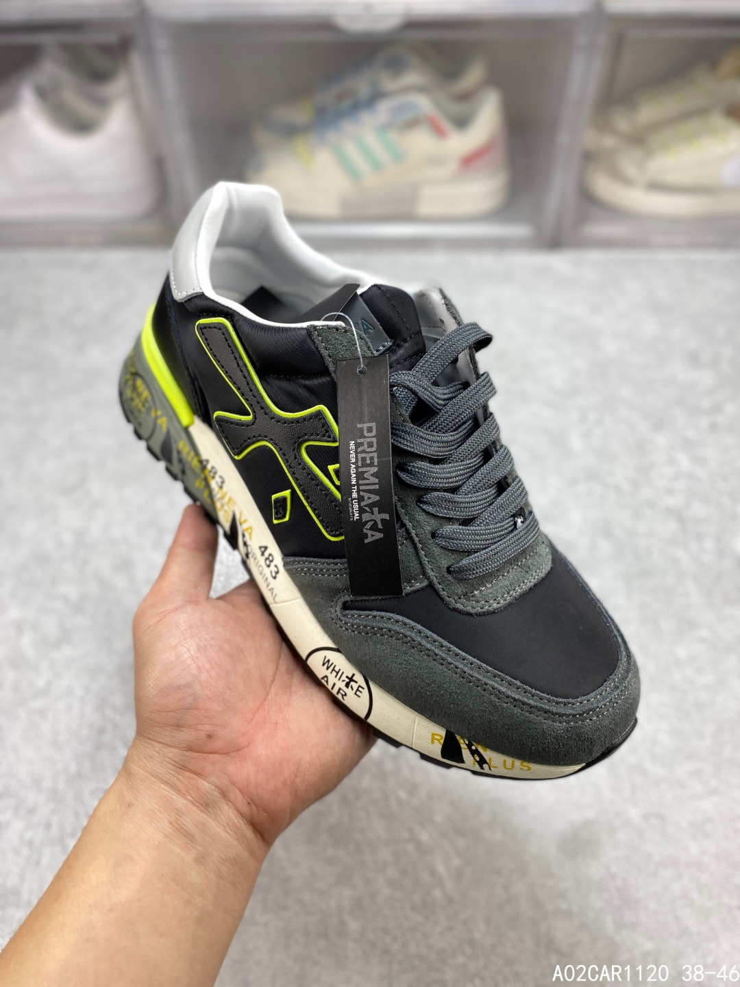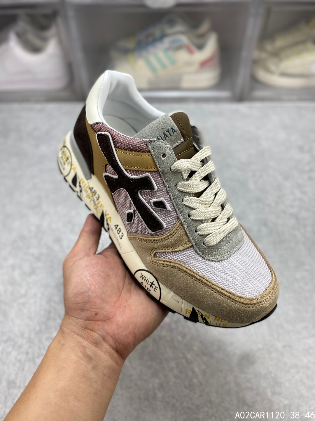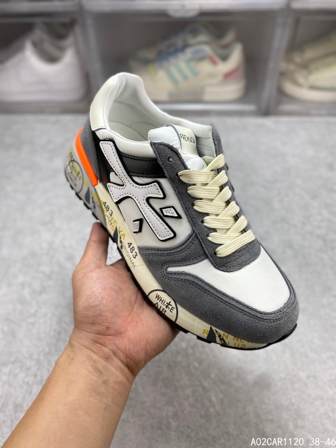 🈴️三 💰150 意大利鞋履品牌·普瑞米亚达 Premiata 低帮百搭休闲鞋 依据国际高标准制造 原单小白鞋 木字男鞋潮复古反绒皮运动休闲鞋木字鞋 鞋子简单大方 手感出众 舒适好穿又百搭 鞋子整体的外观颜值高 鞋面采用的是两种不同的材质面料拼接 鞋底侧边印了很多复古潮流印刷 是比较有个性特色的一款 鞋面材质是采用的牛反绒+牛津布+头层牛皮制作而成 鞋底材质是天然橡胶 大花纹设计防滑减震又耐磨 它的鞋垫都是头层猪皮 普瑞米亚达复古运动鞋真的又好看又好穿 很好搭配衣服 #A02CAR1120 38-46