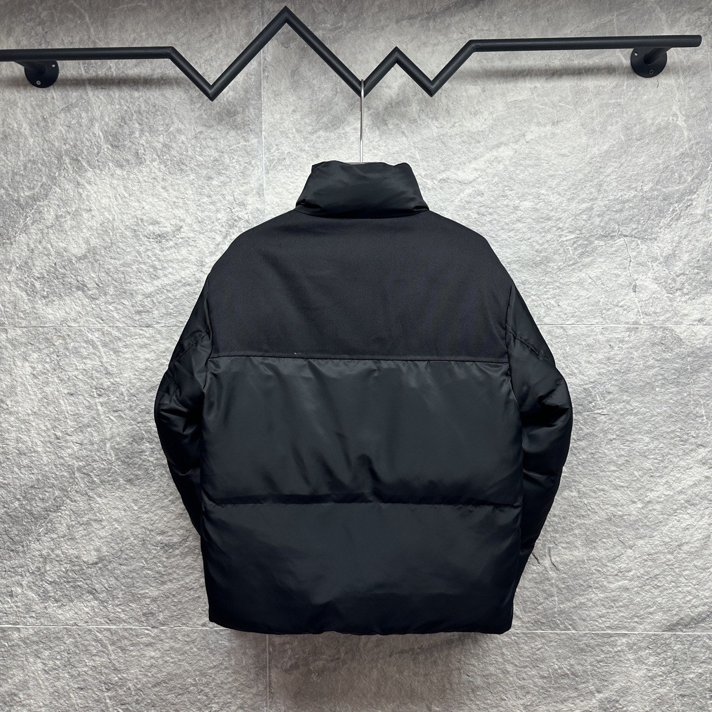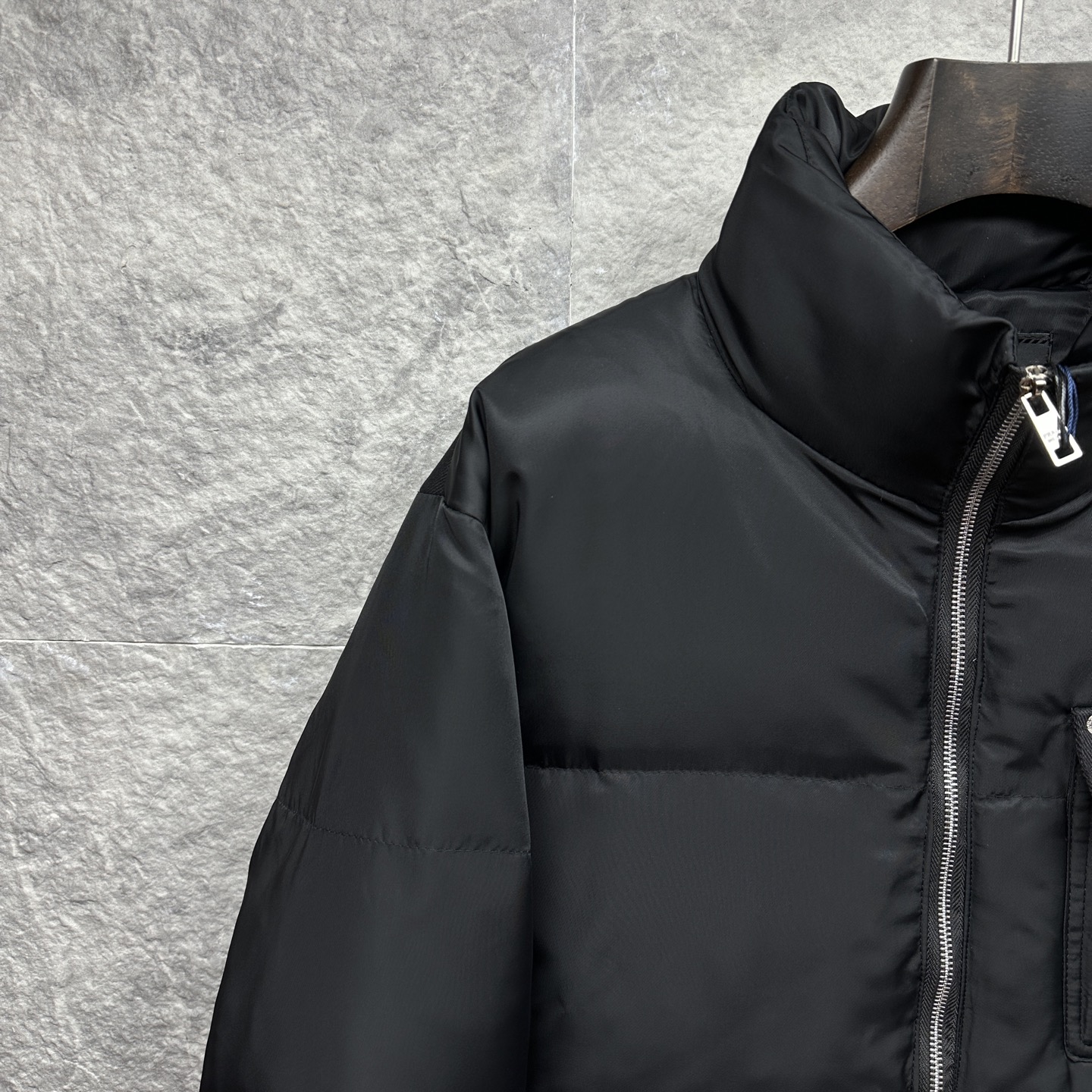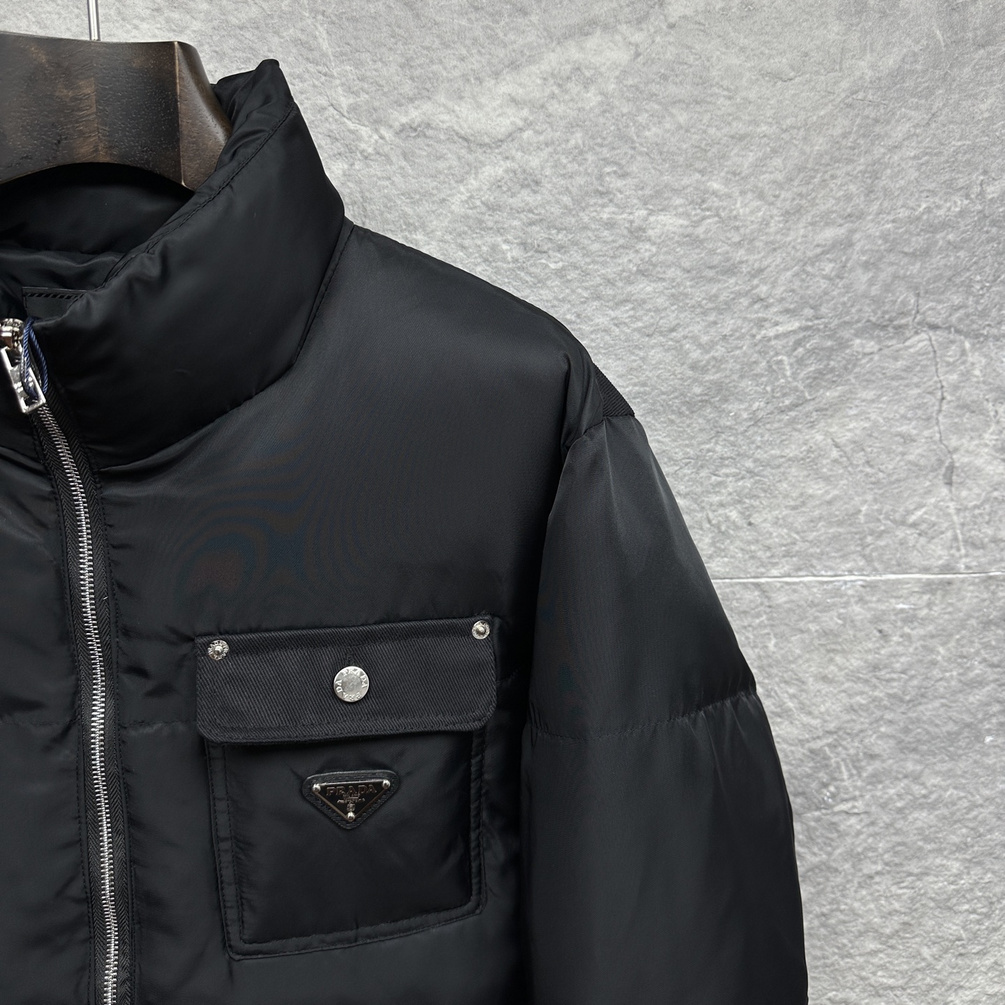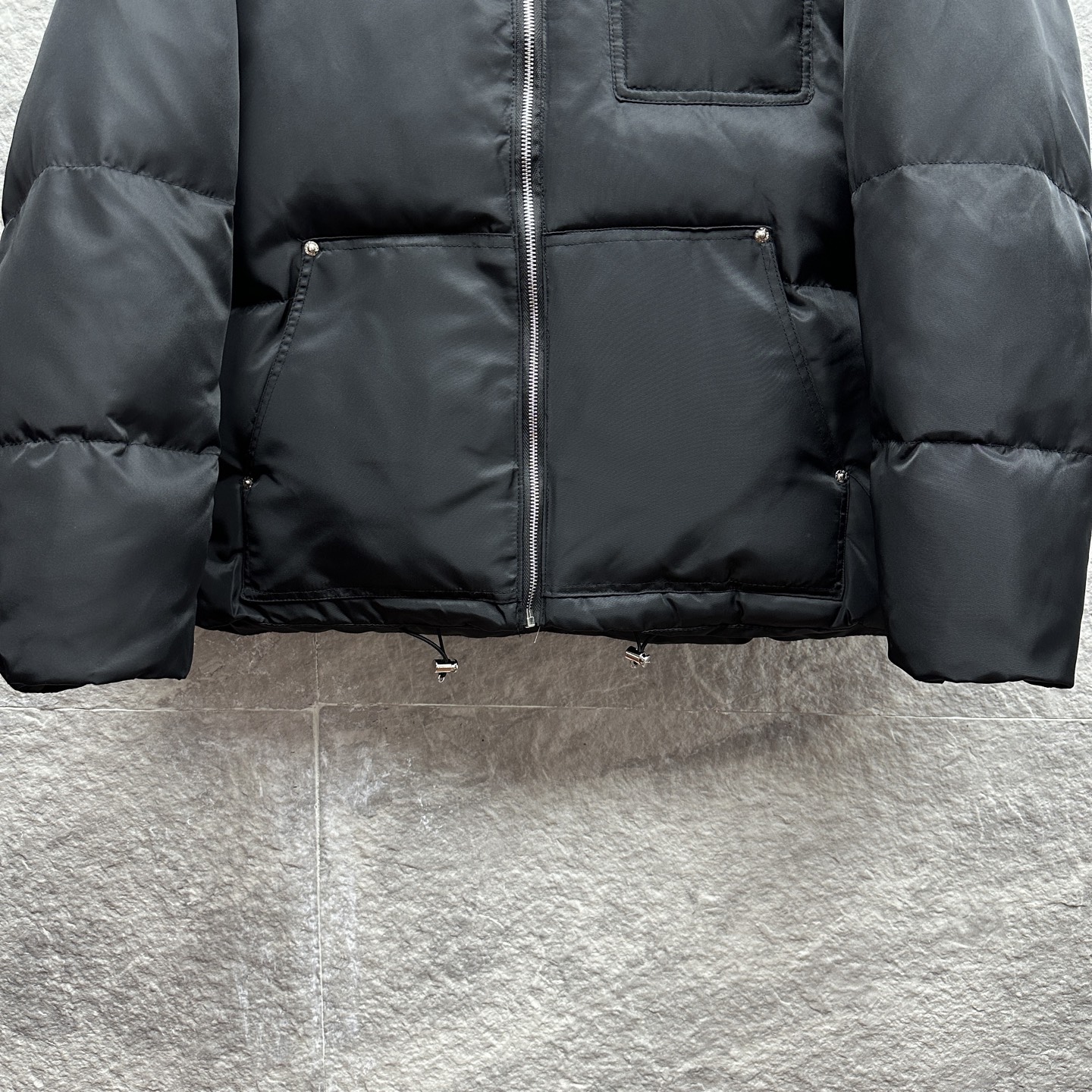 P410 普拉达2025新款胸章logo情侣款羽绒服 🍃高版本顶级品质🍃 90白鸭绒 真空填充 精湛工艺 涂层定制面料 漆面尼龙衬里 徽标字母压纹 双层内里 不跑绒 不钻绒 宽松版型遮肉显瘦 拒绝臃肿活力出街 超强实用性 上身效果自然休闲舒适~ 颜色:黑色 码数:M—3XL