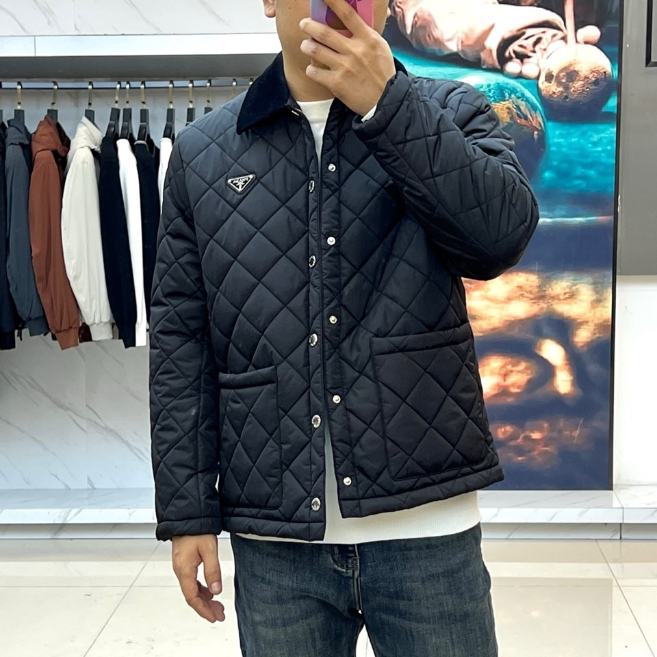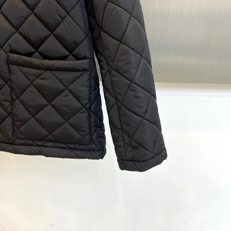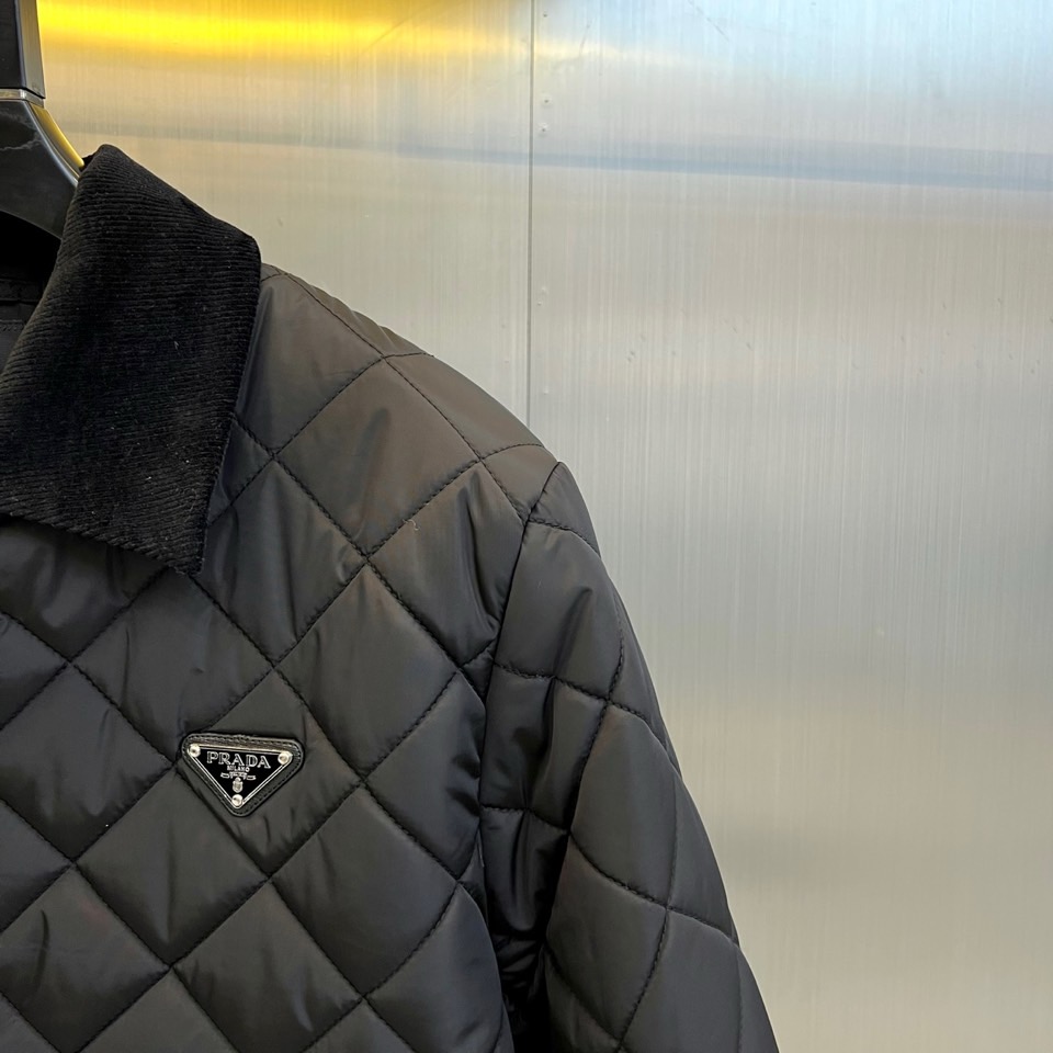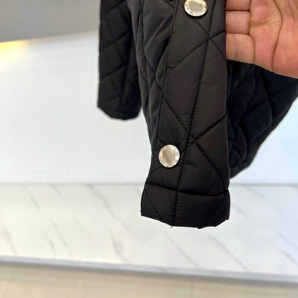 p430  Prad普拉达、2025秋冬新品棉服以经典菱格绗缝工艺重塑都市保暖美学。这款棉服采用立体翻领设计,内衬选用丝绒质感面料提升穿着舒适度。衣襟配备哑光金属按扣闭合系统,左侧胸口点缀标志性珐琅三角徽标,袖口采用罗纹收口设计防风保暖。填充高品质环保棉絮通过规整的菱形绗缝固定,既确保保暖性能又形成独特的立体纹理。