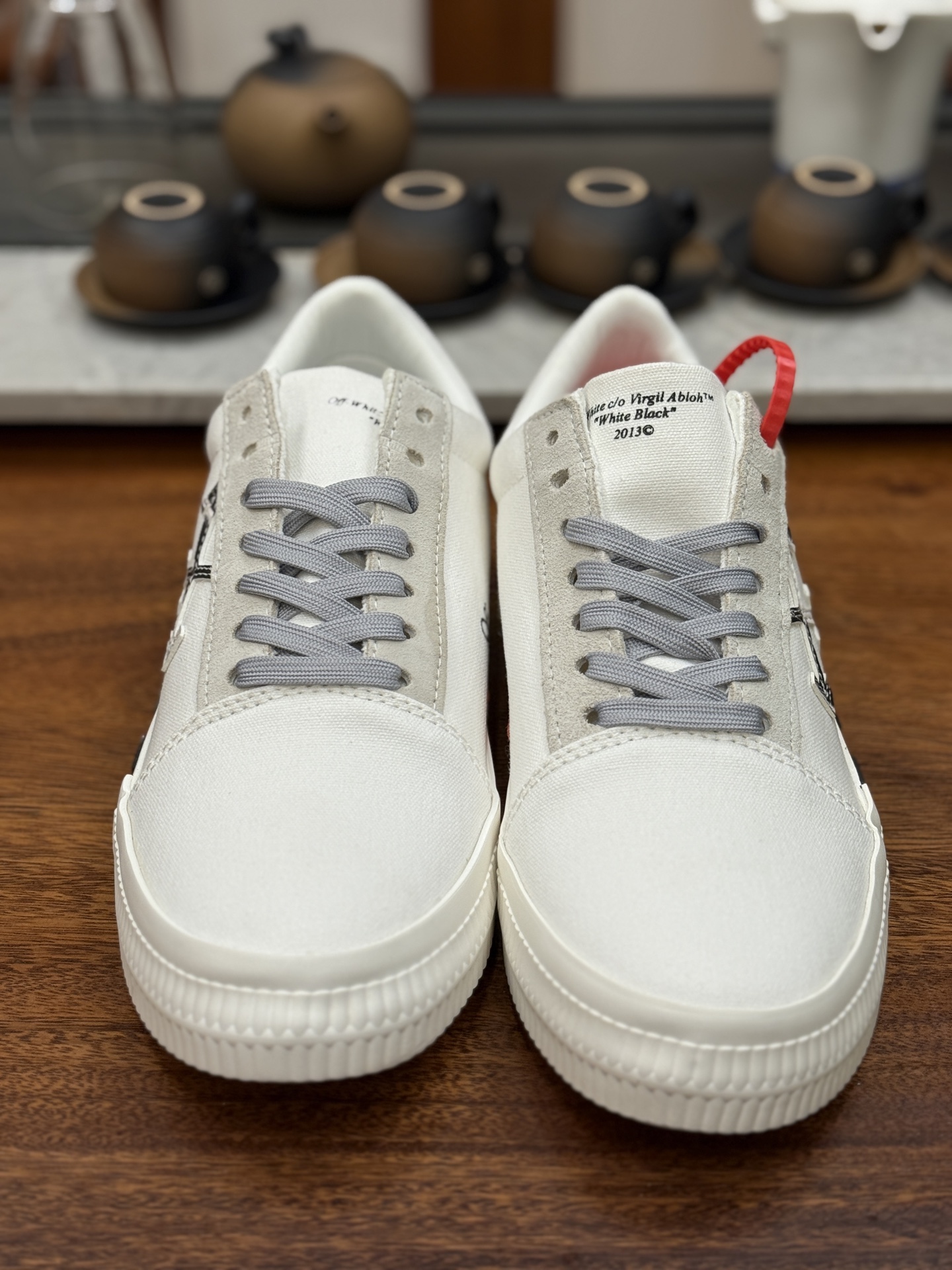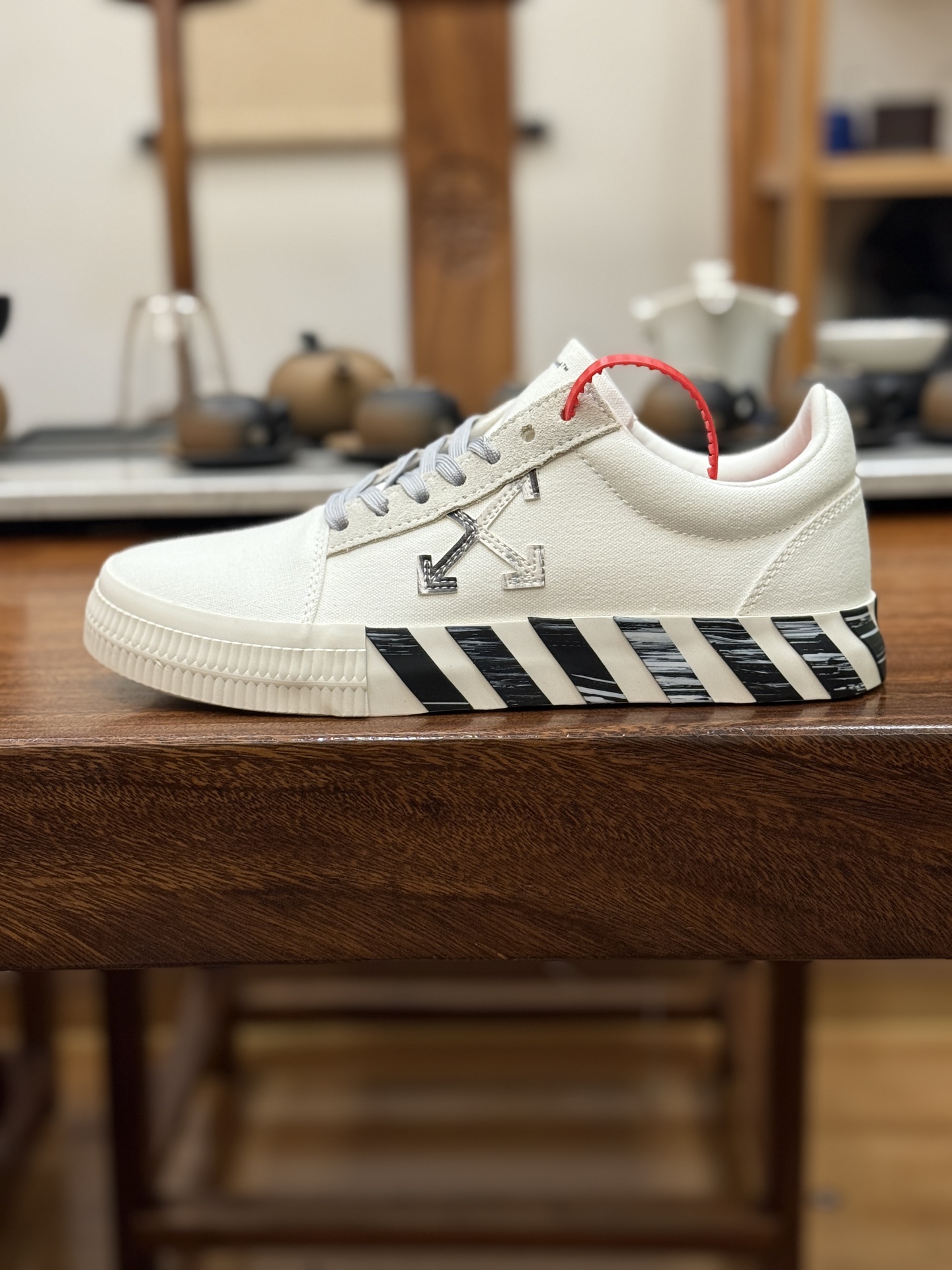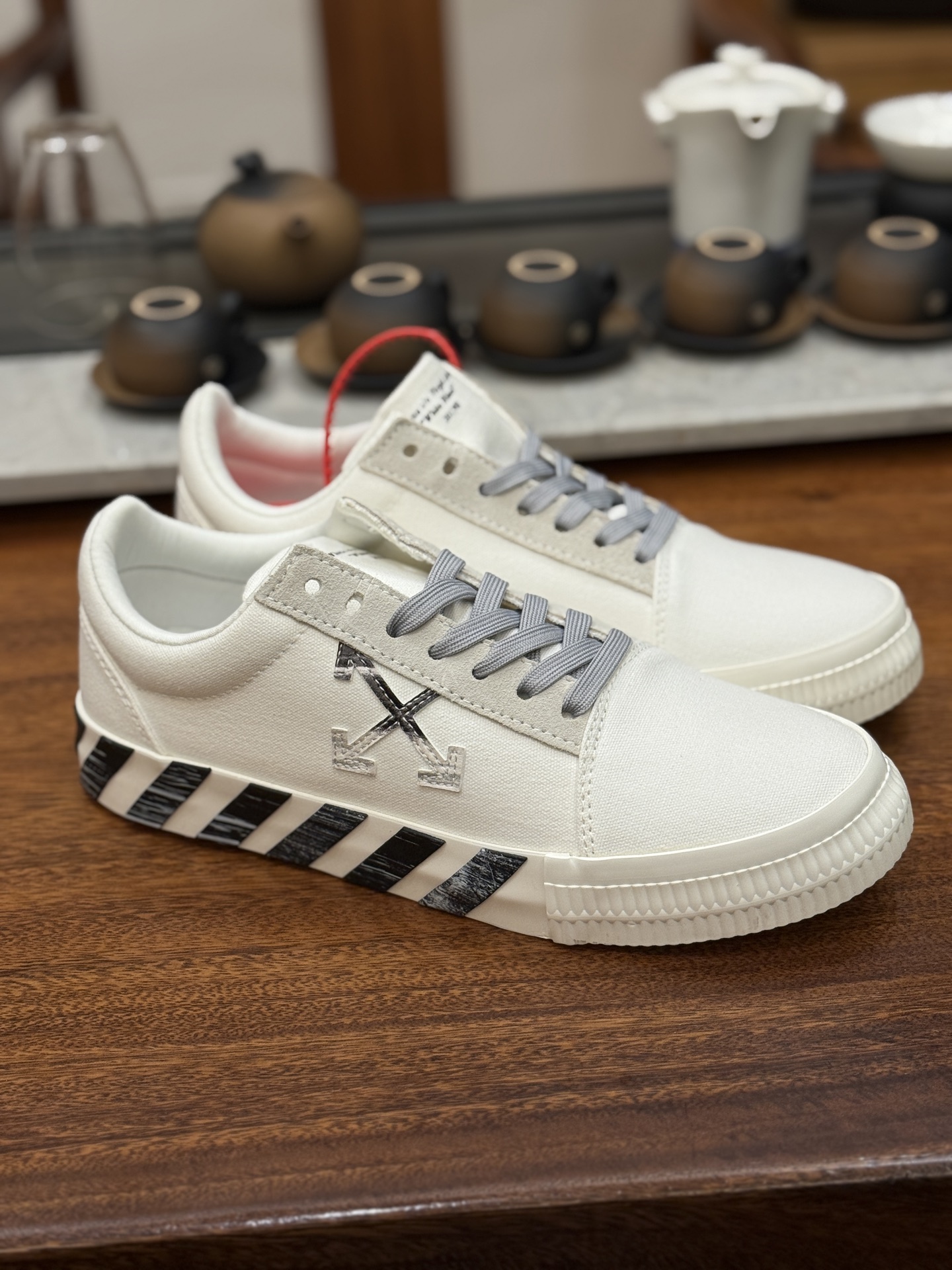 Off-White c/o Virgil Abloh Vulc Low Top 箭头低帮硫化帆布板鞋 尺码:36 37 38 39 40 41 42 43 44 45 46 47 Off-White 近日才发布其春夏新款鞋履,紧跟着就推出全新秋冬鞋款。此番带来的是一系列“ Off-Court ”运动鞋,其中除了基础的黑、白色 Vulc Low-Top 还有一双充满街头韵味的棋盘格元素,亮点其实在鞋内侧的橙色瓶贴以及鞋带头的橙色细节处理。该品牌标志性的箭头标志,防盗扣和鞋带的设计以及鞋后跟的字样也极具“THE TEN”系列的影子。