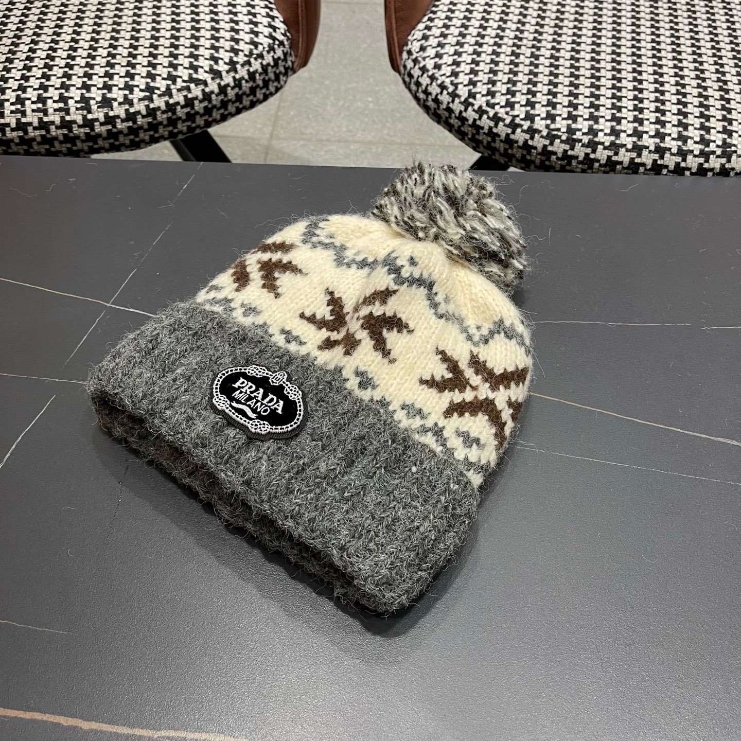 P115 普拉达 Prada 2025新款秋冬保暖复古提花毛线帽子女费尔岛可爱毛球针织帽包头帽