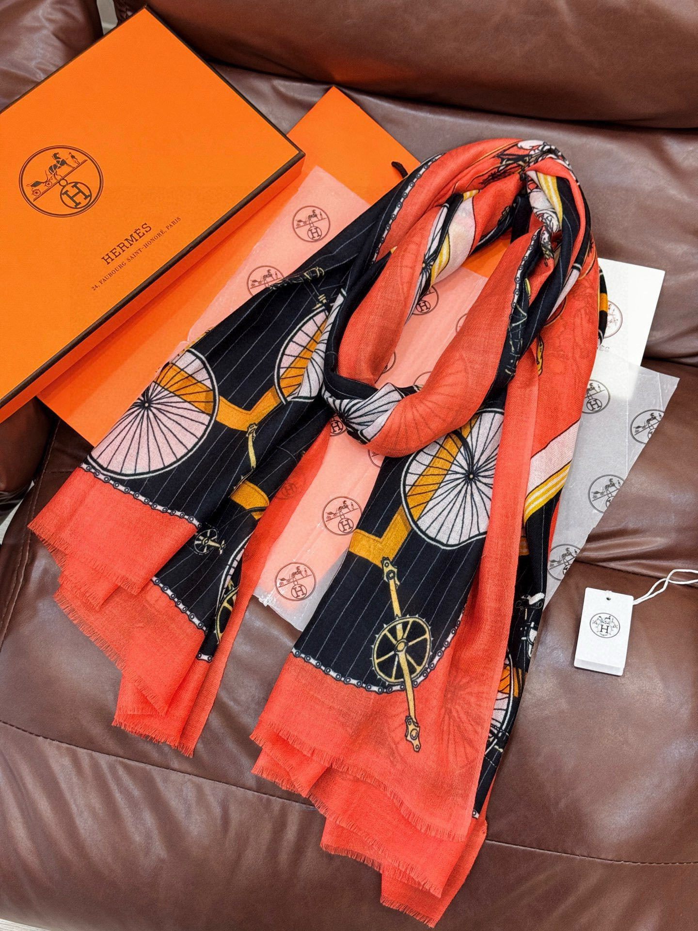 P195 羊绒新款 🆕🆕🌈💫速度‼️下手一定要快‼️H家新款【自行车长巾】,高端 大爱 货极少 现在用极好‼️真心美的让人非常非常心动 上身效果简直美翻了 品质非常完美👍‼️ 】整个围巾给人大牌气场的同时又非常精致秀丽💟绝对值得入手的新款💟‼️ 实物一拿到就会庆幸自己是女人的绝美好货😂 值得品鉴‼️完美气质品味Ditails首选👍🌟尺寸:110*200cm 100%顶极羊绒👑