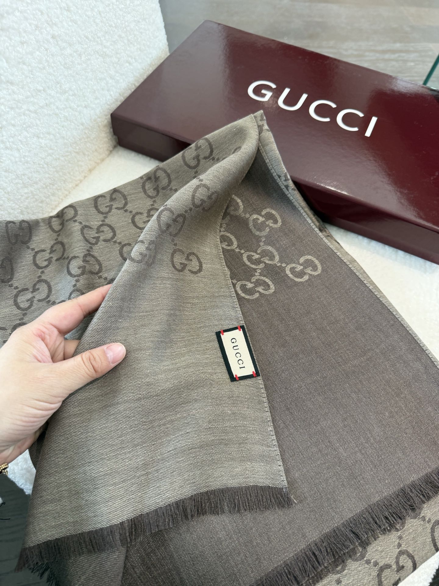P170 P重磅‼️Gucci经典披肩款,大尺寸G专柜的常青树款。品质极好的,❗️经典双G提花图案风靡了全世界❗️女人的衣柜里面绝对不能少的一件单品,但是你千万别拿某宝廉价的货色来磕碜自己❗️既然选择这种经典披肩,你就一定选择有灵魂的东西❗️精工高密度字体无比清晰 面料为最顶级高原开司米尔羊毛真丝(和专柜一样) 手感柔软丝滑 奢华有质感!这款披肩将真丝与羊毛相混搭,质地柔软而温暖,经典而永不过时。❗️70x200cm!.