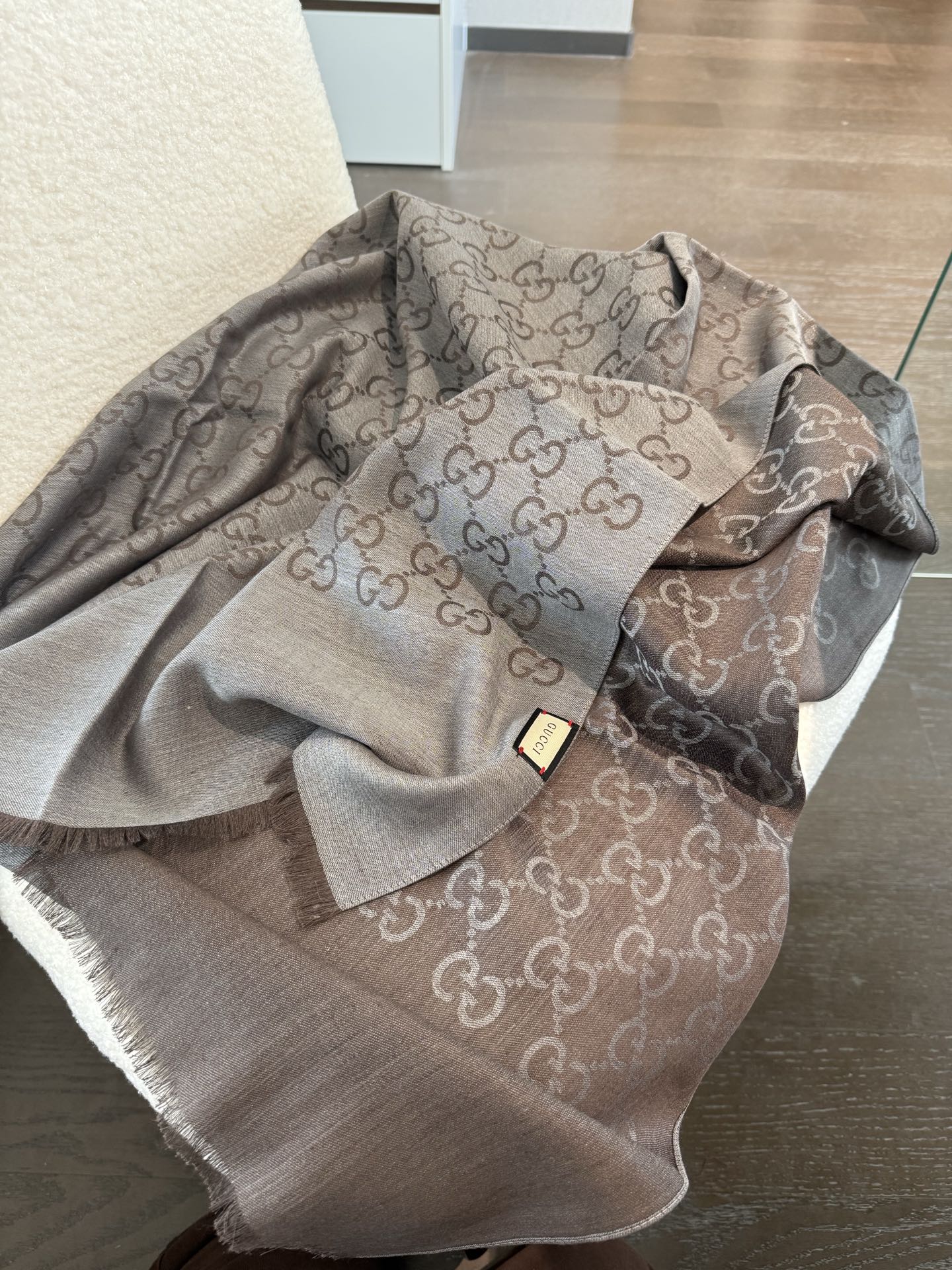 P170 P重磅‼️Gucci经典披肩款,大尺寸G专柜的常青树款。品质极好的,❗️经典双G提花图案风靡了全世界❗️女人的衣柜里面绝对不能少的一件单品,但是你千万别拿某宝廉价的货色来磕碜自己❗️既然选择这种经典披肩,你就一定选择有灵魂的东西❗️精工高密度字体无比清晰 面料为最顶级高原开司米尔羊毛真丝(和专柜一样) 手感柔软丝滑 奢华有质感!这款披肩将真丝与羊毛相混搭,质地柔软而温暖,经典而永不过时。❗️70x200cm!.