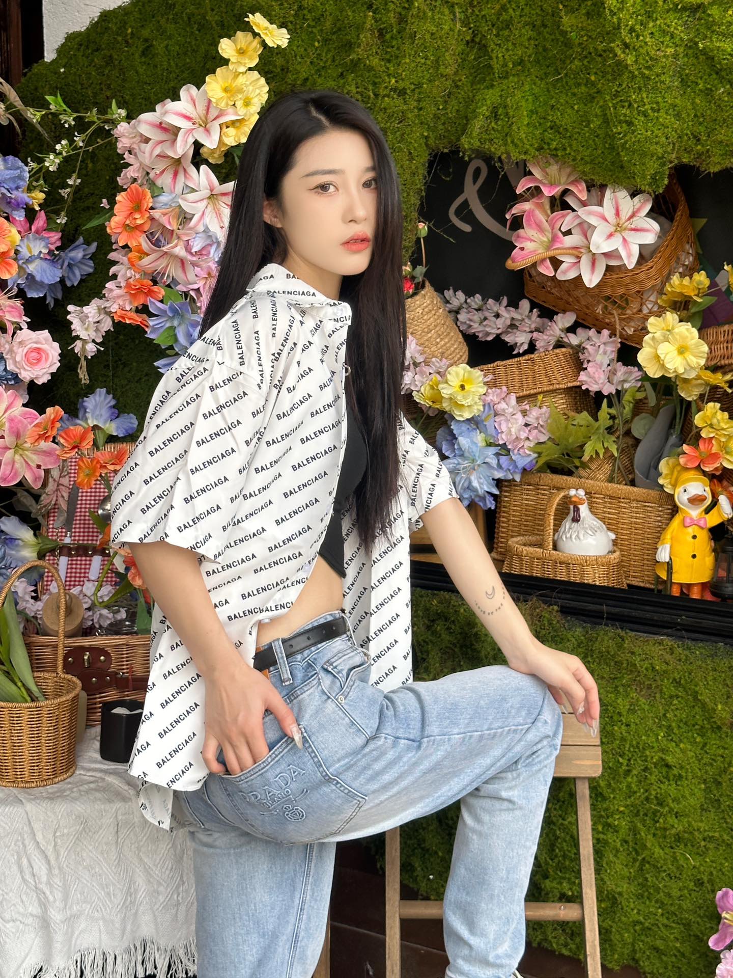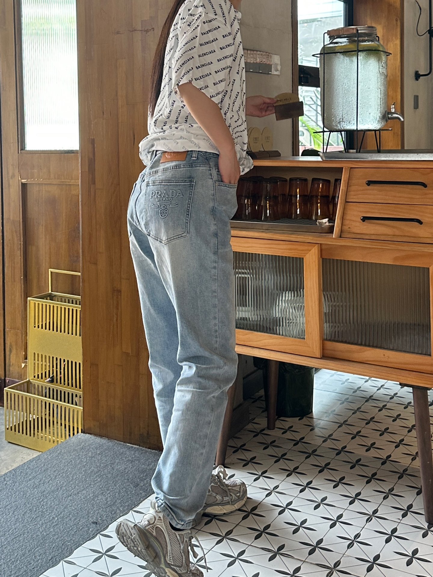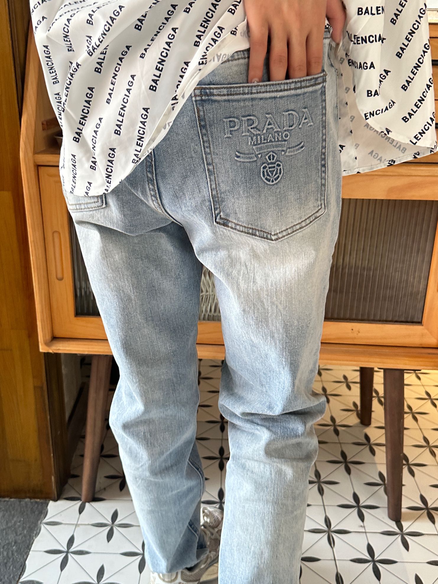 Prada/普拉达 后袋经典徽标logo压花水洗牛仔裤 上身效果#