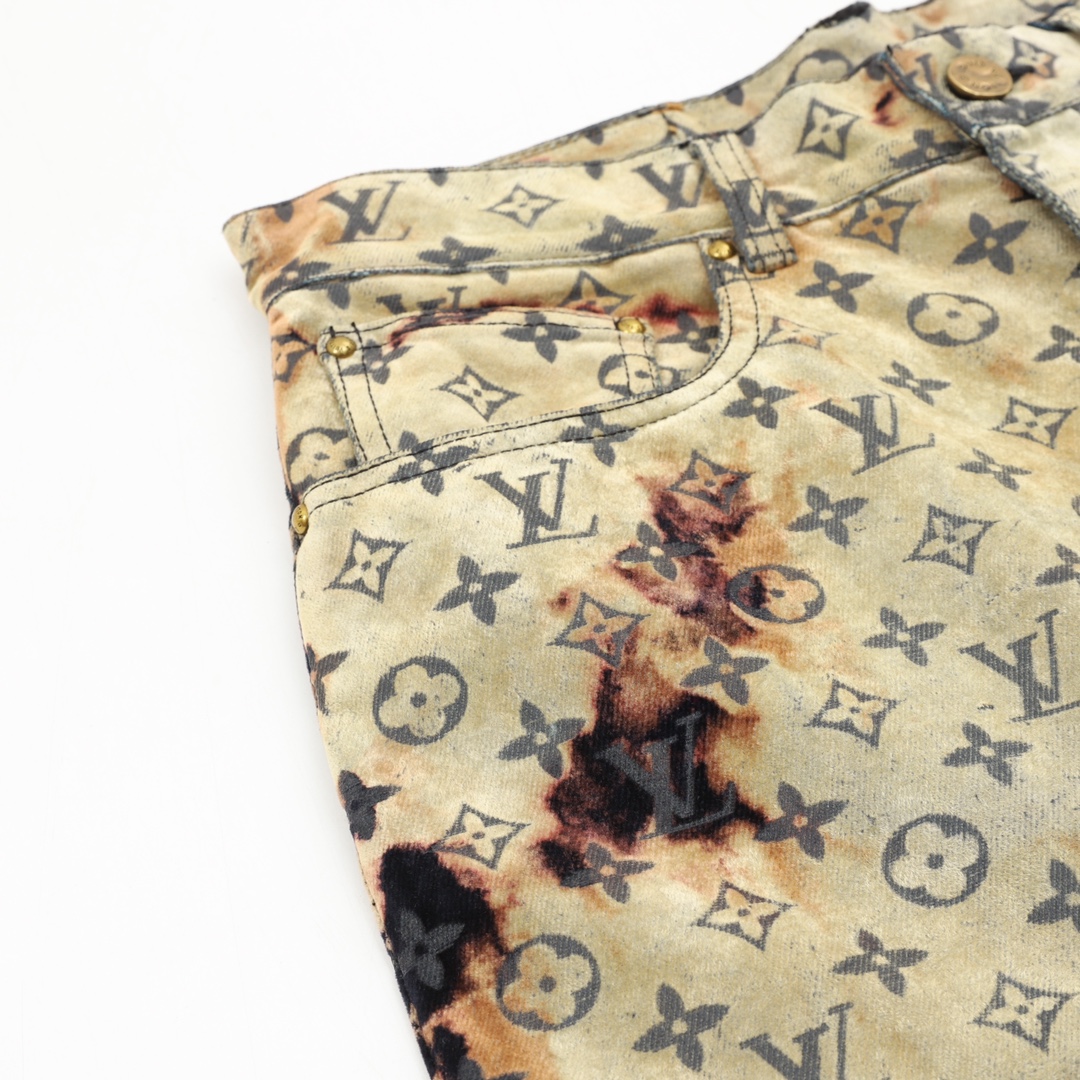 :💰480 Louis Vuitton路易威登24SS 篝火植绒牛仔长裤 原28,000购入,采用斜纹织法的提花植绒单宁布,质地厚实斜纹的肌理感、纹路清晰经过适当处理。面料制作定染色纺纱线进行植绒,全幅经典老花图案。整片红外线激光定位裁剪后成衣,纯手工剪裁大身对花对位,裁片对花位剪裁定位复合,全幅横纹粗线单针刺绣固定。从腰头、裤袋、口袋都做到高定缝纫对花标准,多工艺流程独家开发定制,面料损耗巨大。每一件都是由洗水经验丰富的师傅,用纱布蘸取丙烯颜料涂鸦按原样定位方式均匀手工涂抹在植绒表面,控制染色时间,次品报废率极高,每件大货呈现出独一无二的火烧云效果。 Size:30-36